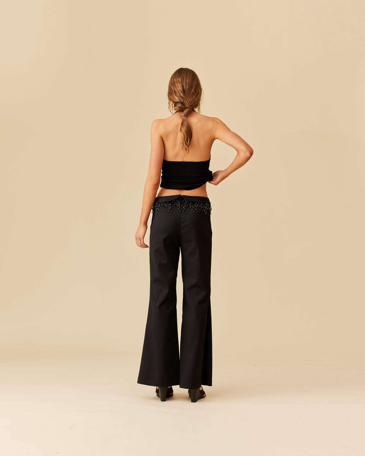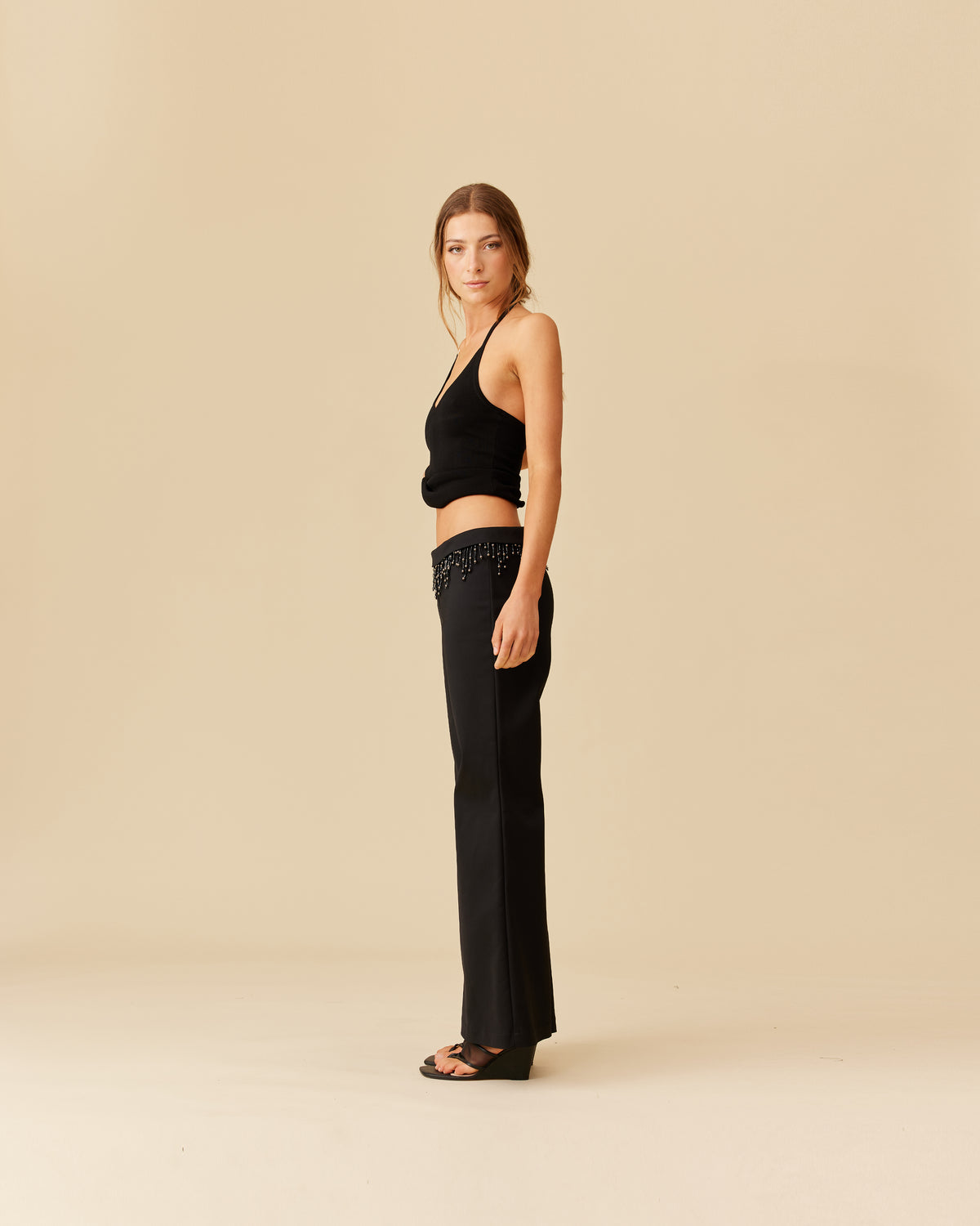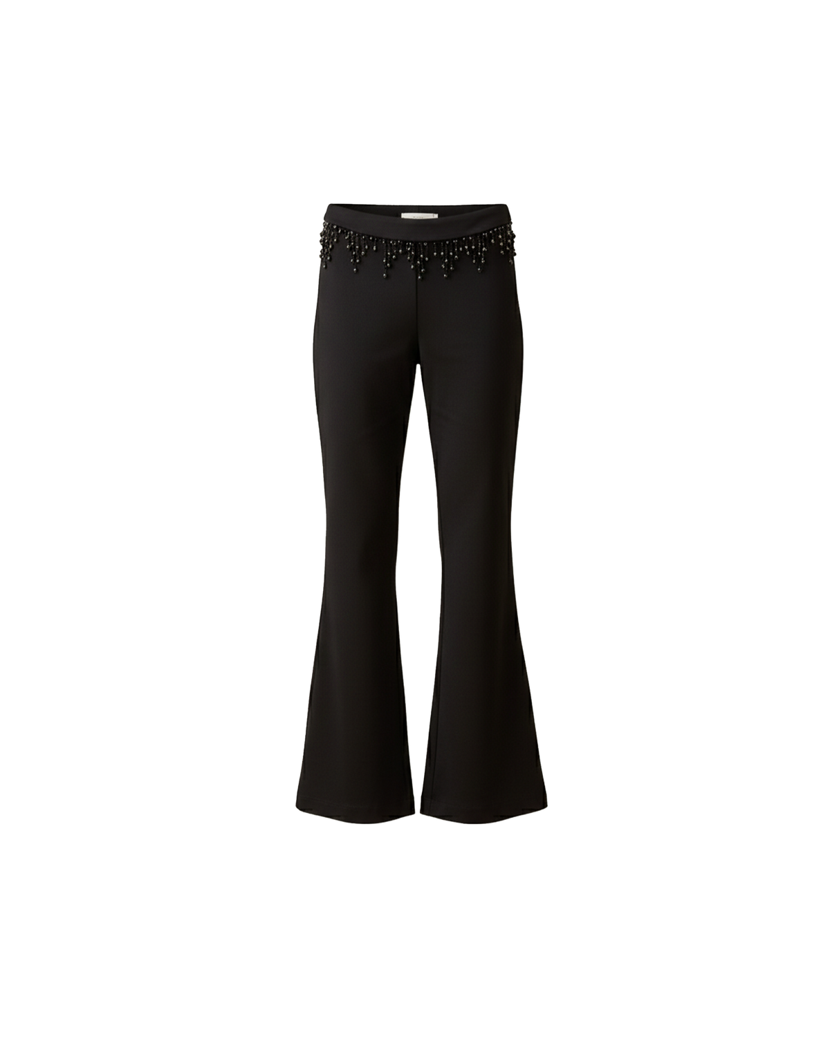 Slim fit pant with a fold over waist detail that is edged with beaded tassels. This pant has a soft flare from the knee, and is made from a luxe stretch material.