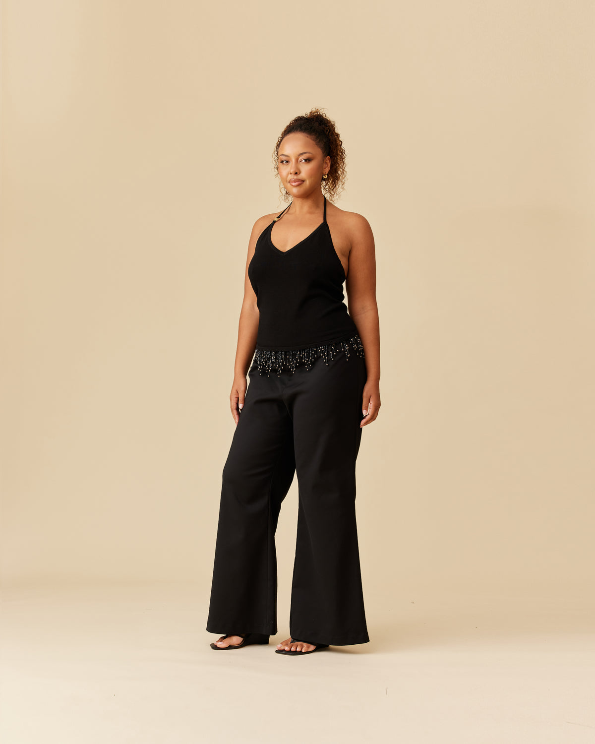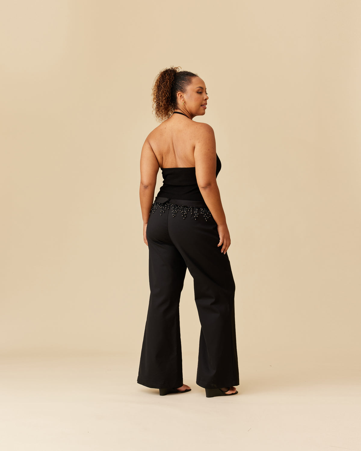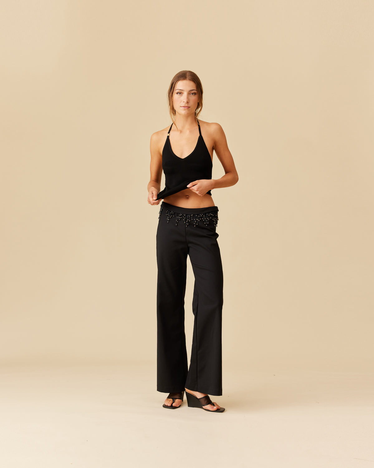 Slim fit pant with a fold over waist detail that is edged with beaded tassels. This pant has a soft flare from the knee, and is made from a luxe stretch material.