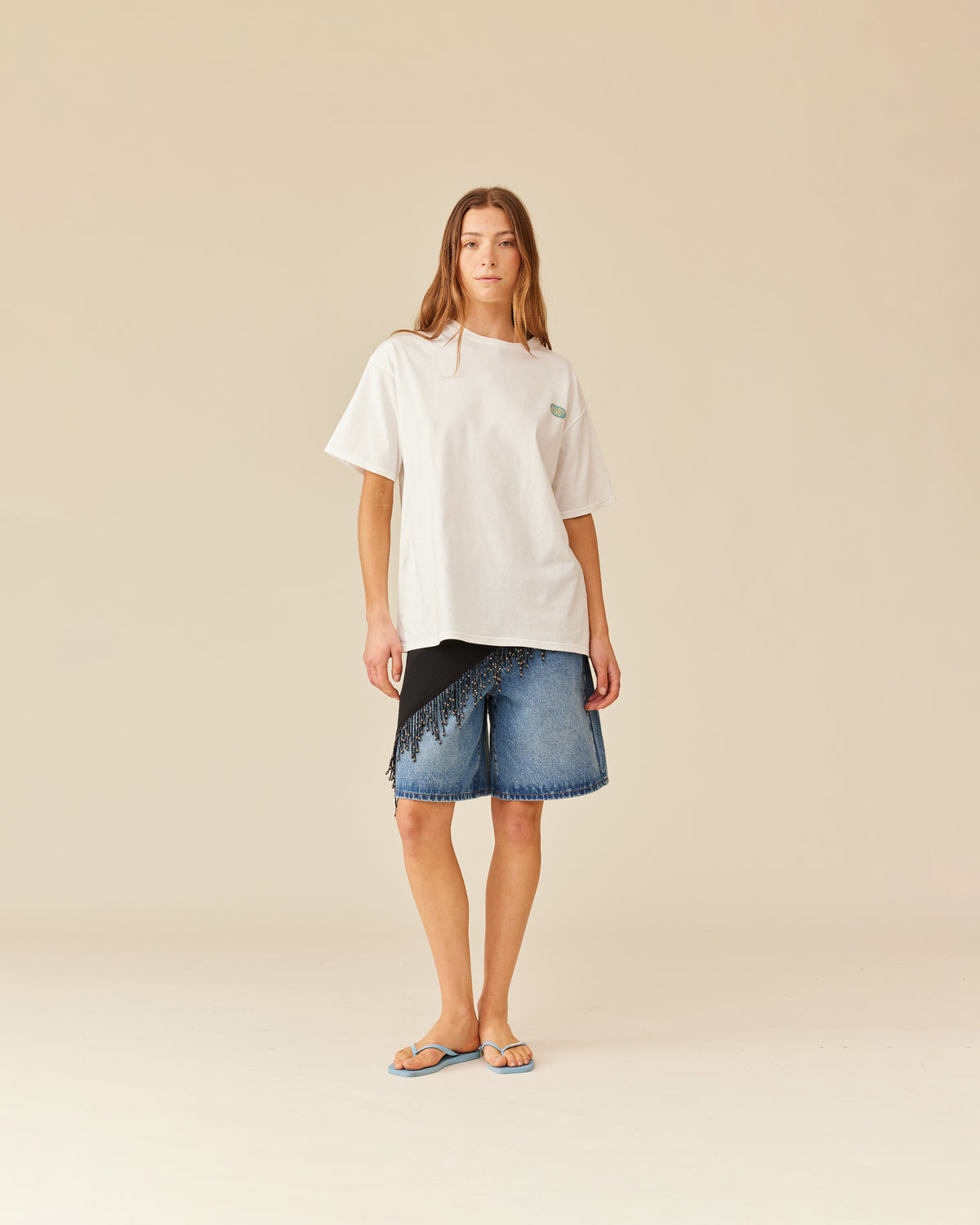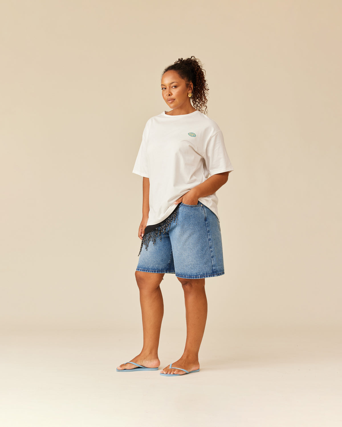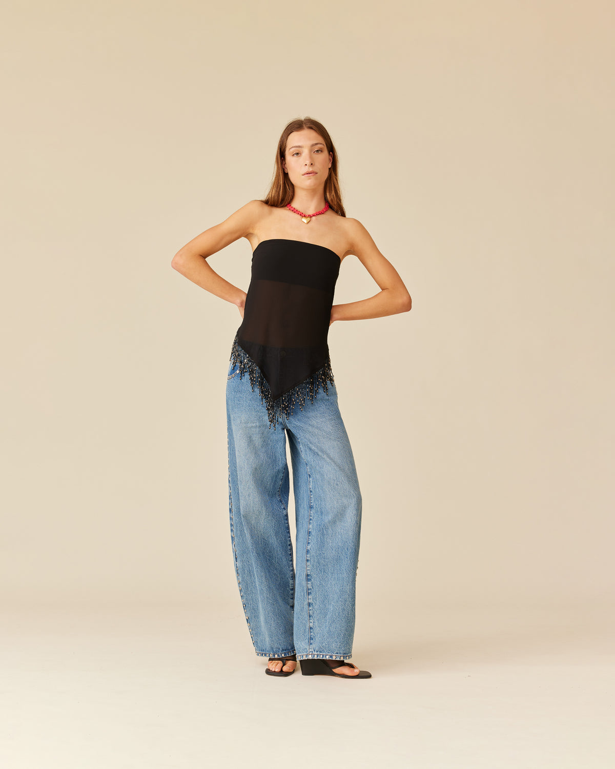 Sheer chiffon scarf designed with feature beaded tassels along 2 sides. This piece is perfect for summer styling as you can wear it multiple ways; around your waist as a wrap layer over shorts and pants, as a sarong, styled as a headscarf or try tying it as a bandeau top.