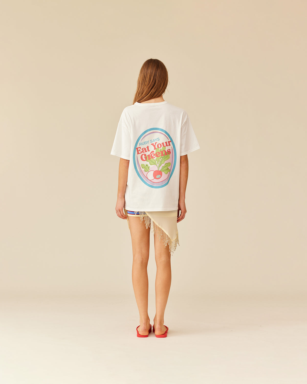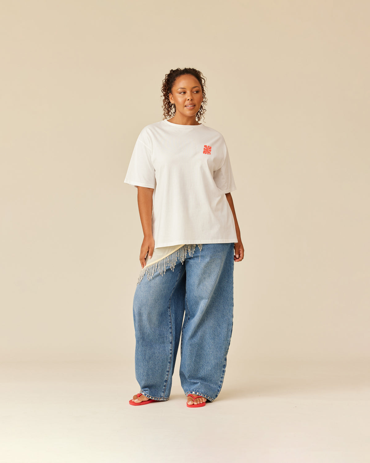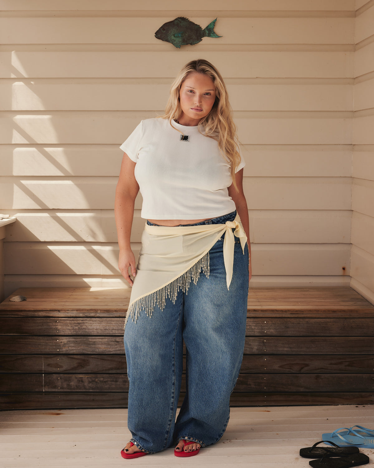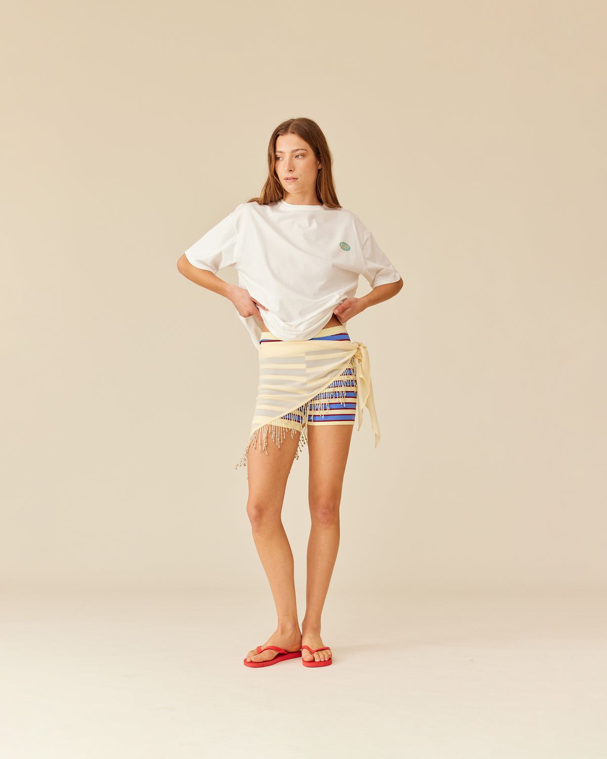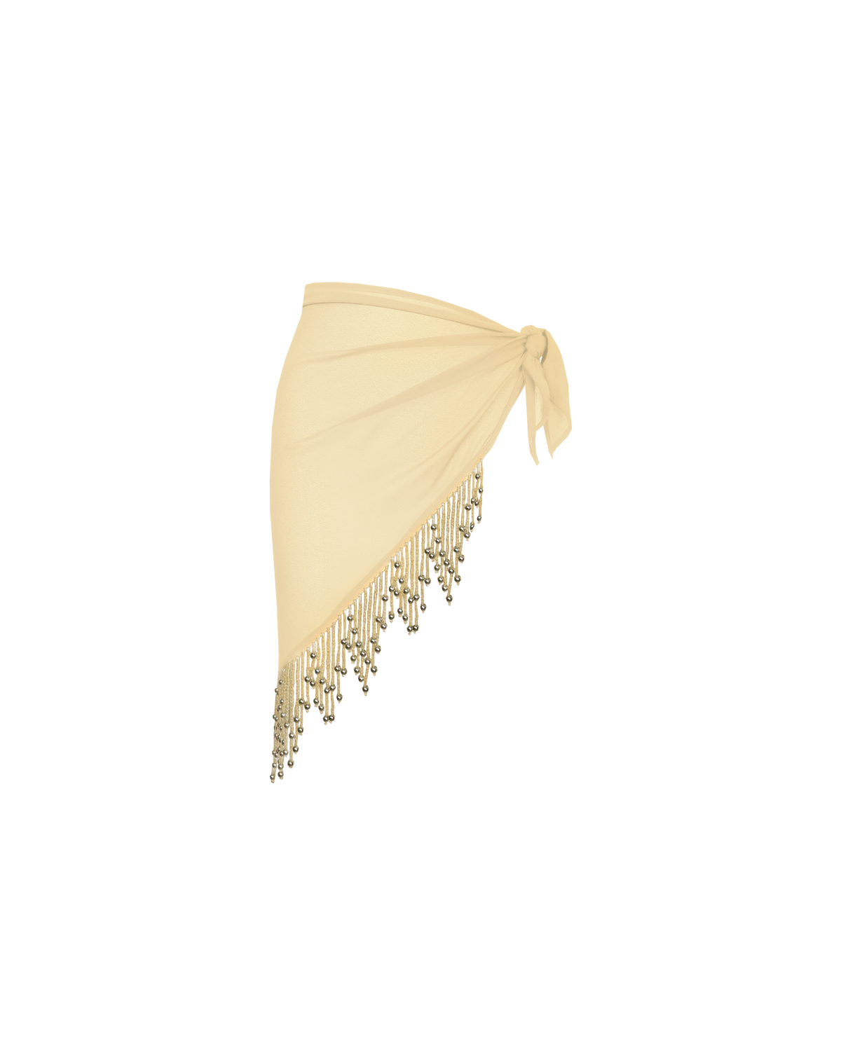 Sheer chiffon scarf designed with feature beaded tassels along 2 sides. This piece is perfect for summer styling as you can wear it multiple ways; around your waist as a wrap layer over shorts and pants, as a sarong, styled as a headscarf or try tying it as a bandeau top.