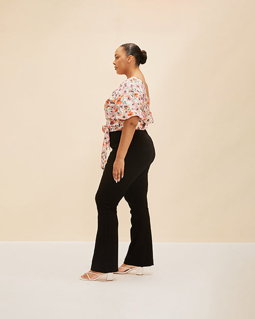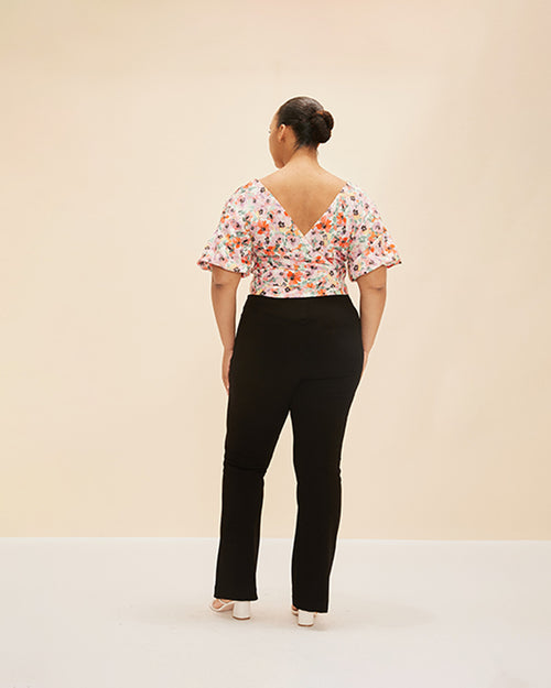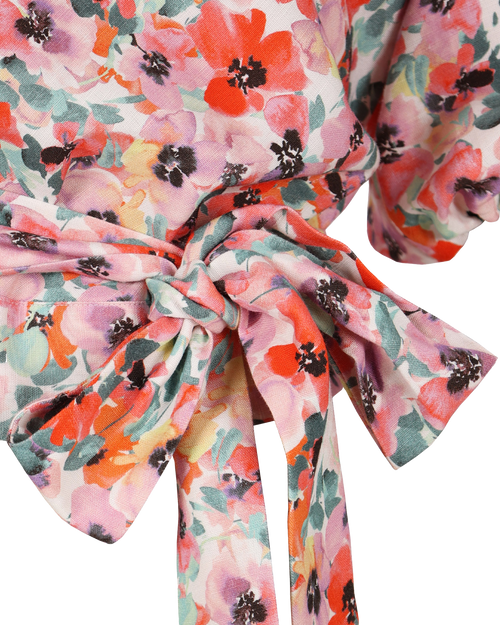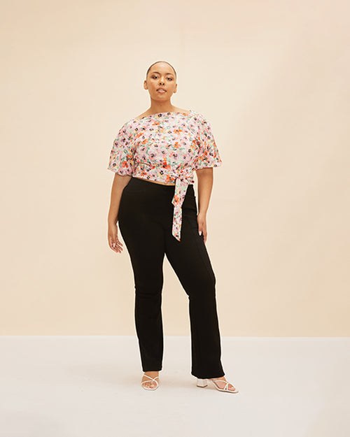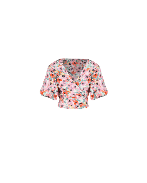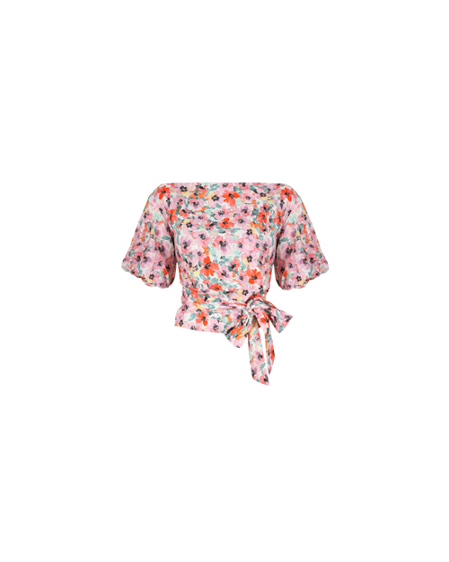 Cross-back wrap blouse with a draped neckline crafted our RUBY pansy floral. The relaxed silhouette makes a statement with its tie feature and V-shaped back neck. This top can also be worn tied at the front.