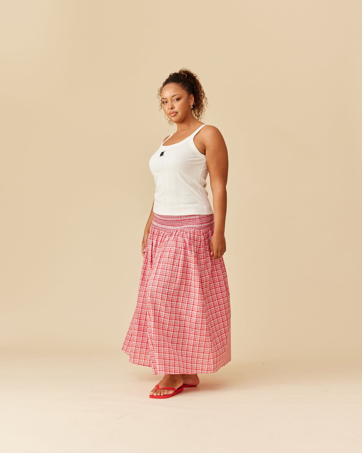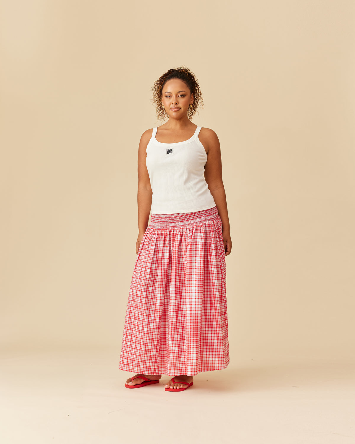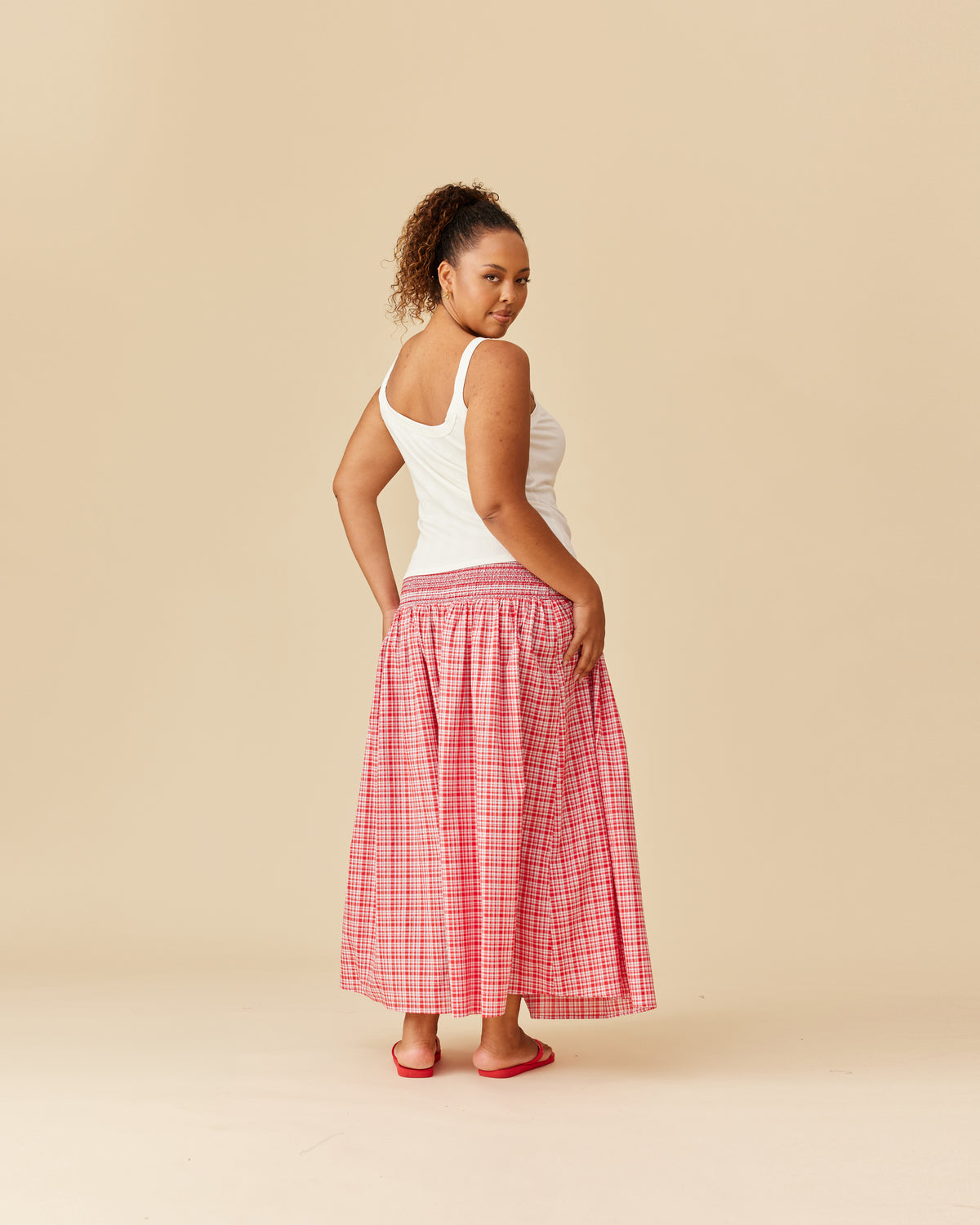 Cotton maxi skirt designed in a vibrant red tartan, with shirred waist and hip, that falls to a floaty, full skirt. This skirt can be worn as a pop of colour paired with a neutral top, or make it a set by pairing this skirt with our Anastasia Tank.