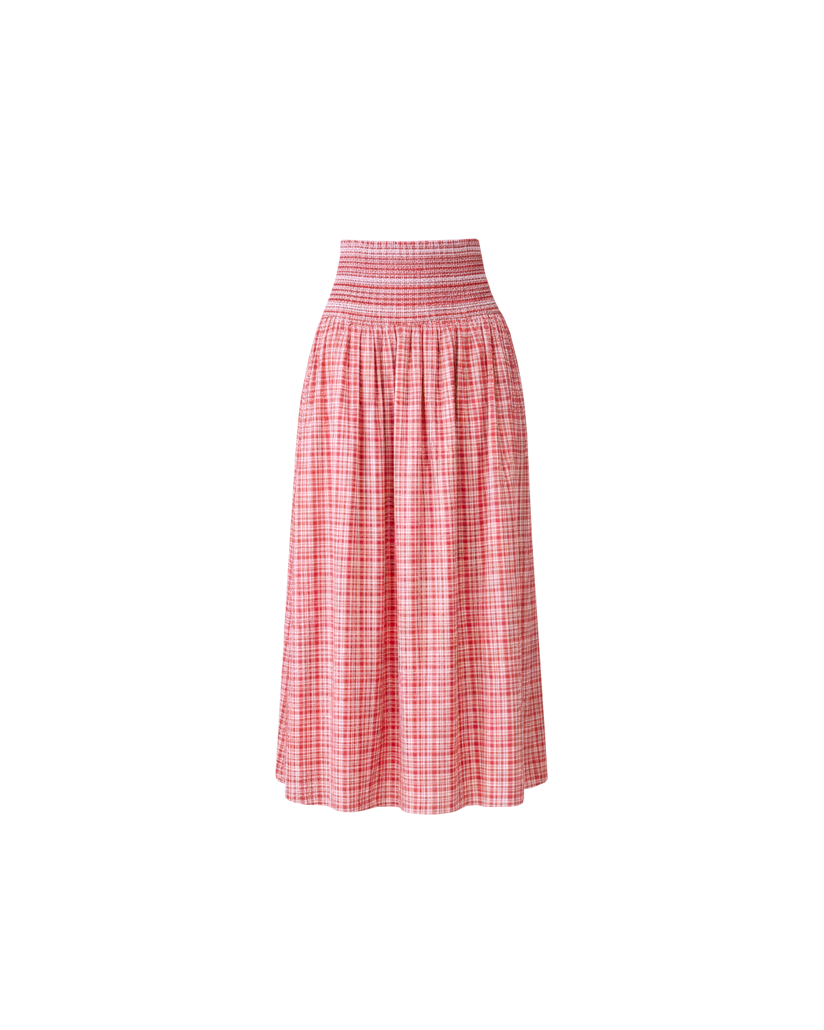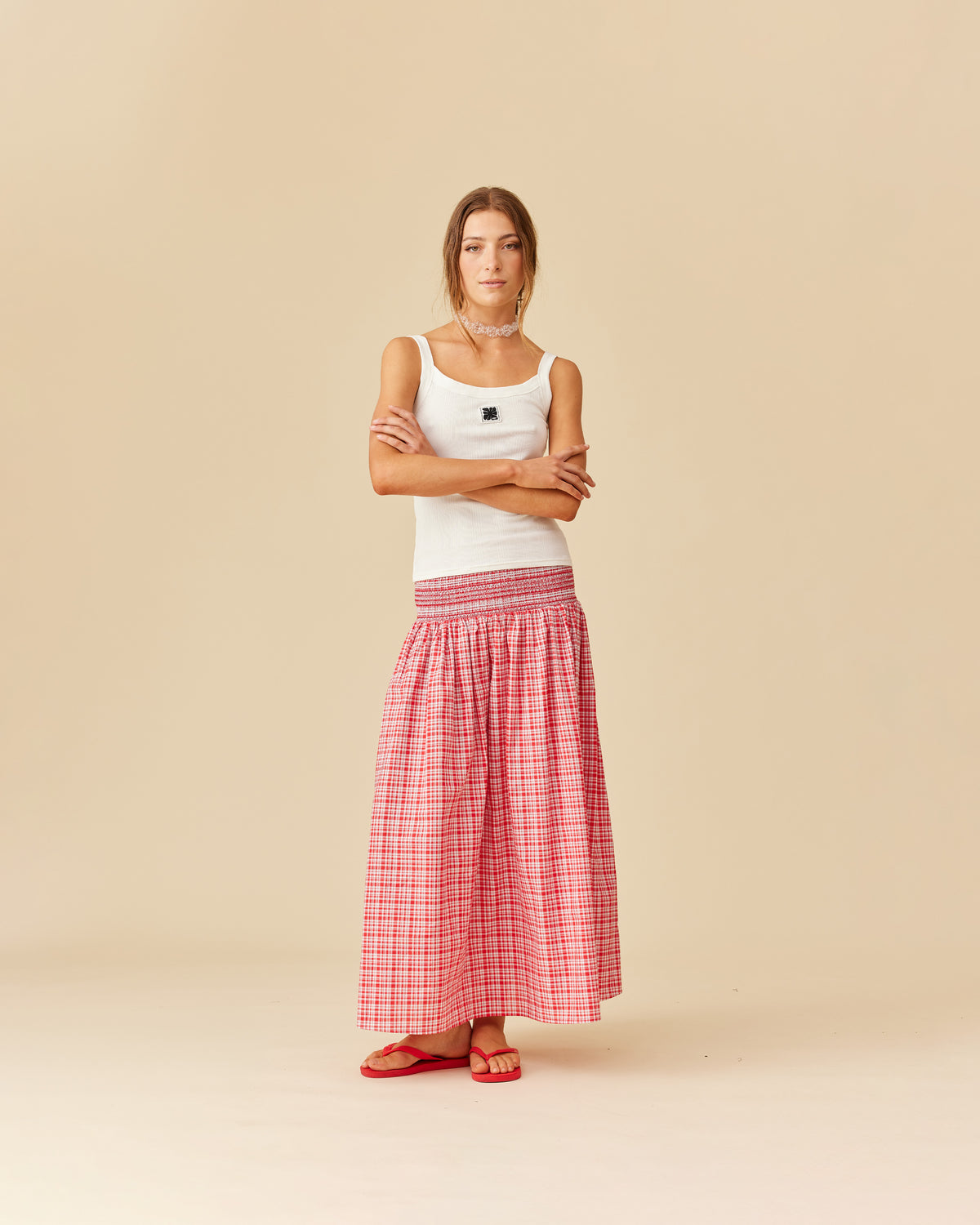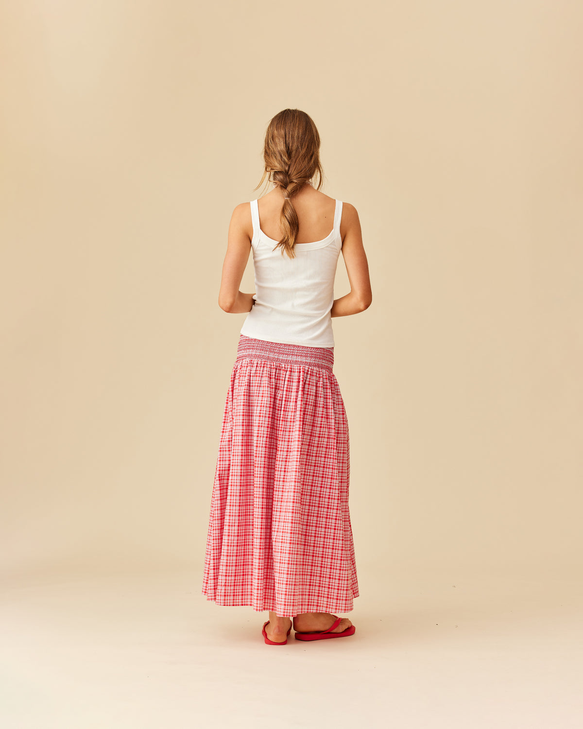 Cotton maxi skirt designed in a vibrant red tartan, with shirred waist and hip, that falls to a floaty, full skirt. This skirt can be worn as a pop of colour paired with a neutral top, or make it a set by pairing this skirt with our Anastasia Tank.