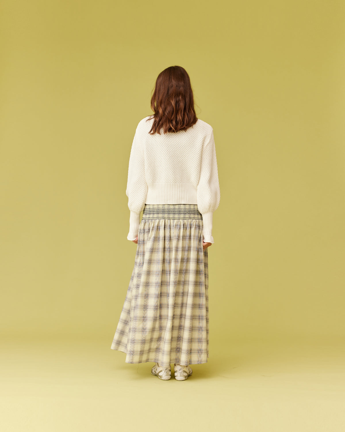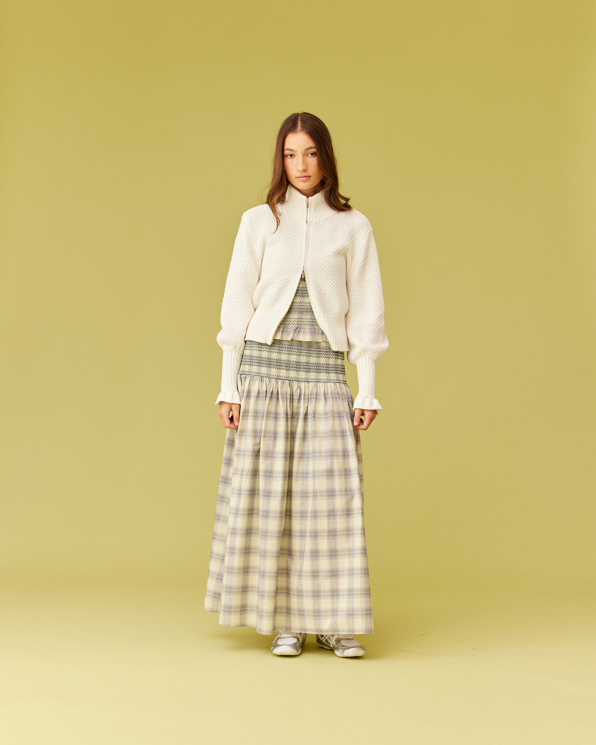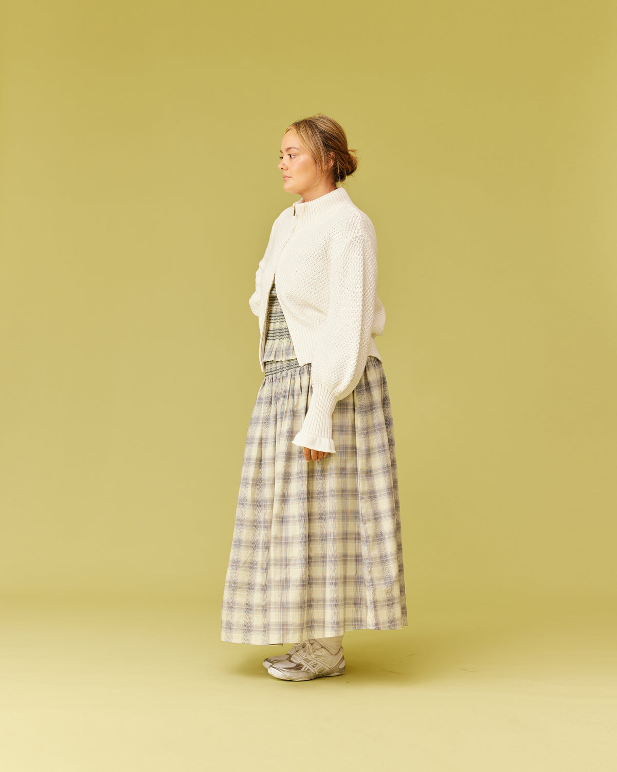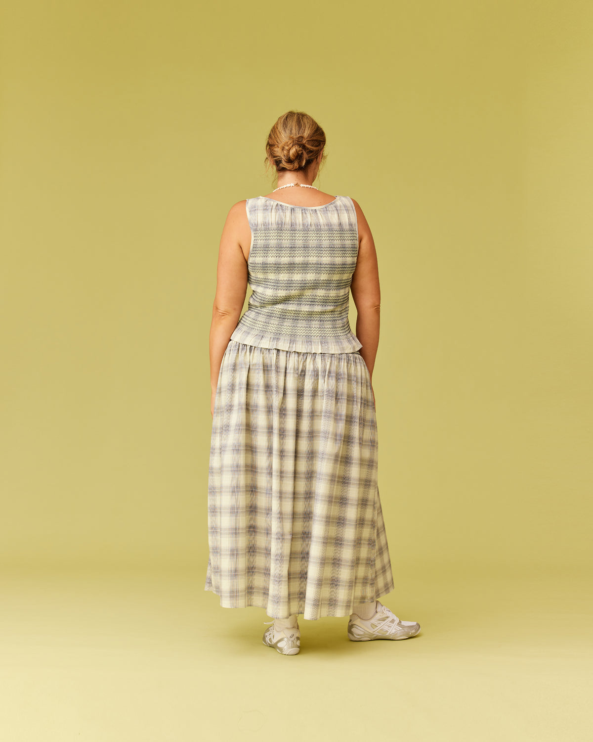 Cotton maxi skirt designed in a beautiful sage tartan, with a shirred waist and hip that falls to a floaty, full skirt. This skirt can be worn as a pop of colour paired with a neutral top, or make it a set by pairing this skirt with our Anastasia Tank.