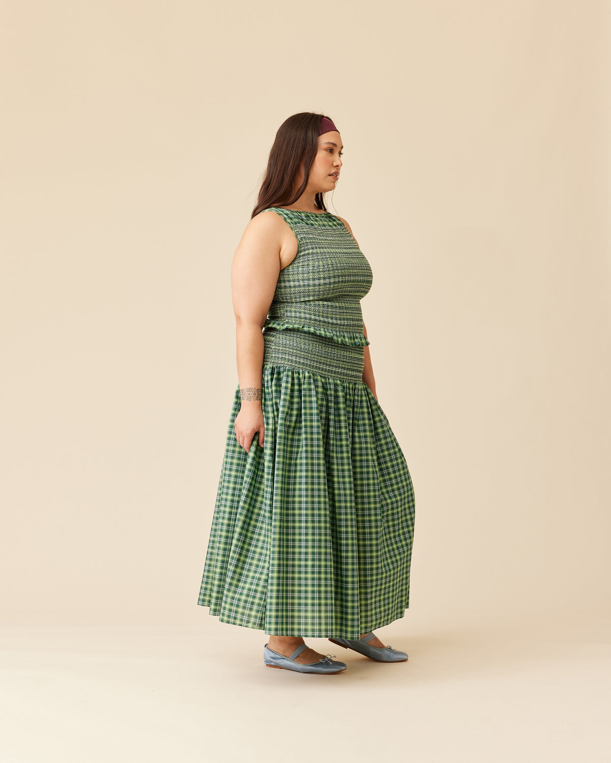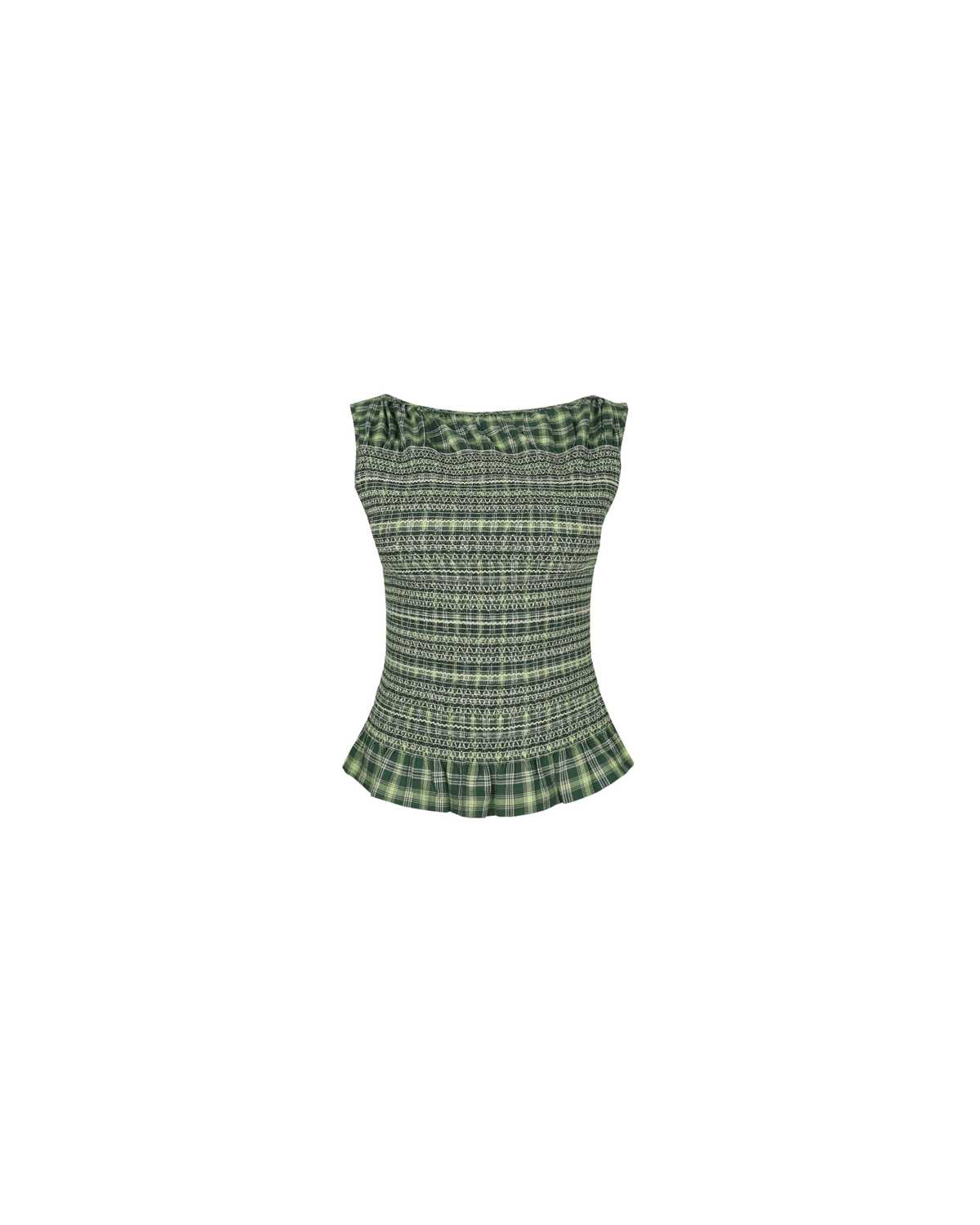Sleeveless, fitted top with smocking throughout the body to create texture and shape. Features a soft ruffle detail at the hem, which compliments the smocking detail. Make it a set by pairing this tank with our Anastasia Skirt