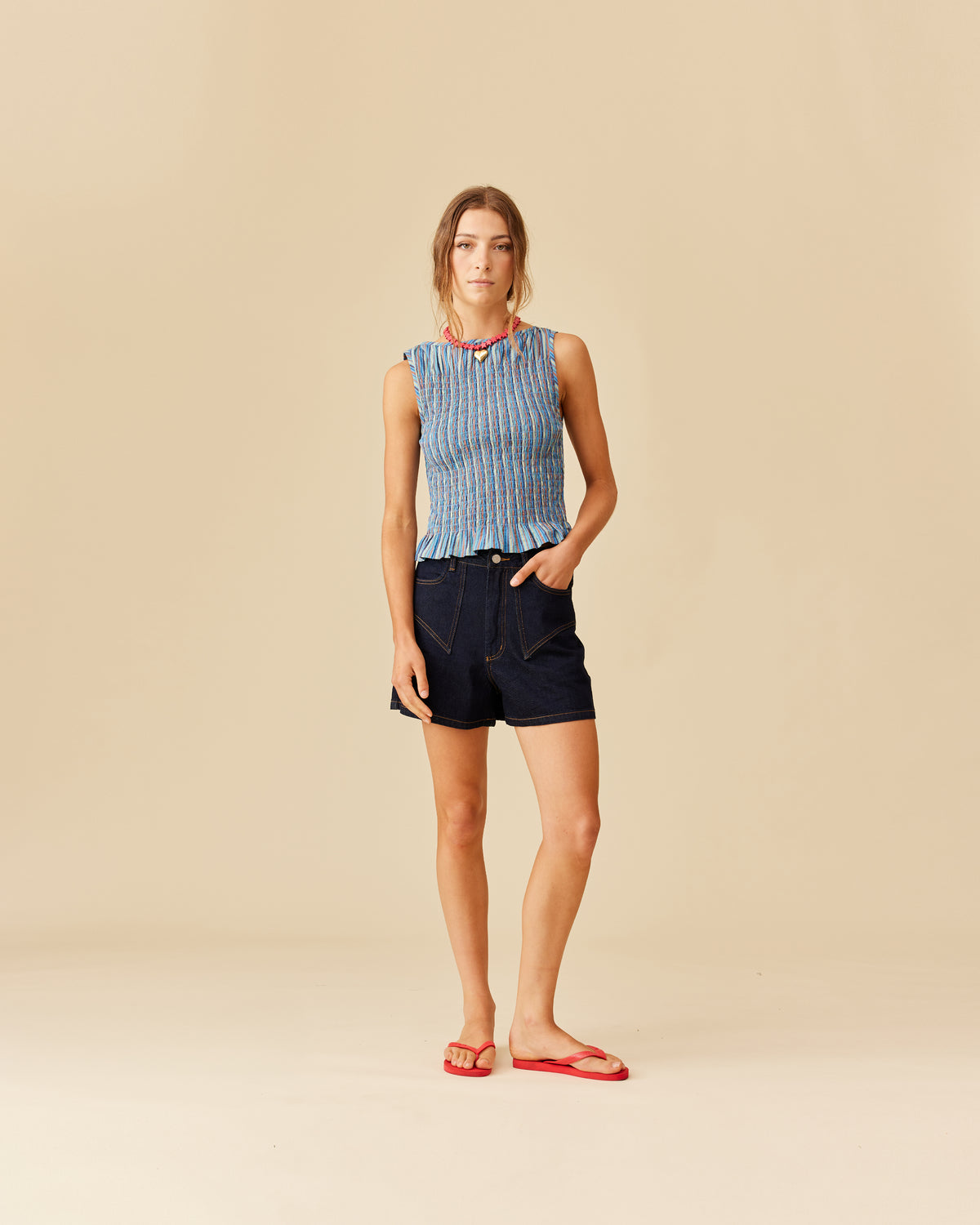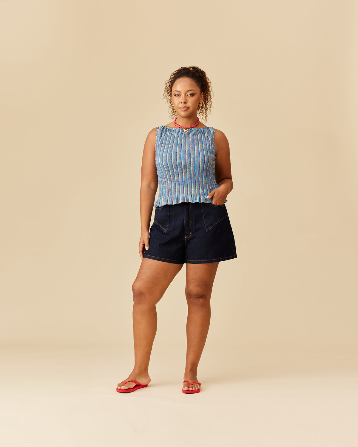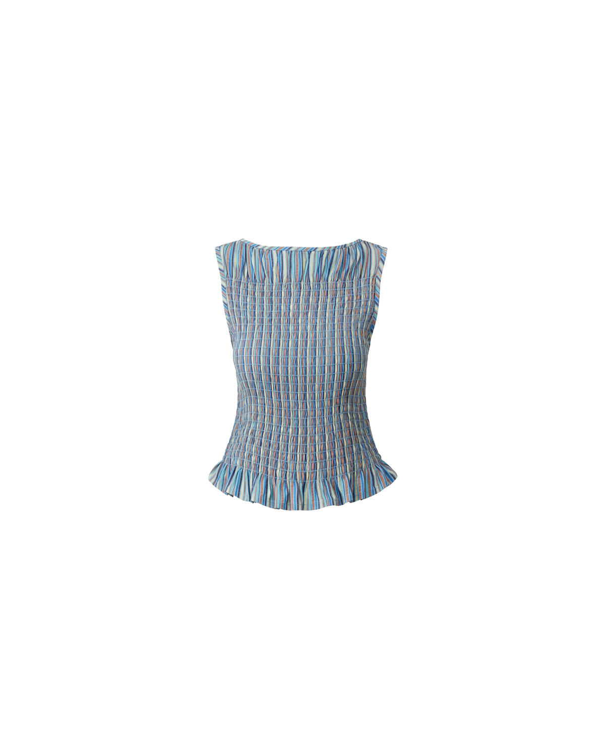 Sleeveless, fitted top with smocking throughout the body to create texture and shape. Features a soft ruffle at the hem, which complements the smocking detail. Make it a set by pairing this tank with our Anastasia Skirt.