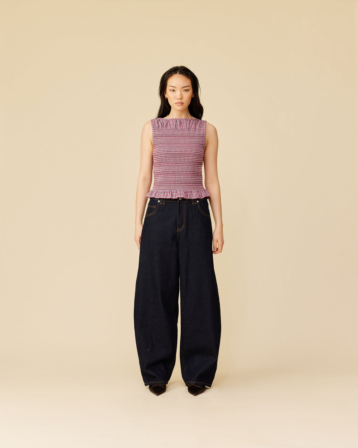 Sleeveless, fitted top with smocking throughout the body to create texture and shape. Features a soft ruffle detail at the hem, which compliments the smocking detail. Make it a set by pairing this tank with our Anastasia Skirt.