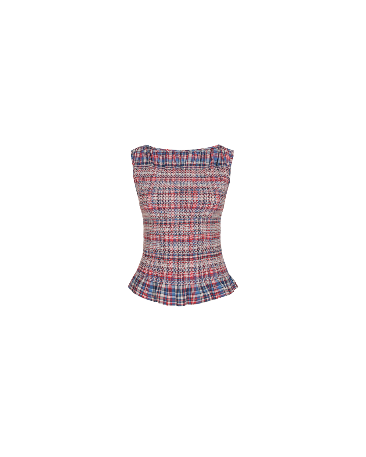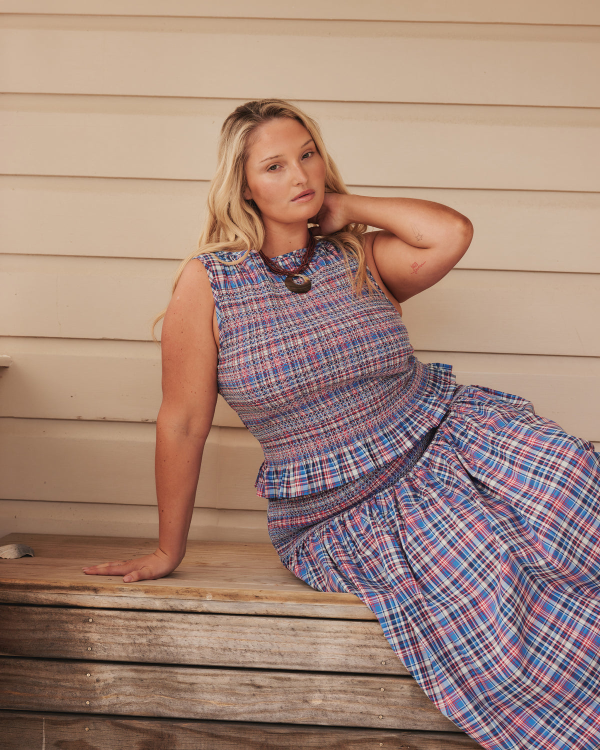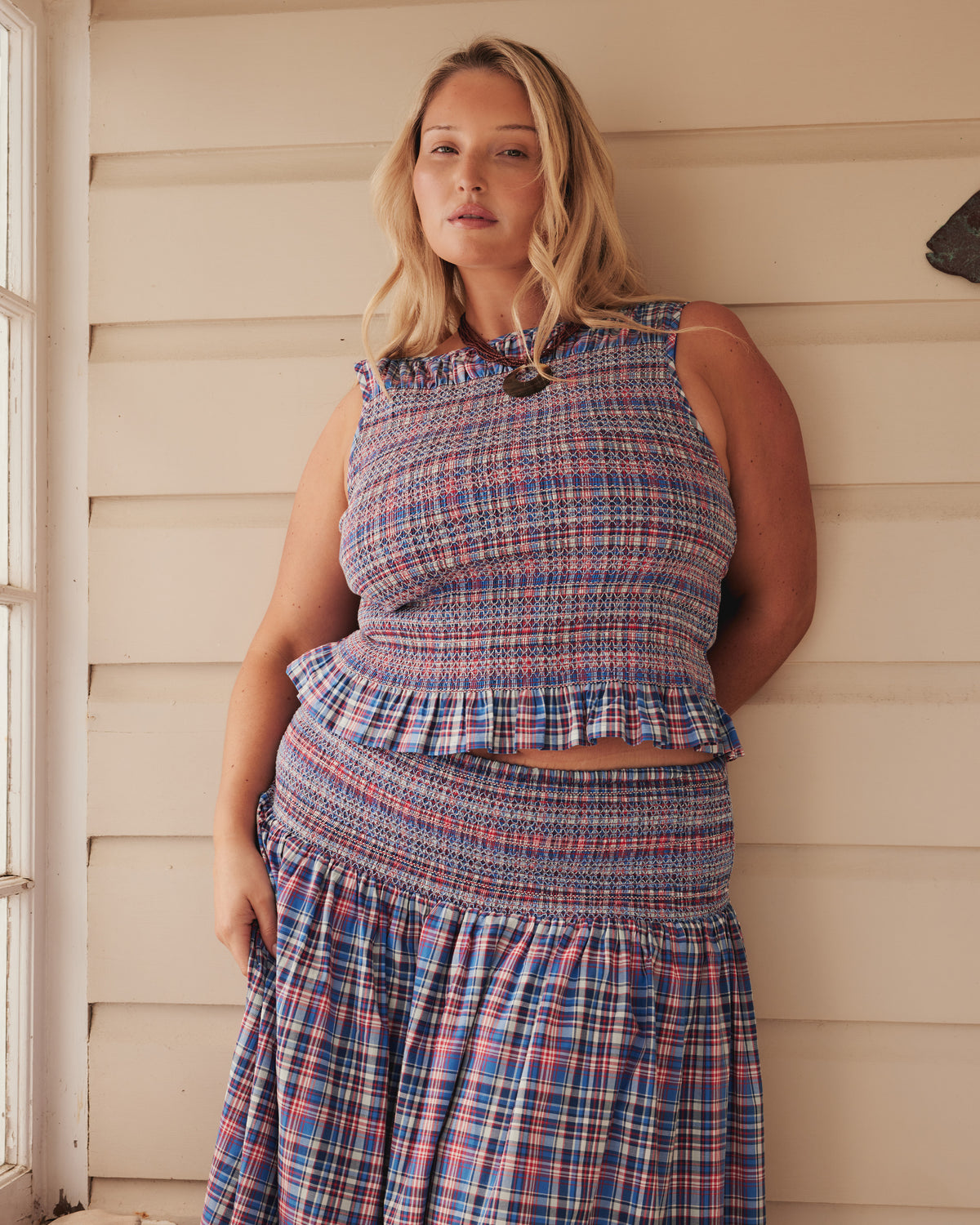 Sleeveless, fitted top with smocking throughout the body to create texture and shape. Features a soft ruffle at the hem, which complements the smocking detail. Make it a set by pairing this tank with our Anastasia Skirt.