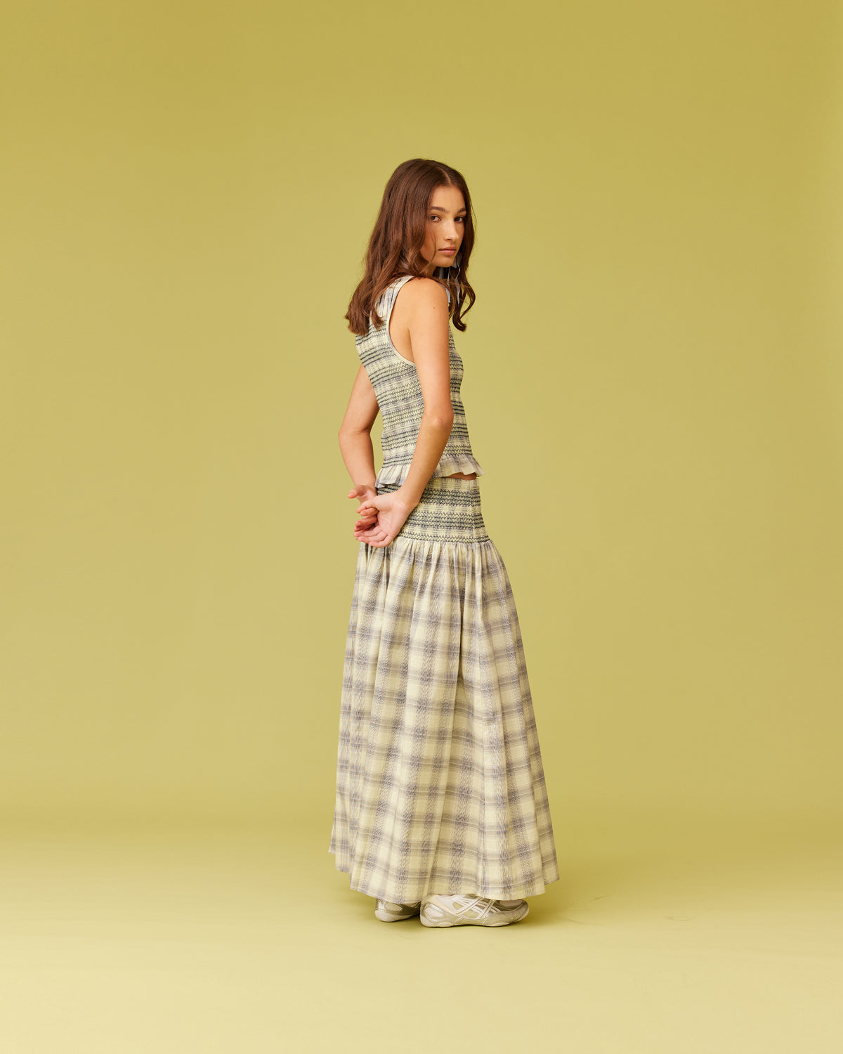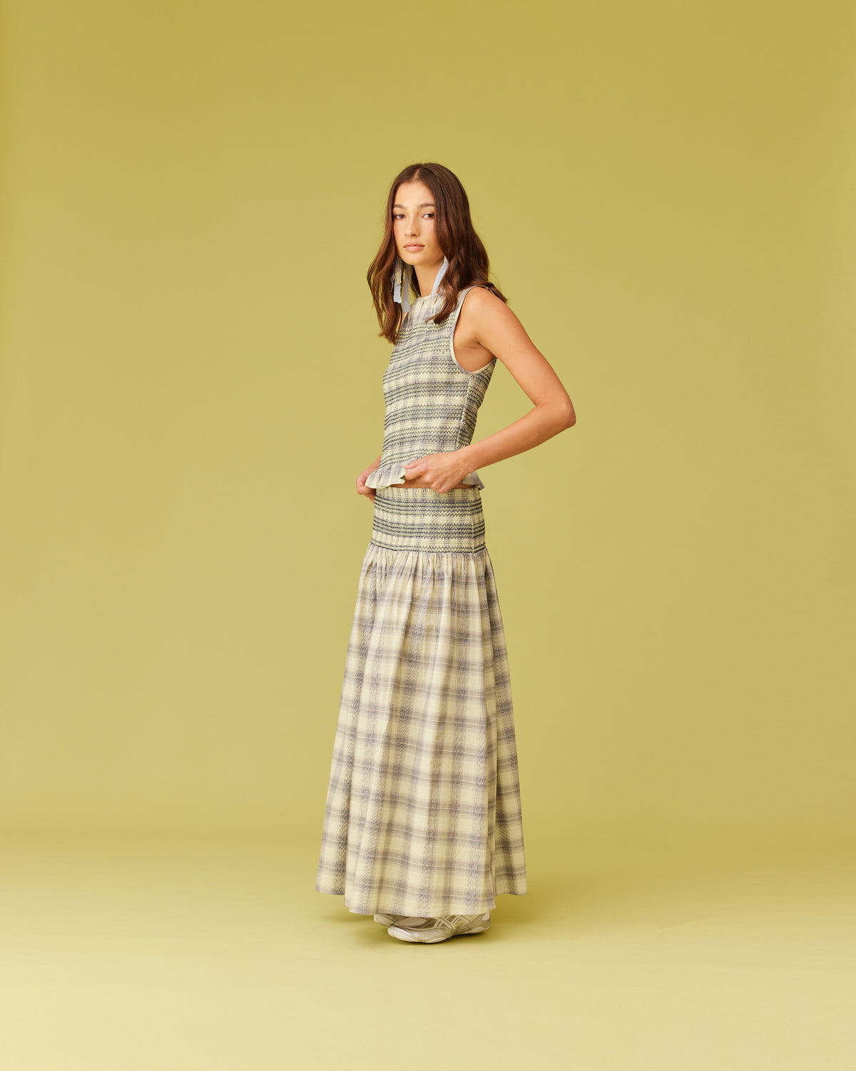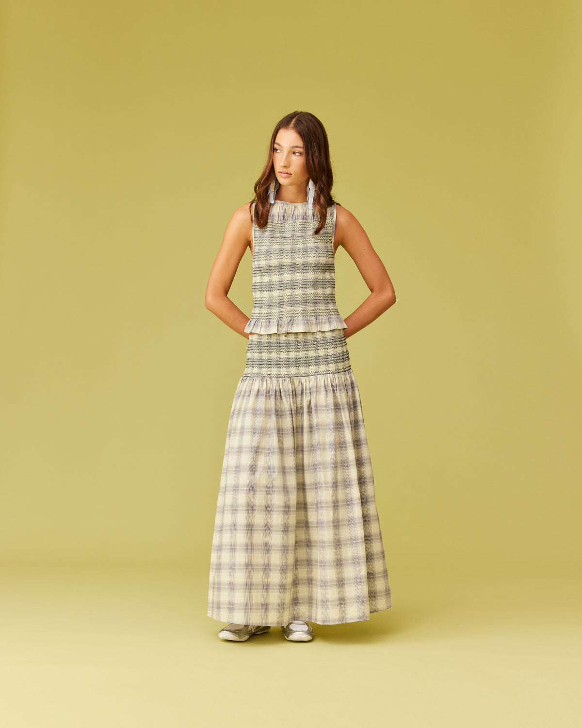 Sleeveless, fitted top with smocking throughout the body to create texture and shape. Features a soft ruffle at the hem, which complements the smocking detail. Make it a set by pairing this tank with our Anastasia Skirt.