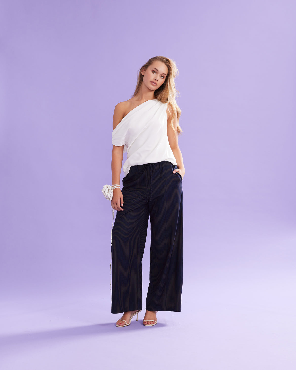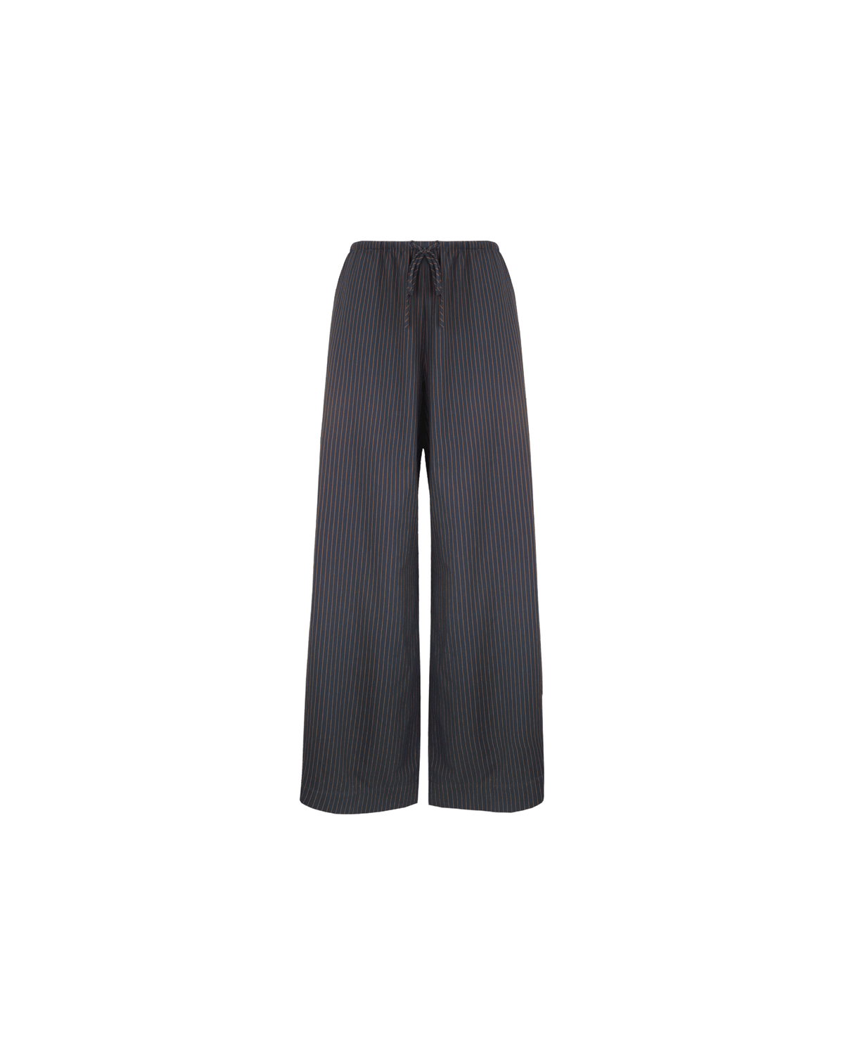 Palazzo style elastic waist pants with a tie, in a mid-weight pinstripe suiting fabric. These pants are high-waisted, uncomplicated and, classically cool.