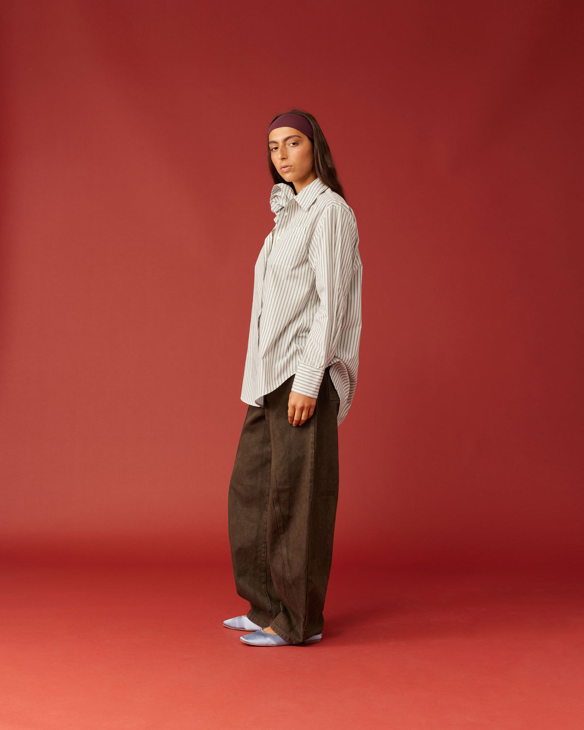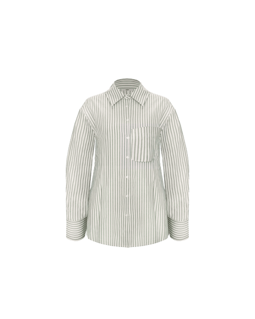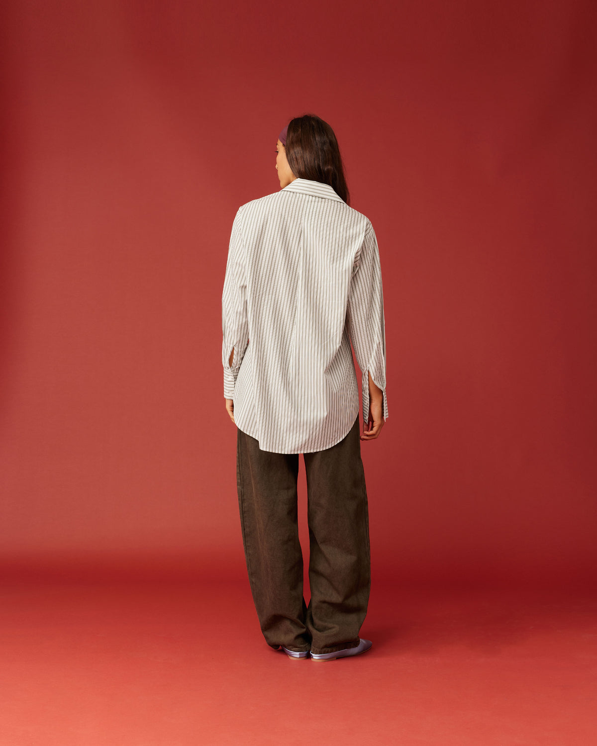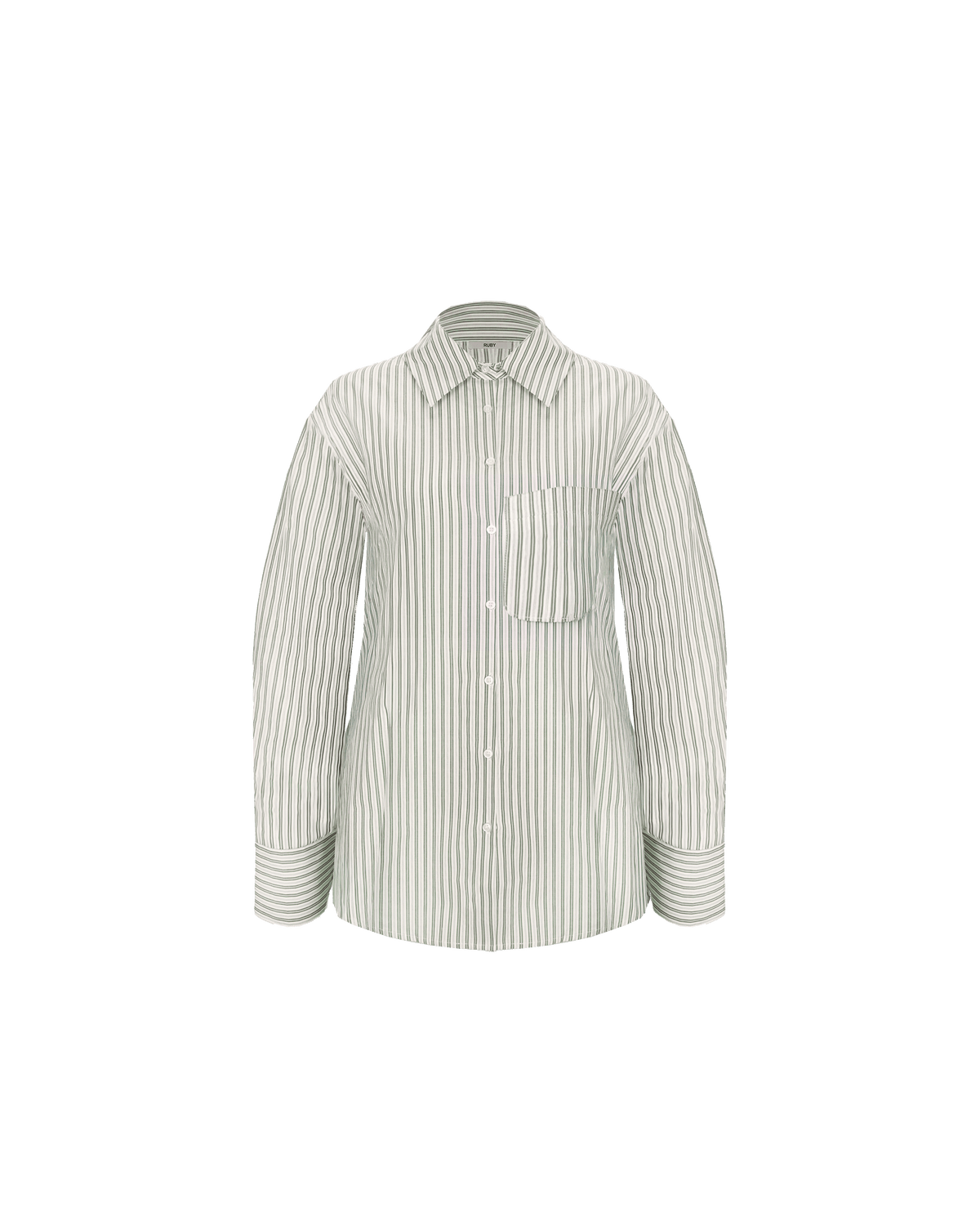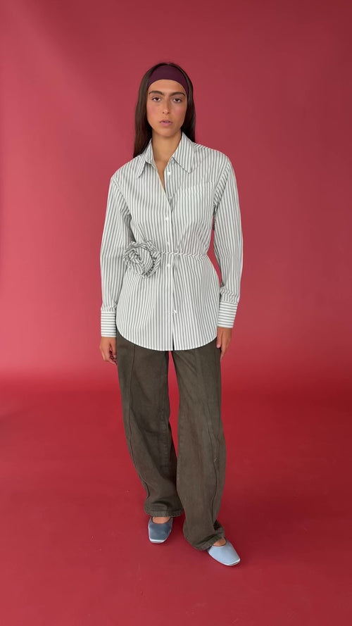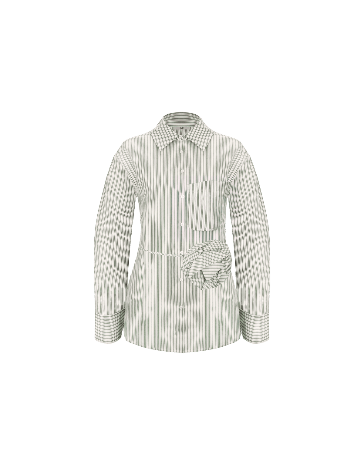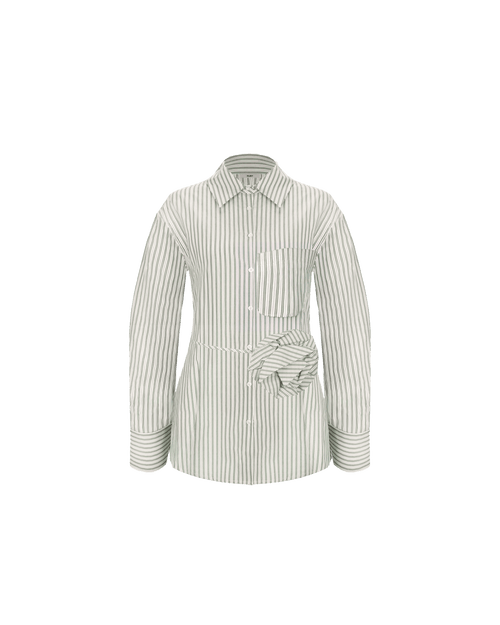 Long-line relaxed cotton shirt, designed in an olive stripe. This shirt features a detachable Rosette tie, which can be used to cinch in the shirt as a belt, styled in your hair or tied on your bag to create a matching moment.