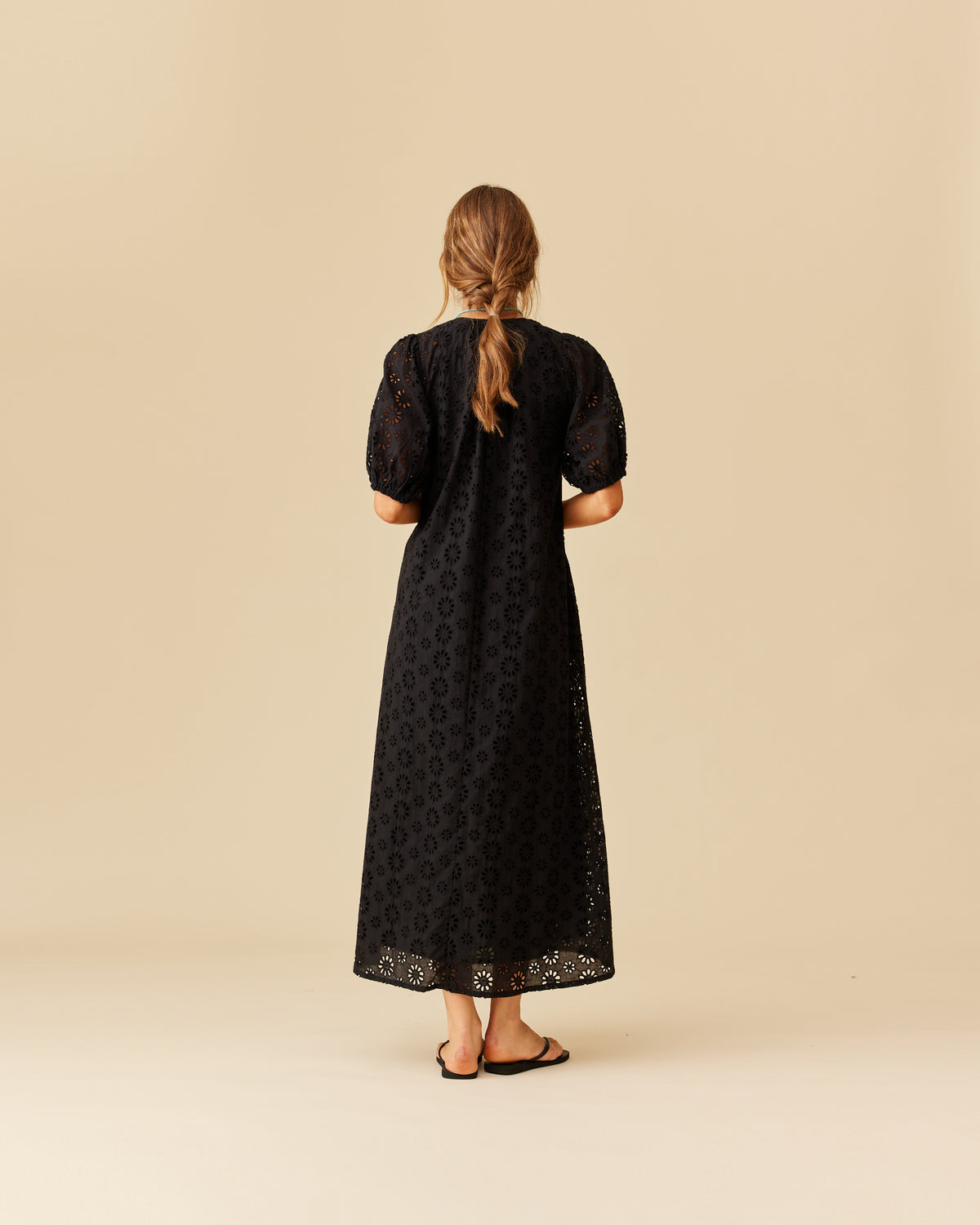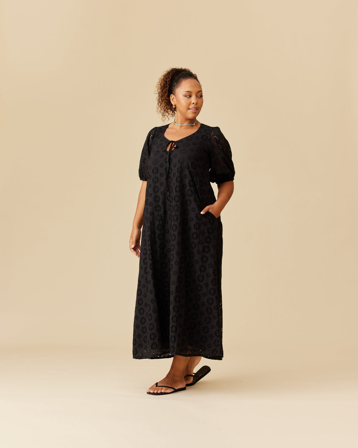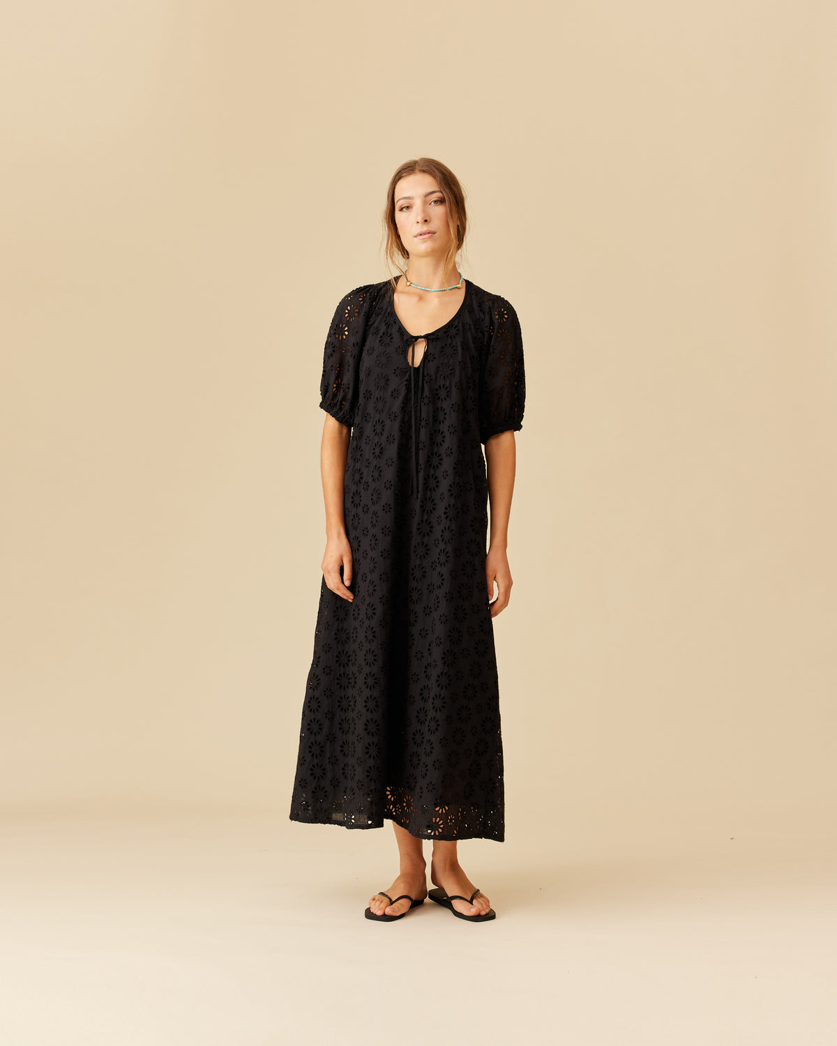Our summer staple dress makes a return in an embroidered cotton fabric. Relaxed fit maxi dress with elasticated puff sleeves and a tie neckline with a keyhole detail. The puff sleeves add a romantic feel to this versatile piece.