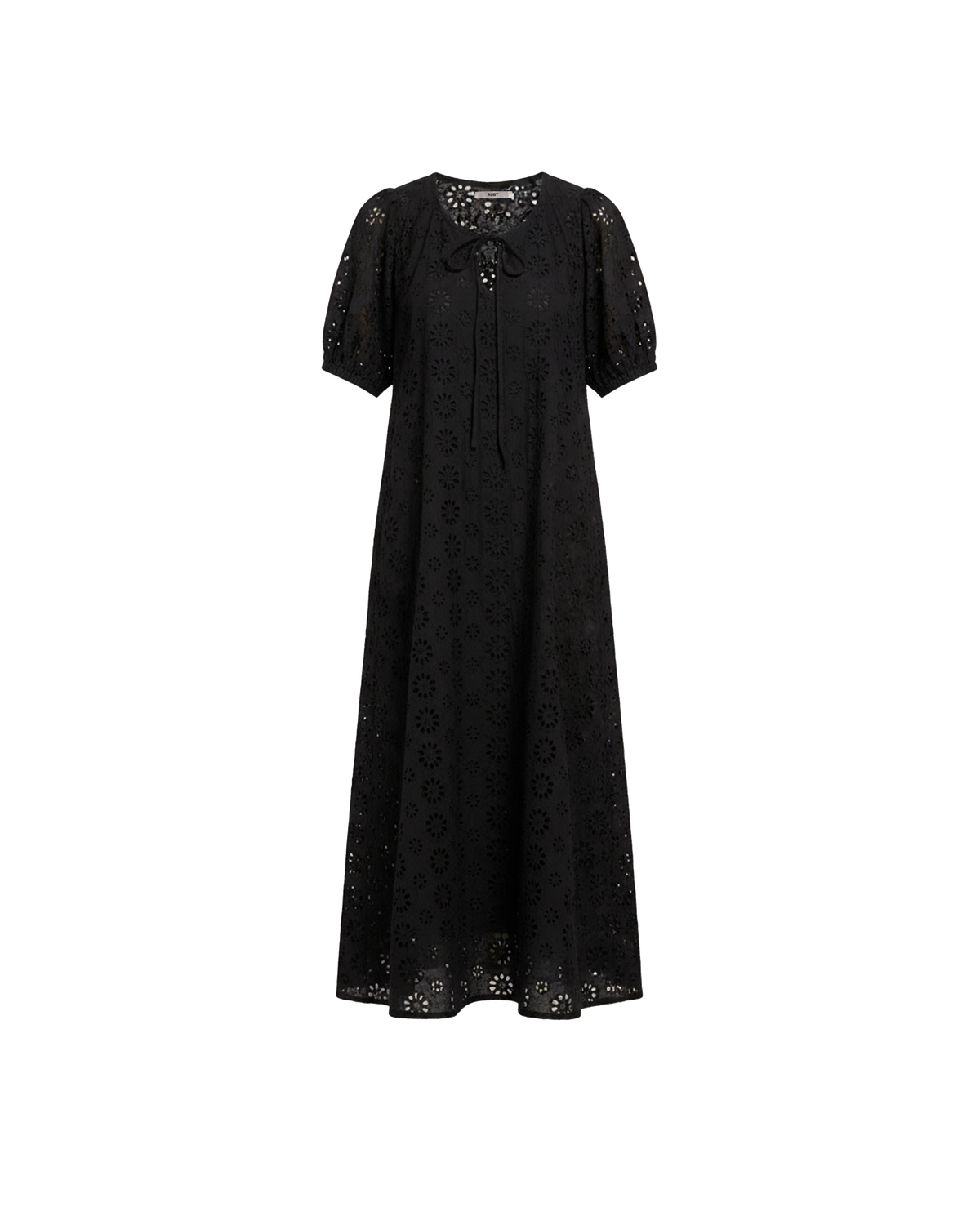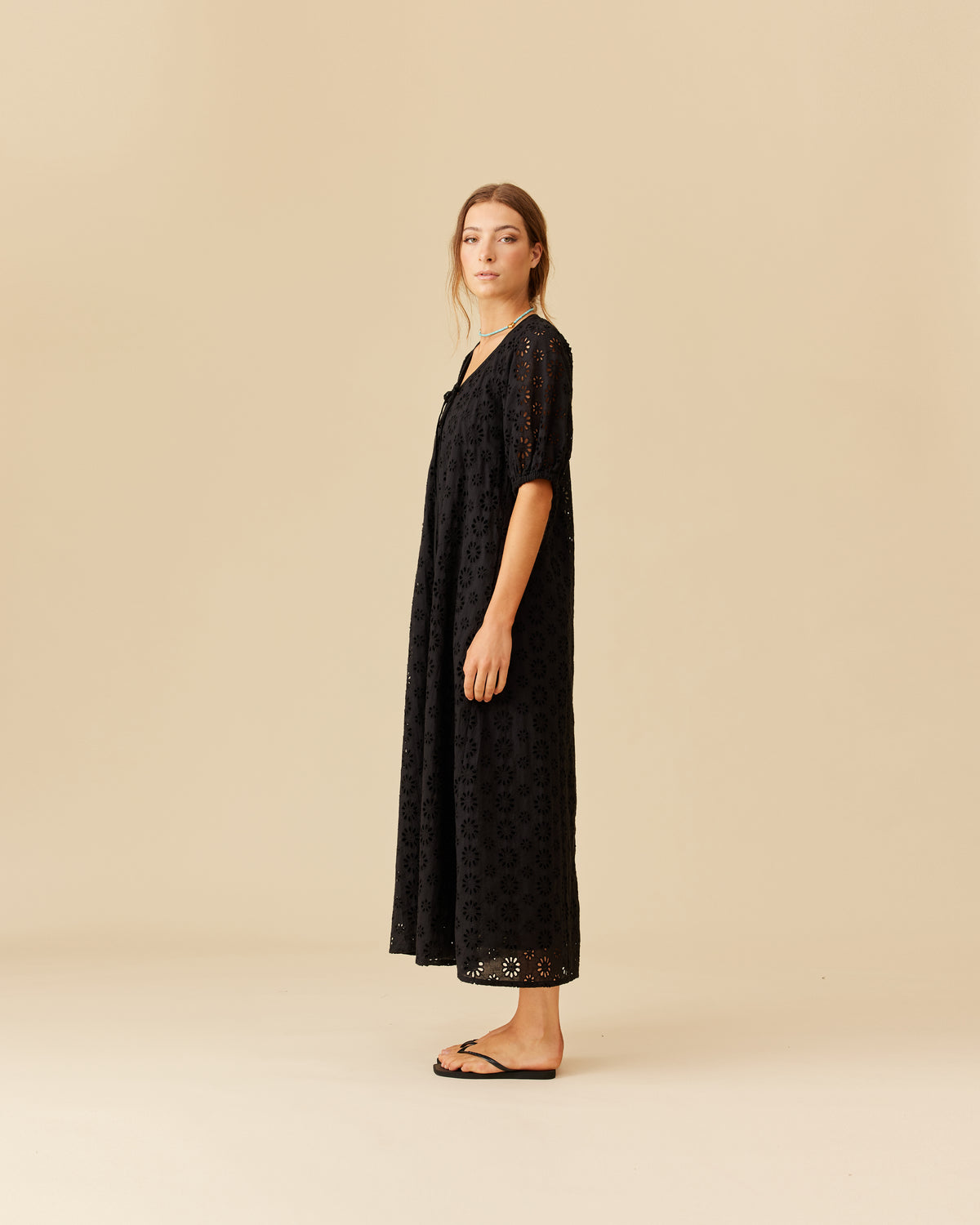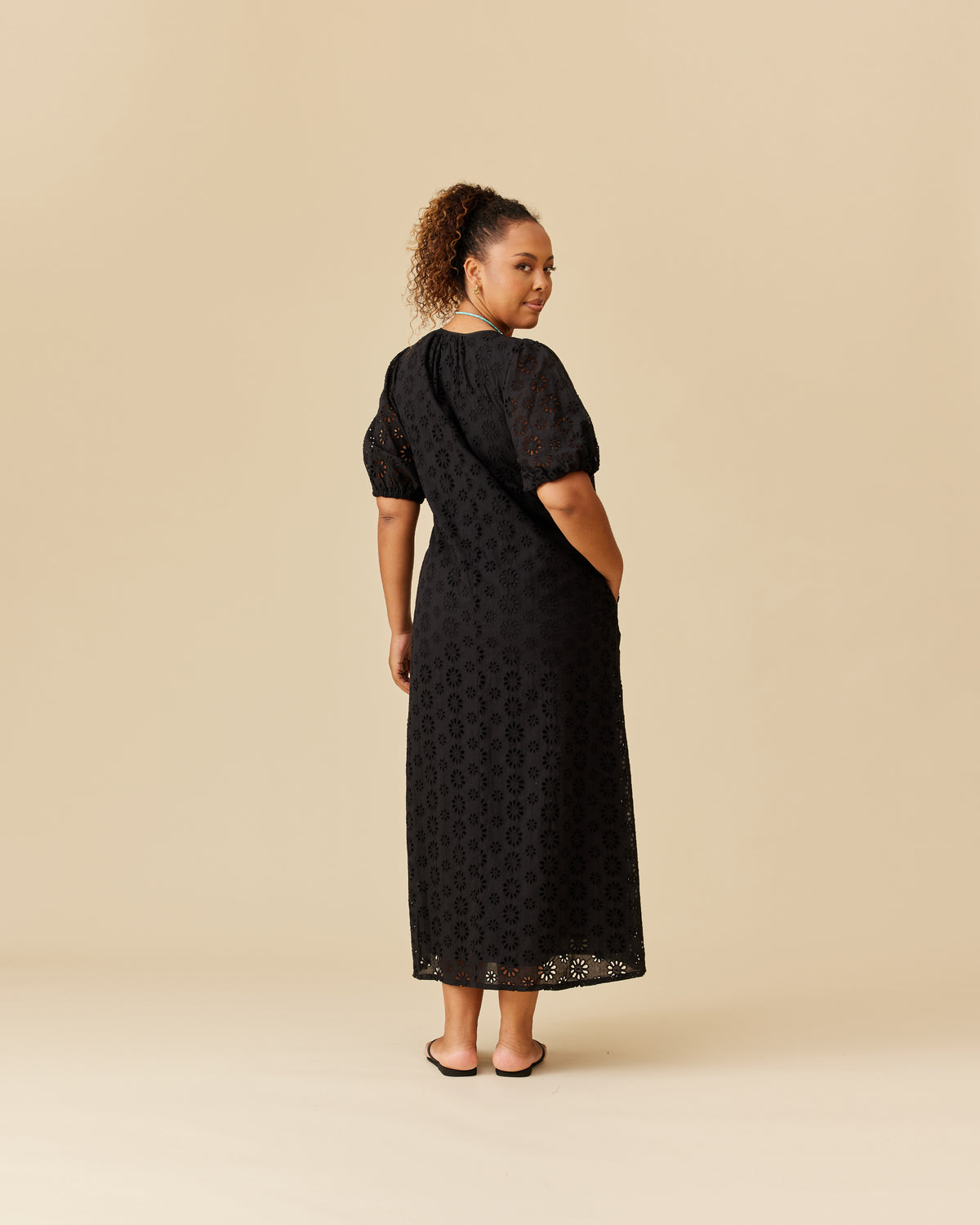 Our summer staple dress makes a return in an embroidered cotton fabric. Relaxed fit maxi dress with elasticated puff sleeves and a tie neckline with a keyhole detail. The puff sleeves add a romantic feel to this versatile piece.