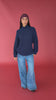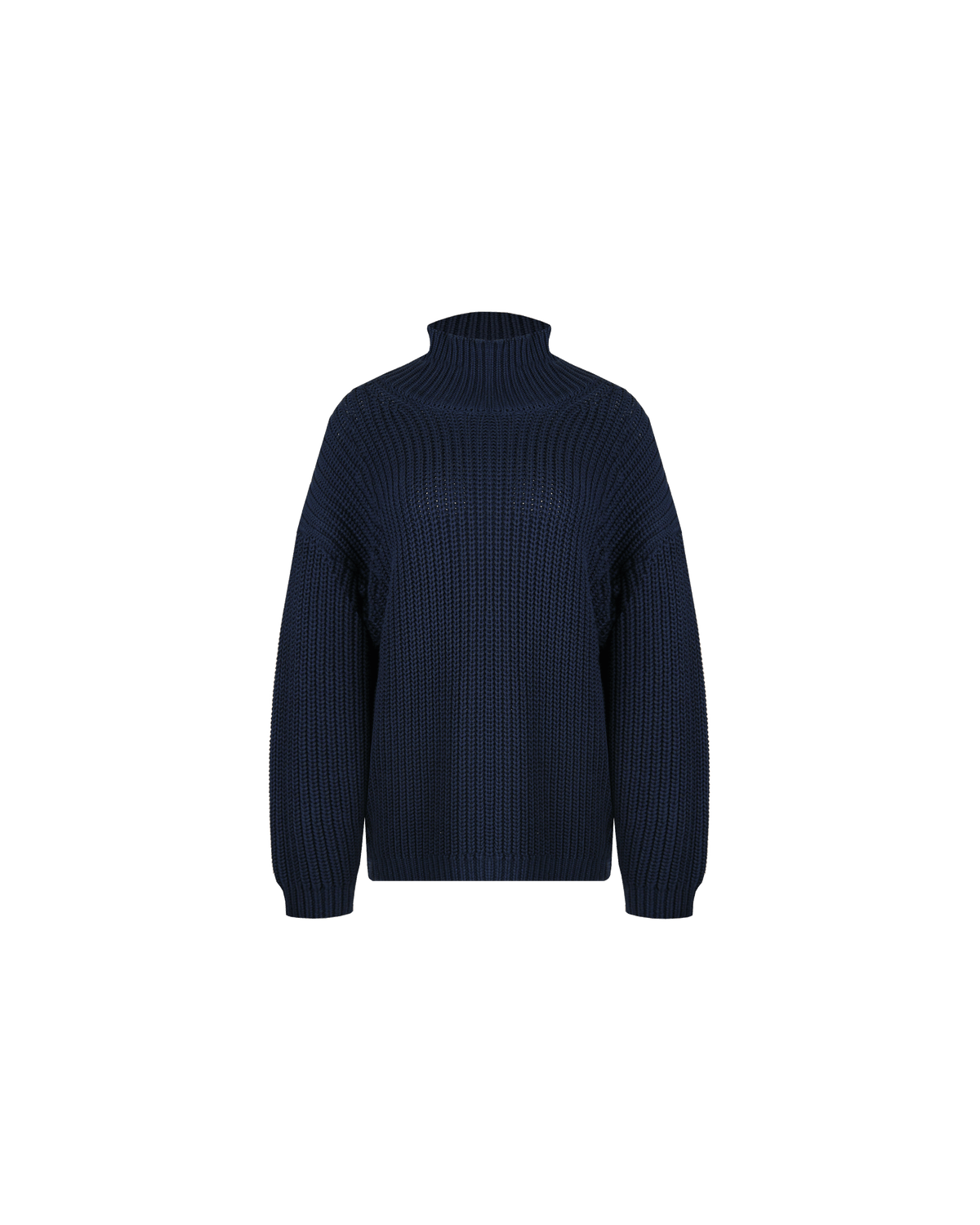 Chunky turtle neck sweater designed in a navy cotton yarn. Slouchy and long line, this sweater will wrap you up and have you feeling extra cosy, always.