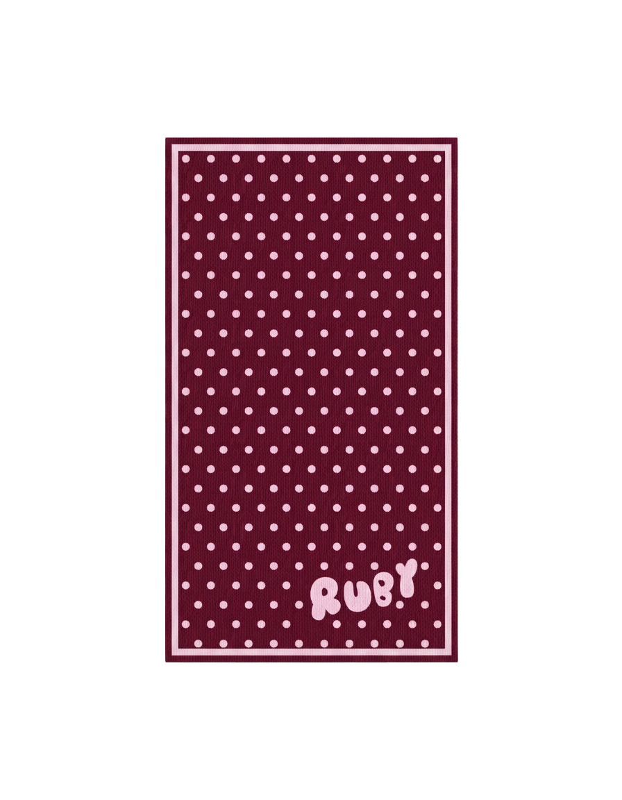 Our very own RUBY beach towels! Imagined in our favourite pink and burgundy colour way, in a polka dot design.