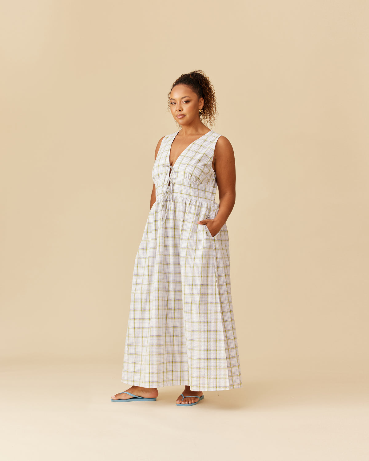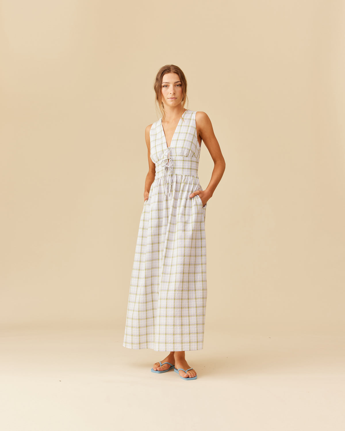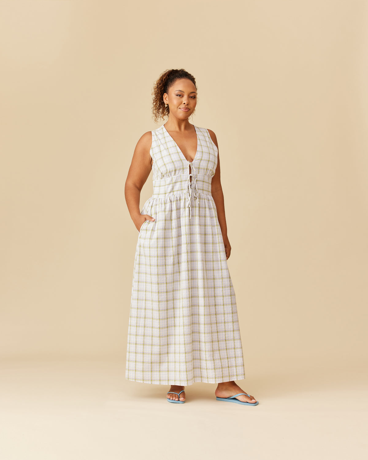 Sleeveless sundress designed in our summery hydrangea tartan. This dress features front tie details and a structured waist which falls into an A-line skirt, giving it a floaty, beachy look.