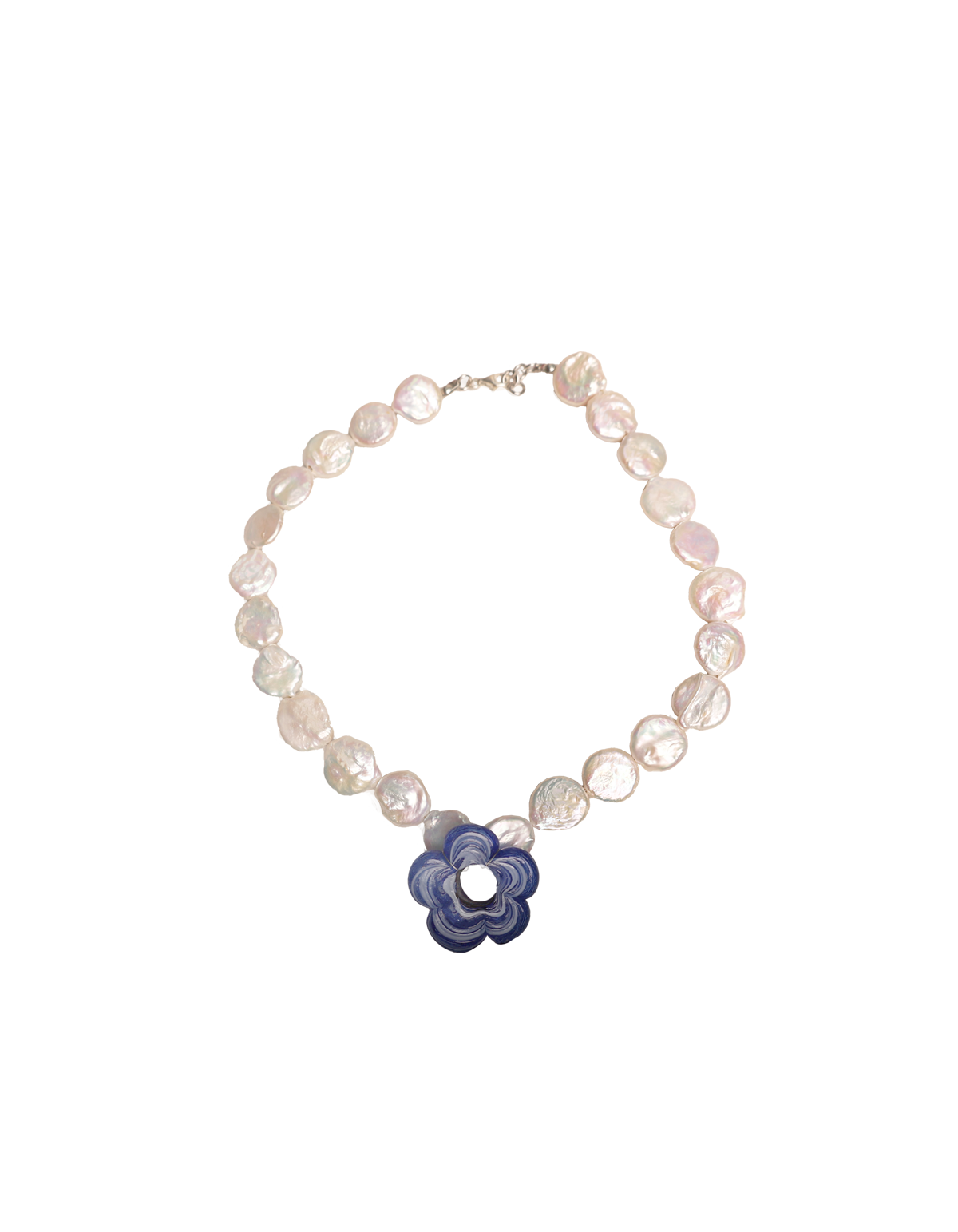 A Honeybloom x Flora Collaboration. Freshwater pearl necklace, with a feature tangerine flower glass pendant at the centre.