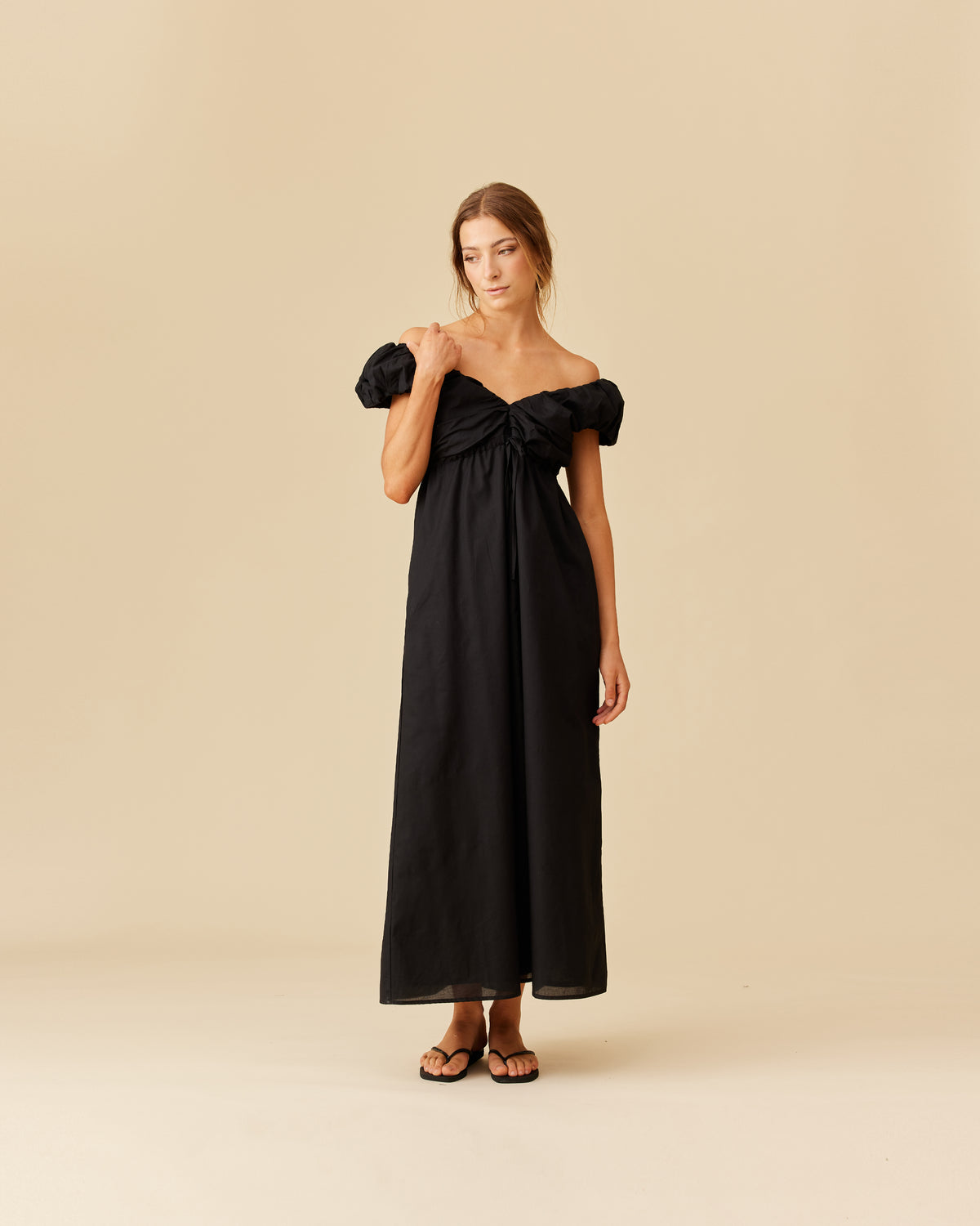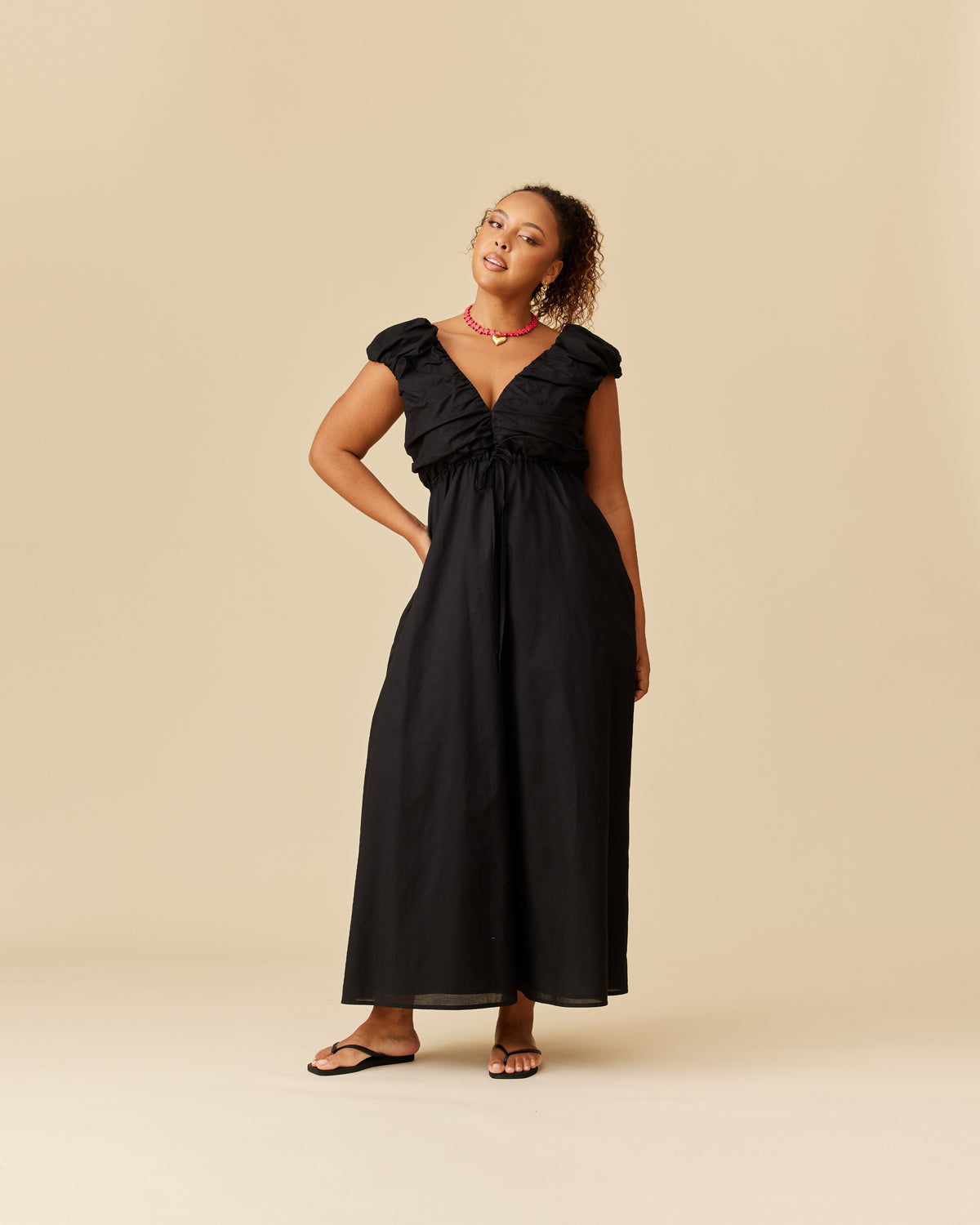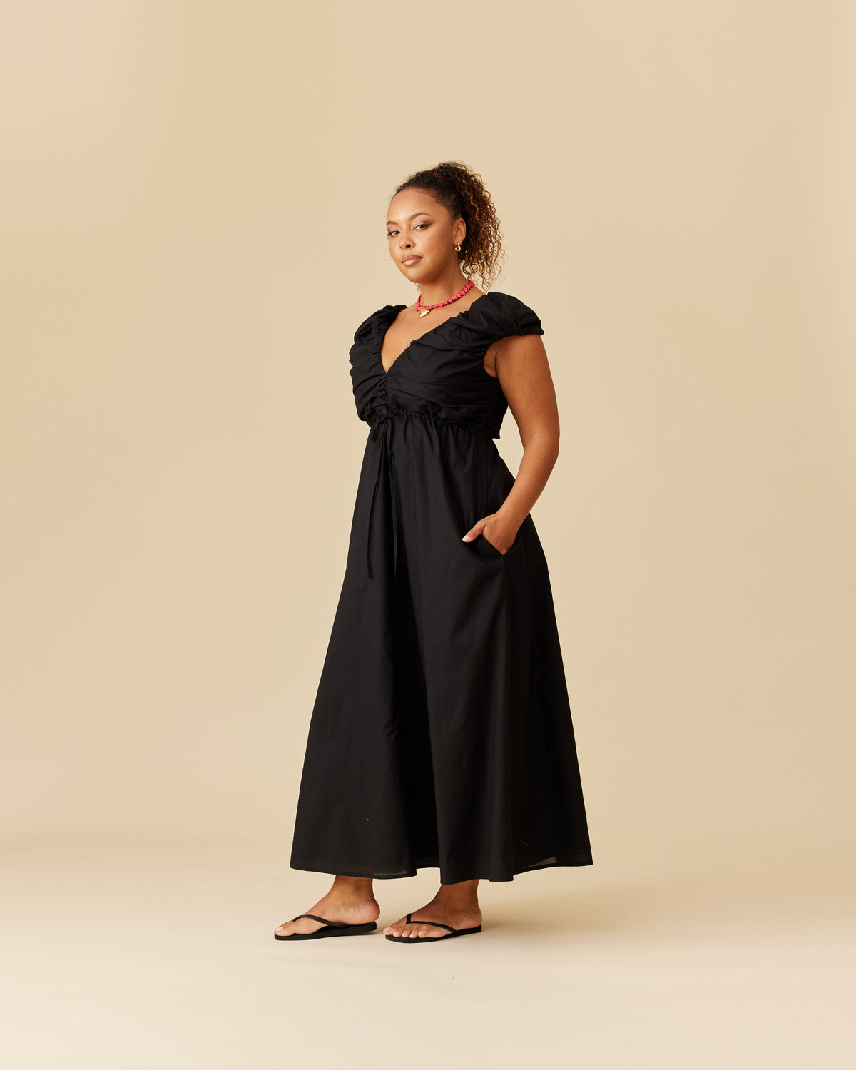 Crafted in a cotton fabric with cap sleeves and ruched detailing at the bust, this dress can be worn on or off the shoulder. Features a tie below the bust to allow you to wear it cinched or loose.