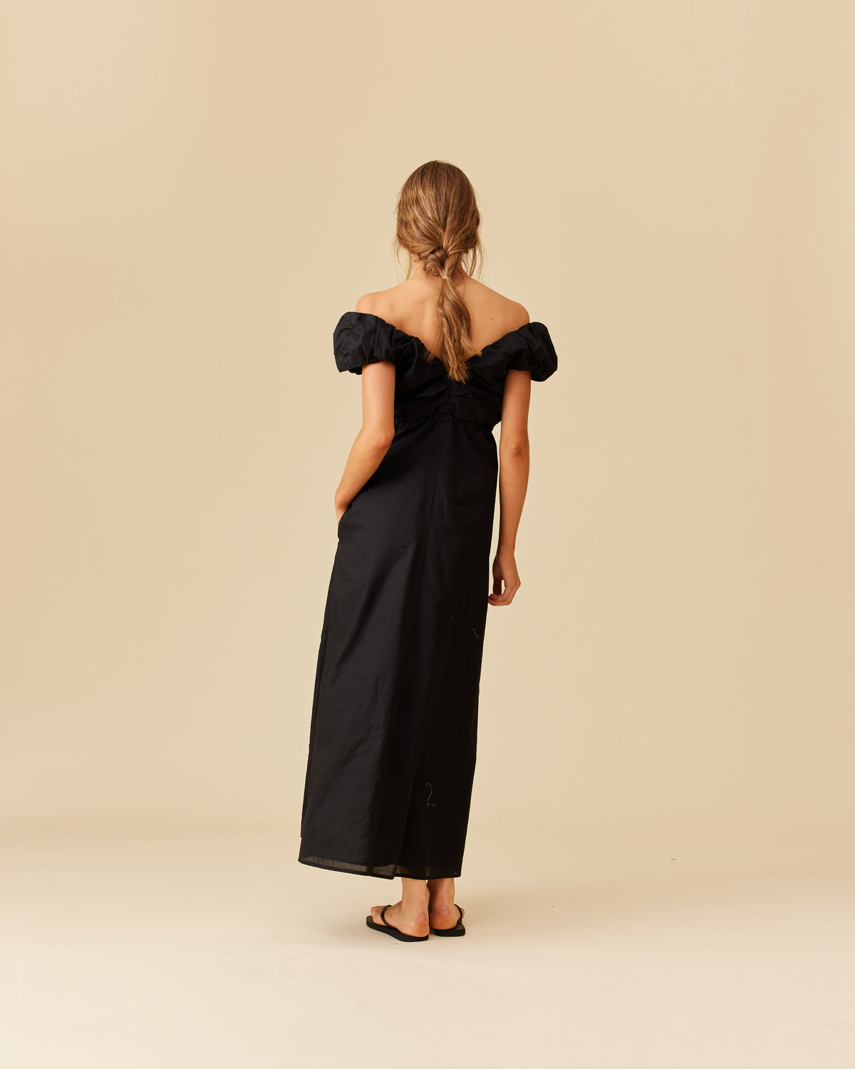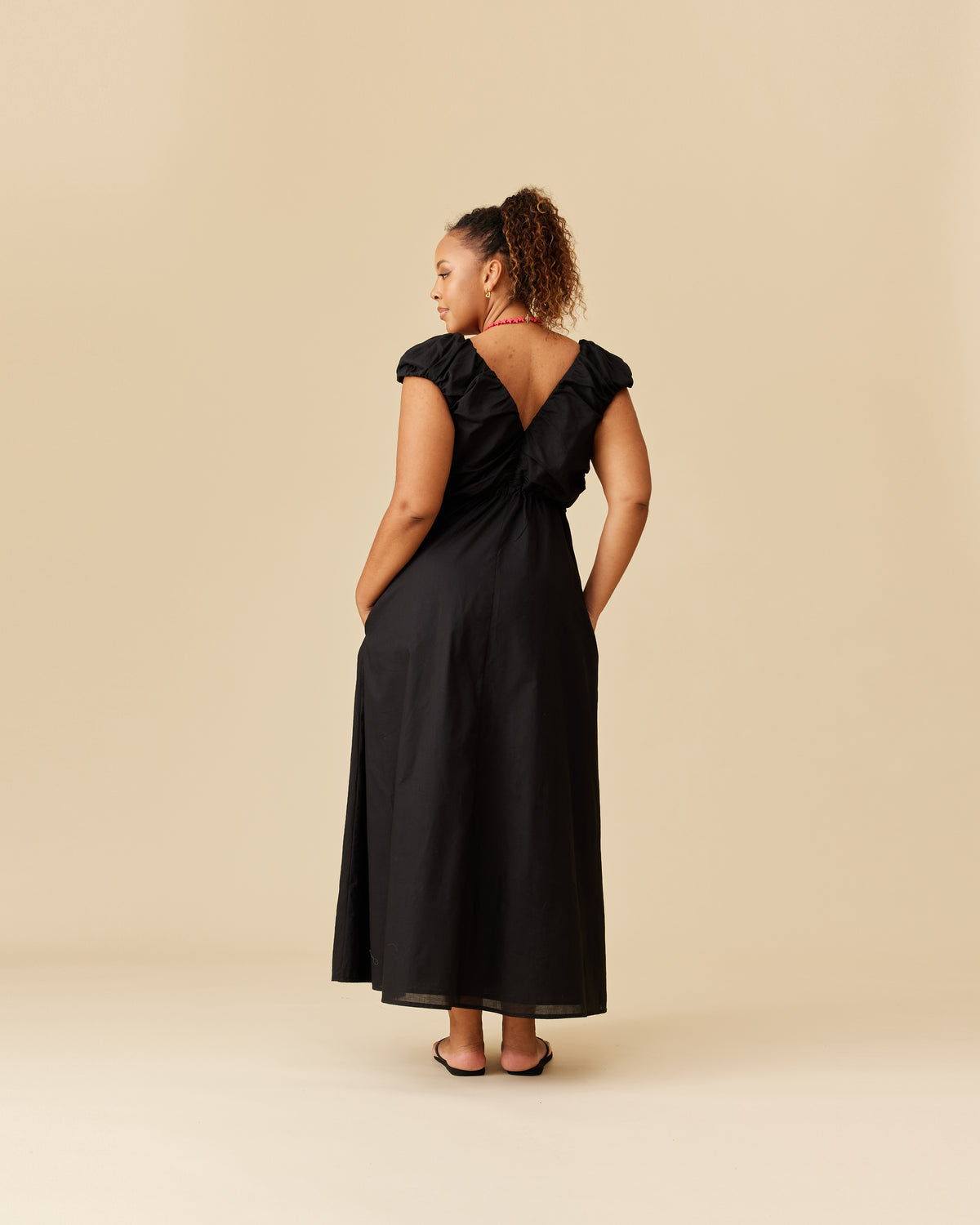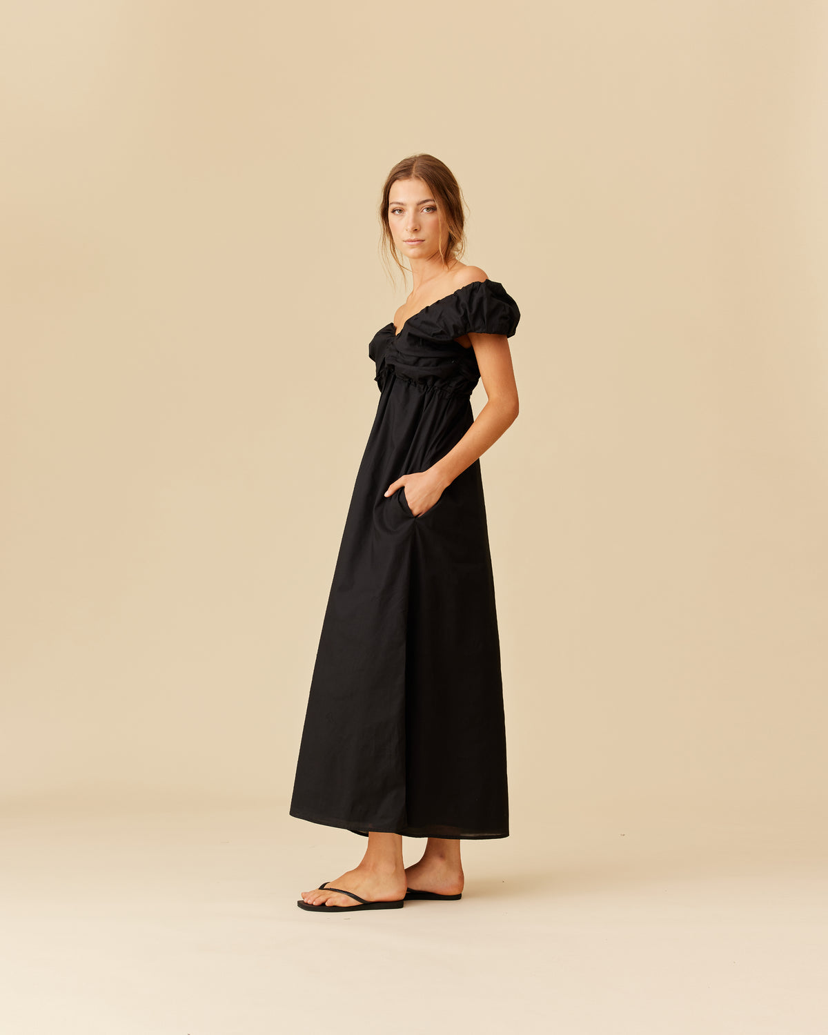 Crafted in a cotton fabric with cap sleeves and ruched detailing at the bust, this dress can be worn on or off the shoulder. Features a tie below the bust to allow you to wear it cinched or loose.