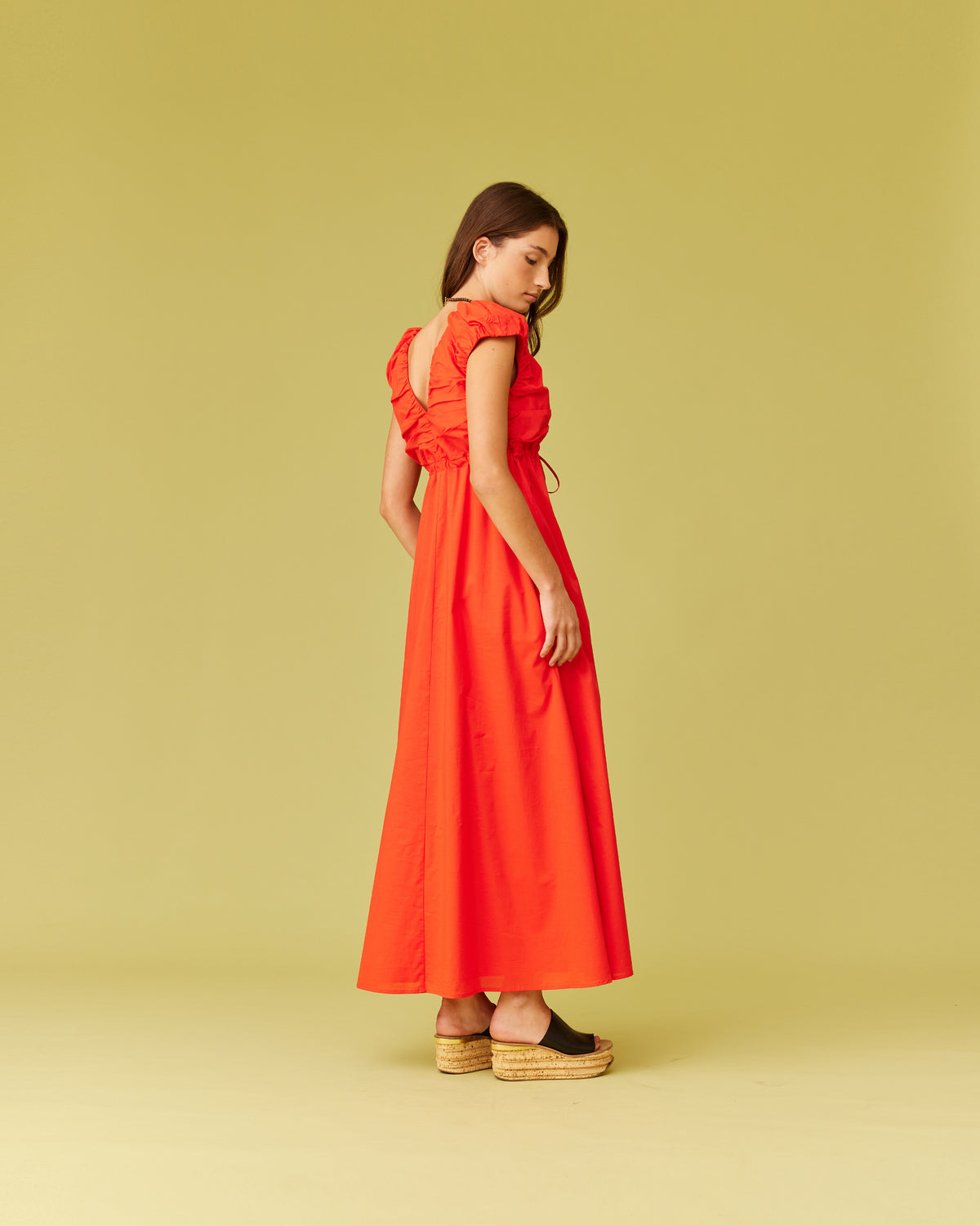 Crafted in a cotton fabric with cap sleeves and ruched detailing at the bust, this dress can be worn on or off the shoulder. Features a tie below the bust to allow you to wear it cinched or loose.