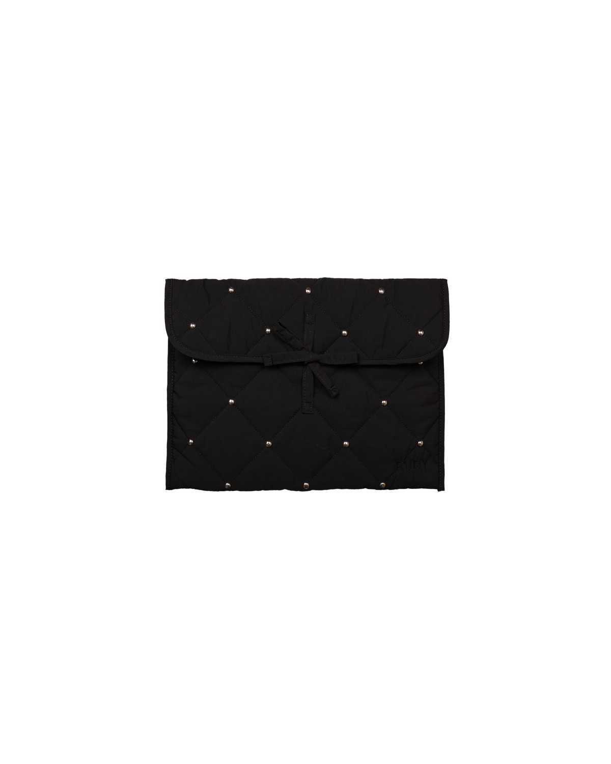 Our very own RUBY laptop case! This case is quilted and stuffed to provide your 13" laptop or tablet with just enough padding for comfortable rides. Designed in a classic black with silver stud embellishments.