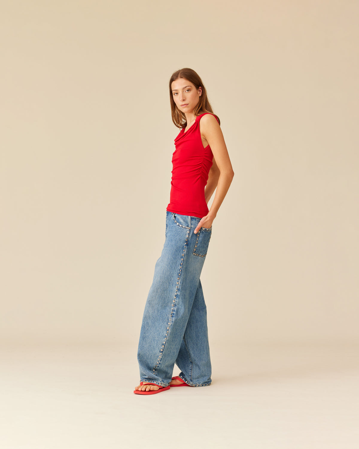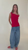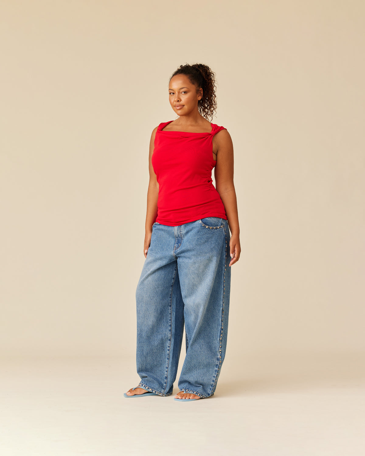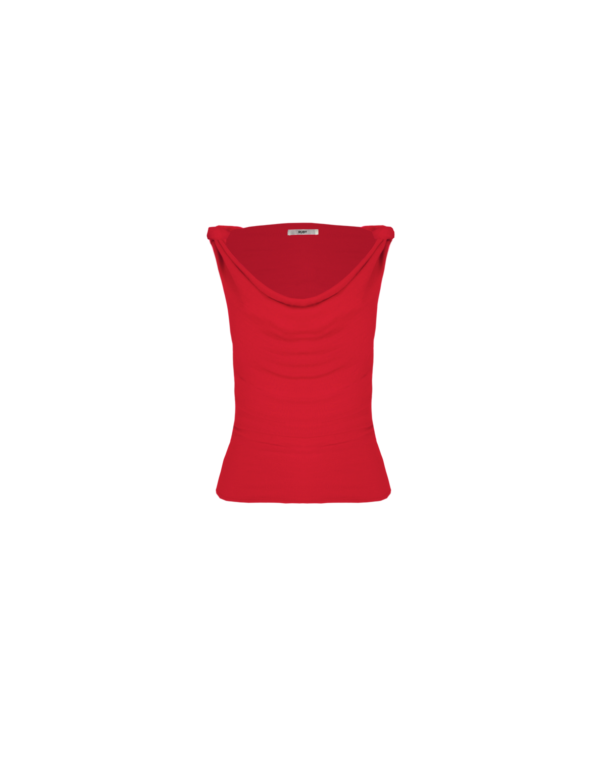 Cowl neck knitted tank top, crafted in a mid-weight cherry knit. You can change the neckline of this top by adjusting the two fabric loops at the shoulders, to be more or less of a cowl look, and also wear it on or off the shoulder.