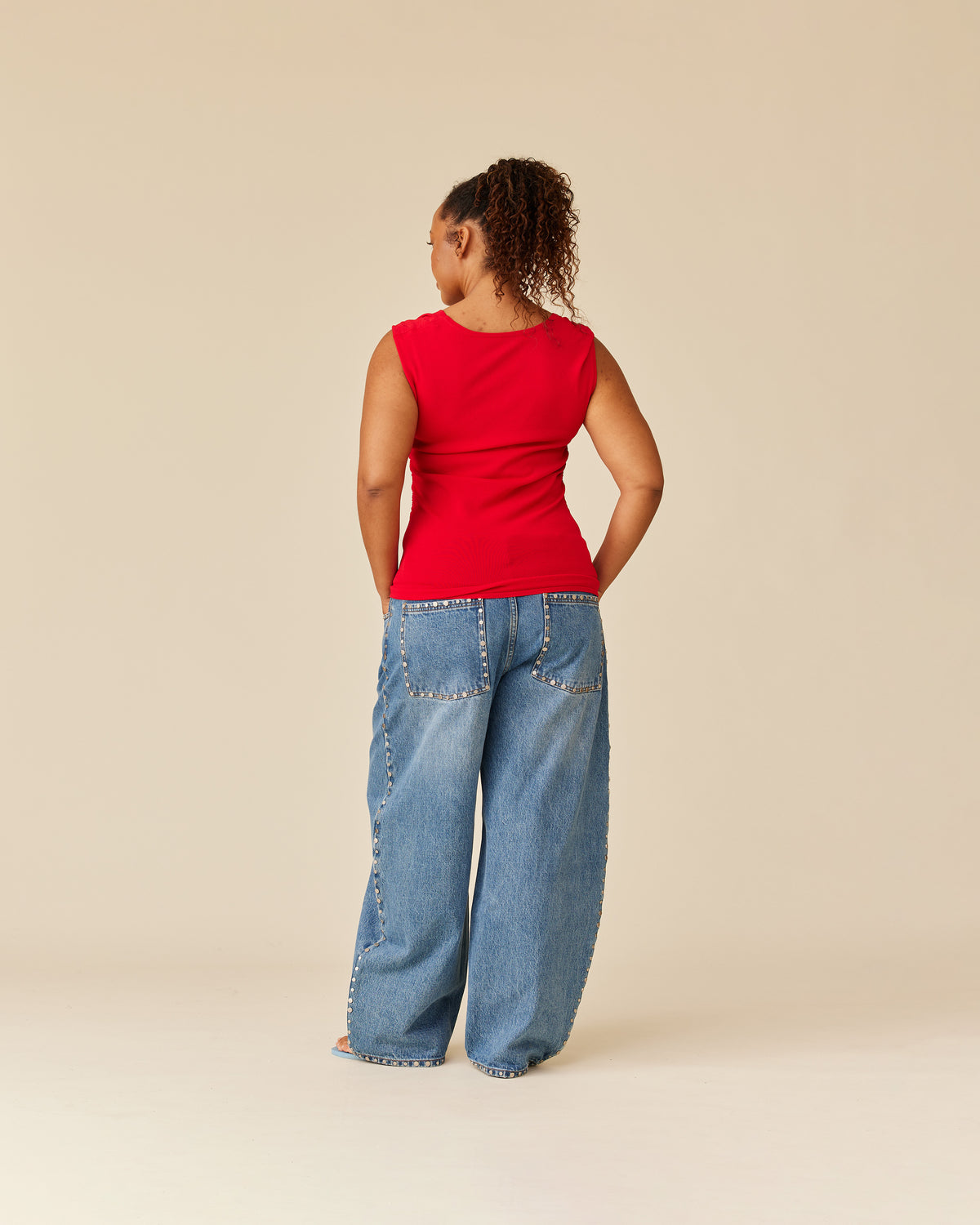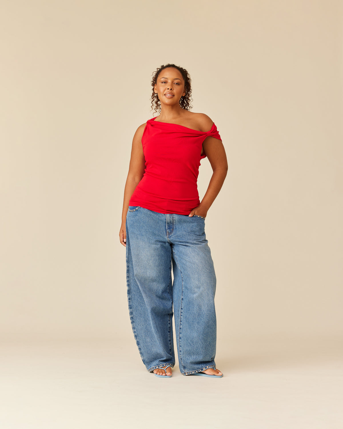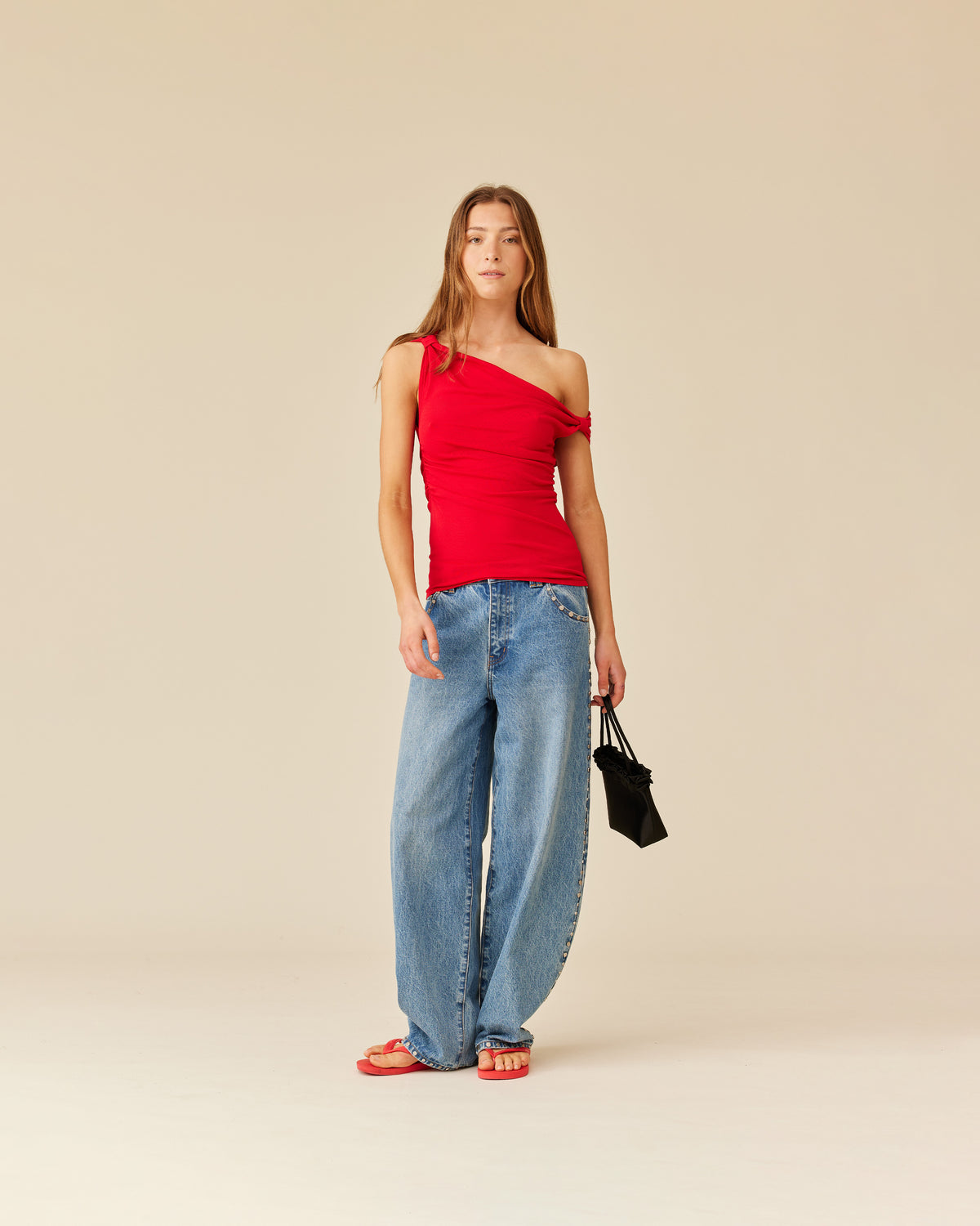 Cowl neck knitted tank top, crafted in a mid-weight cherry knit. You can change the neckline of this top by adjusting the two fabric loops at the shoulders, to be more or less of a cowl look, and also wear it on or off the shoulder.