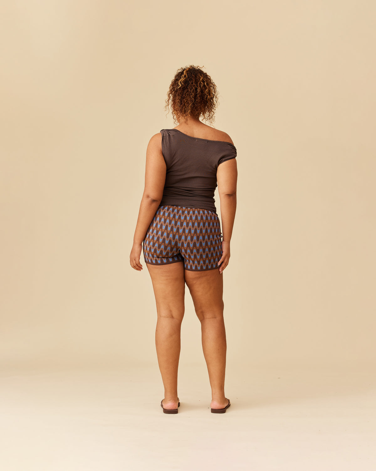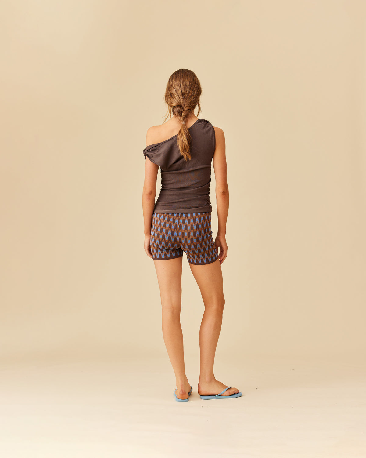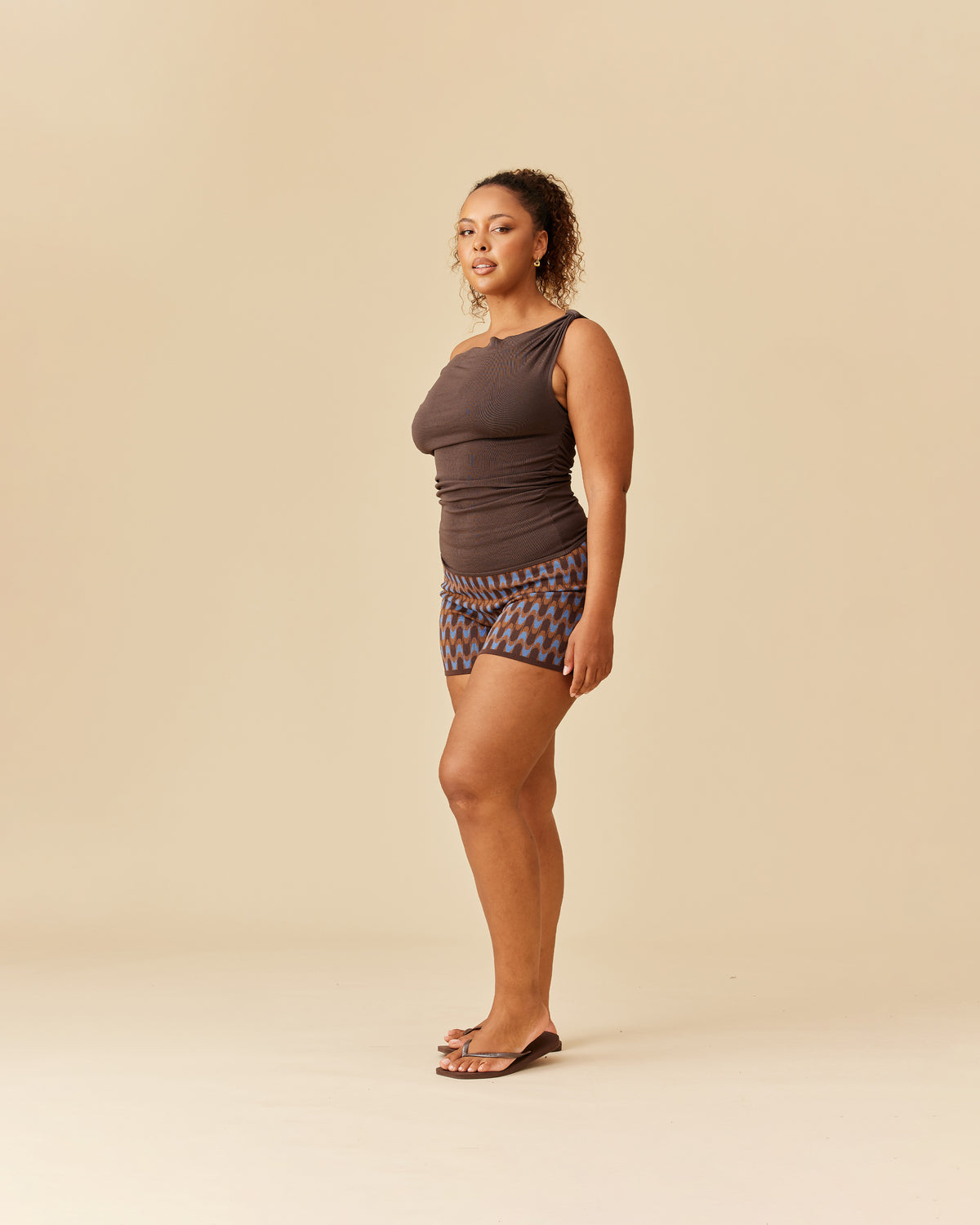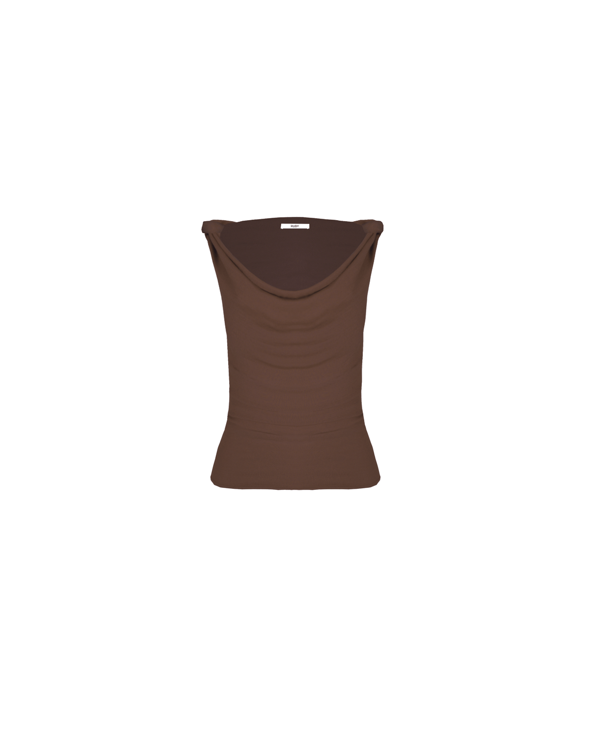 Cowl neck knitted tank top, crafted in a mid-weight brown knit. You can change the neckline of this top by adjusting the two fabric loops at the shoulders, to be more or less of a cowl look, and also wear it on or off the shoulder.