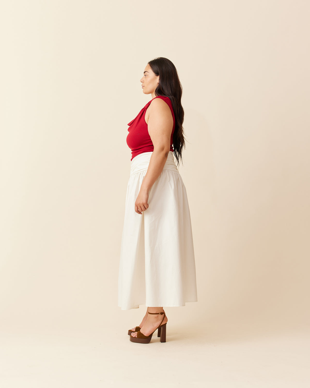 Cowl neck knitted tank top, crafted in a mid-weight knit. You can change the neckline of this top by adjusting the two fabric loops at the shoulders, to be more or less of a cowl look, and also wear it on or off the shoulder.