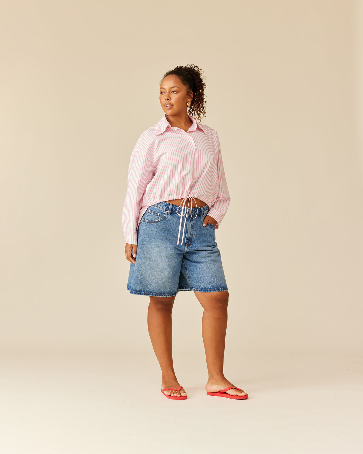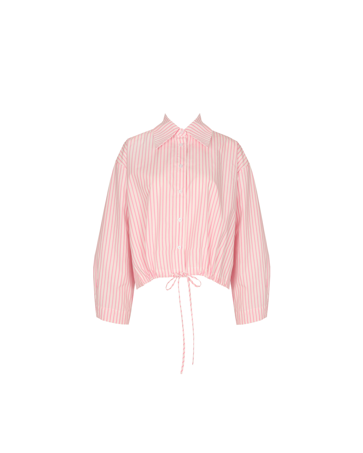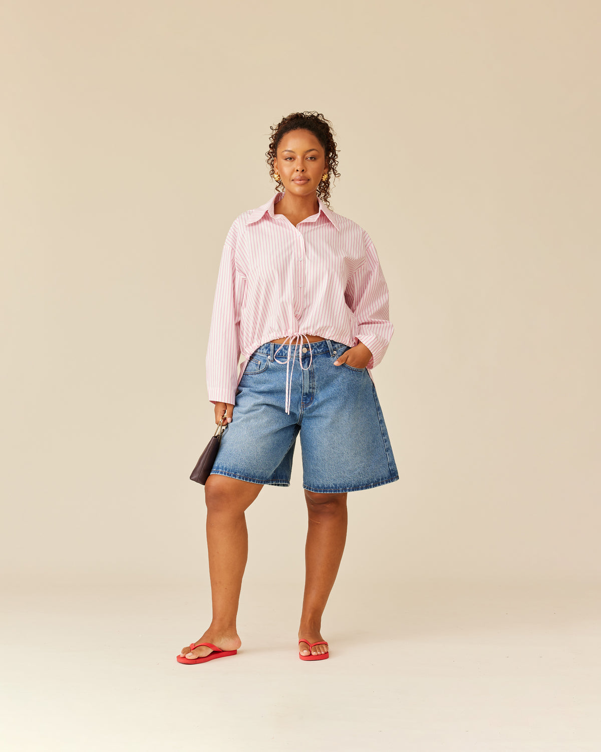 A twist on the classic button-up shirt, designed in a pink stripe organic cotton. Cropped at the front with an adjustable drawstring that can be worn open or cinched. Make it a set with our Butterfly Short.