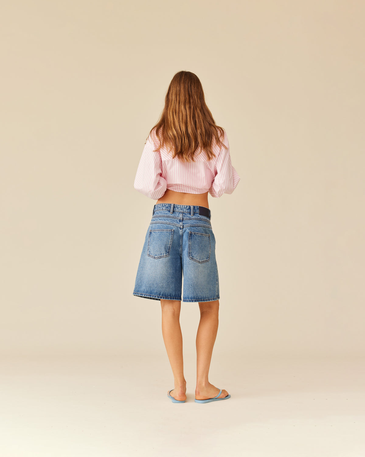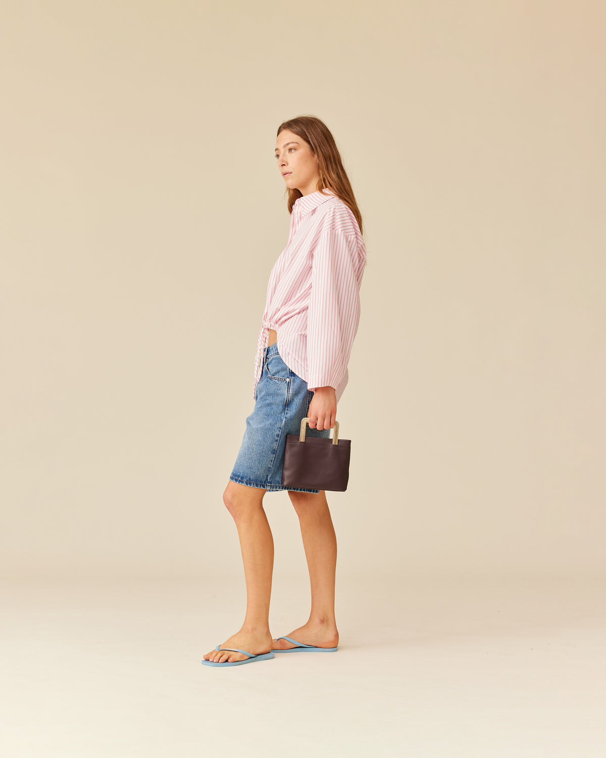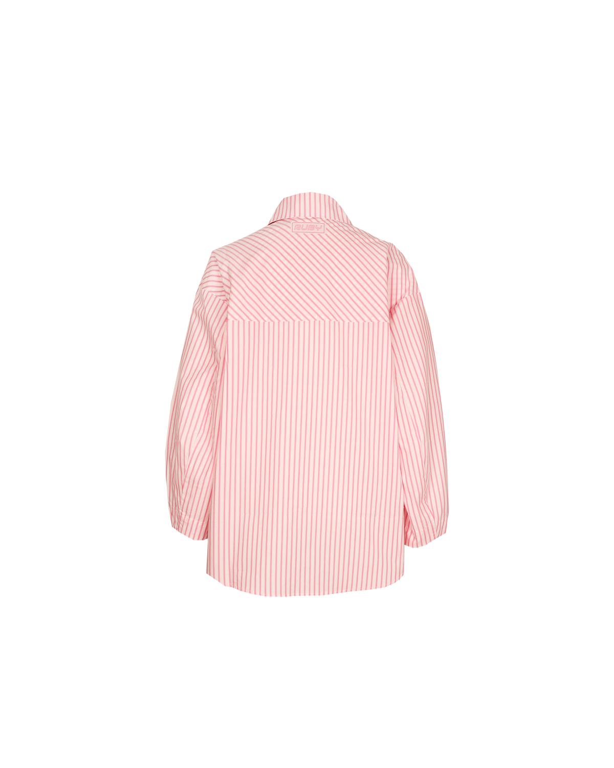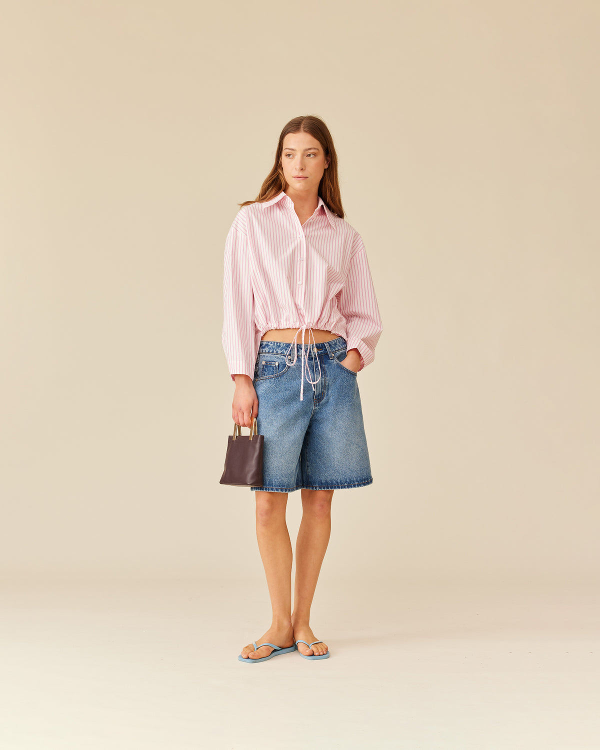 A twist on the classic button-up shirt, designed in a pink stripe organic cotton. Cropped at the front with an adjustable drawstring that can be worn open or cinched. Make it a set with our Butterfly Short.
