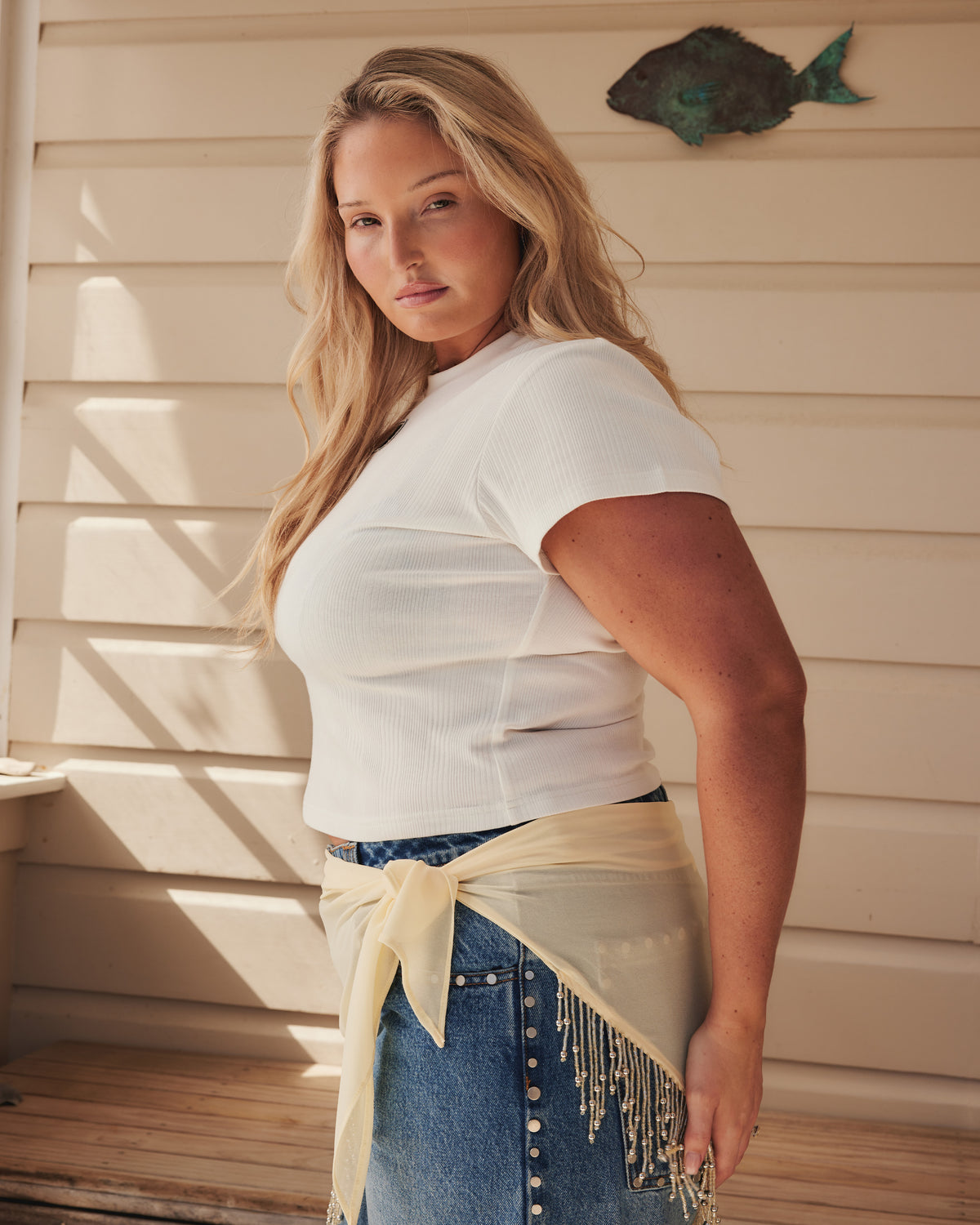 Cotton baby-tee designed in a super soft organic cotton ribbed knit. Features our RUBY flower logo on the front. This tee pairs perfectly with our Icon Studded Jean, a barrel-leg jean designed in our signature midtown blue wash denim with studded seams. Sits mid-waisted with classic 5 pocket and waistband detailing. The look is finished off with our Abi Scarf, A Sheer chiffon scarf designed with feature beaded tassels along 2 sides. This piece is perfect for summer styling as you can wear it multiple ways; around your waist as a wrap layer over shorts and pants, as a sarong, styled as a headscarf or try tying it as a bandeau top.