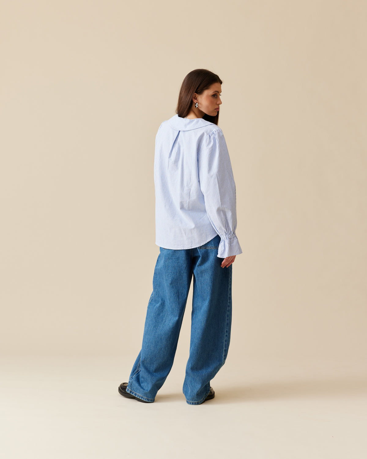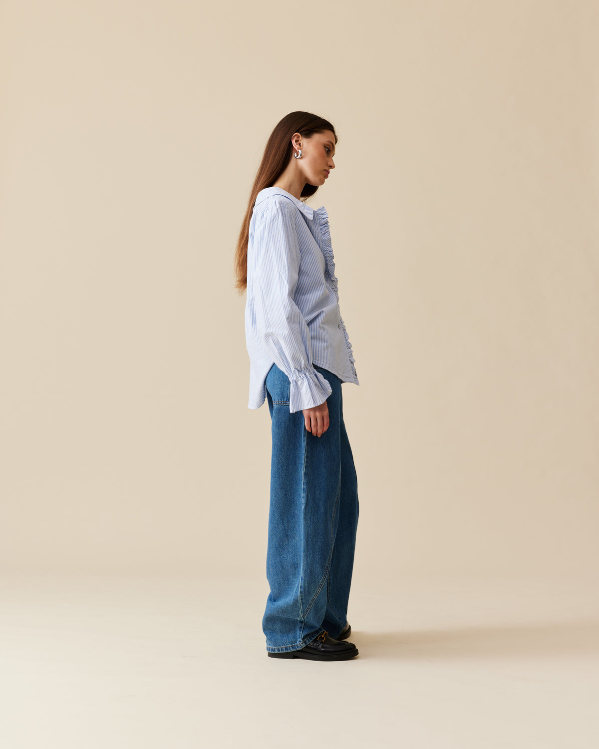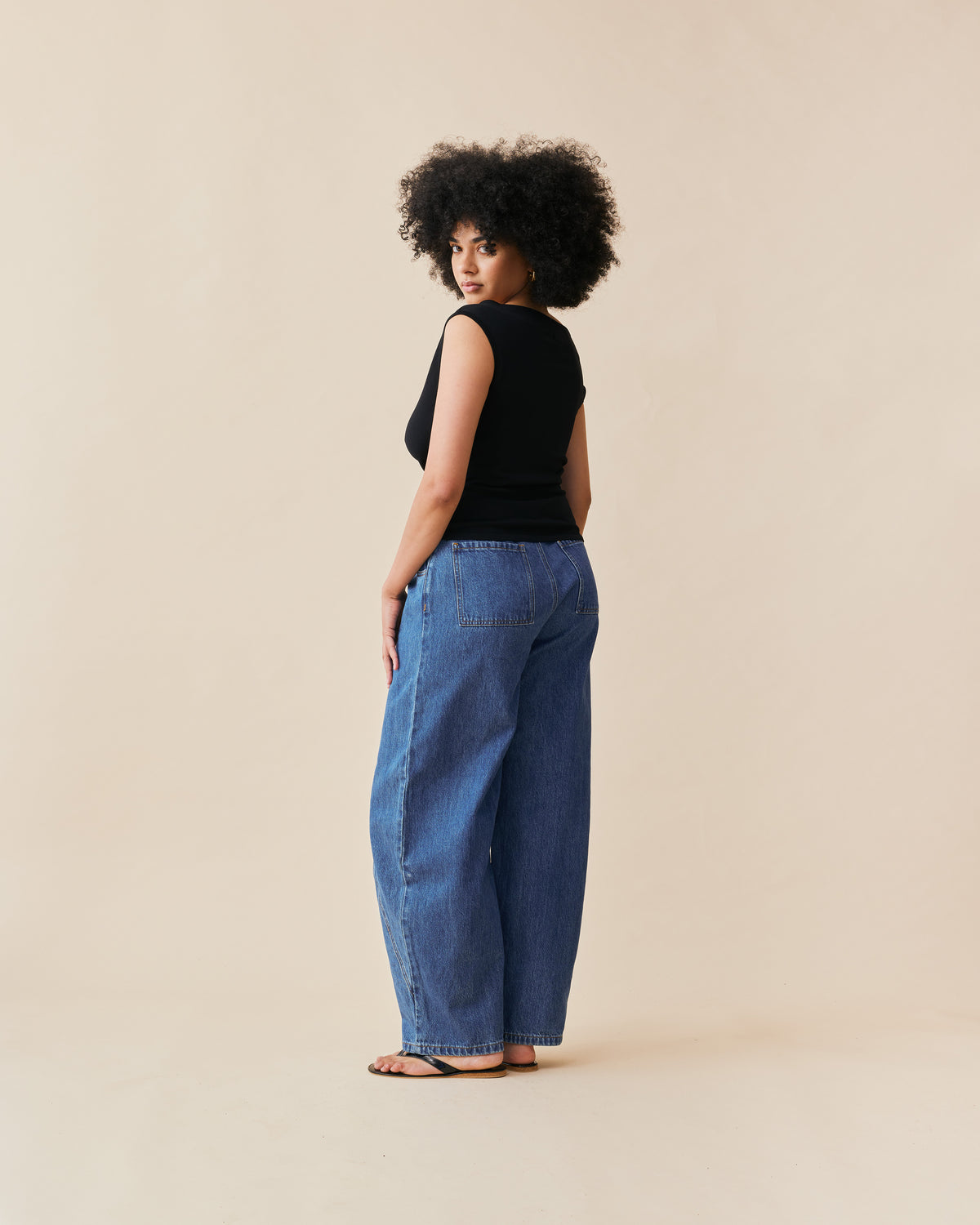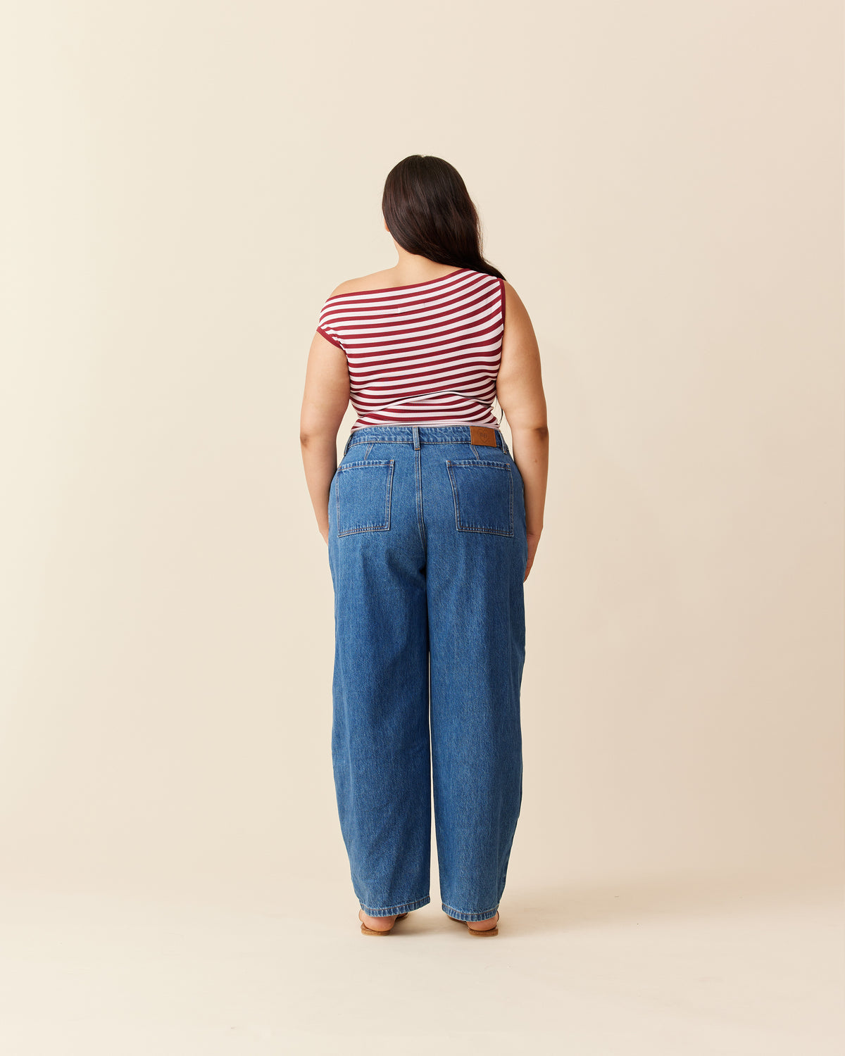 Barrel-leg jean designed in an indigo wash denim. Sits mid-waisted and features panel detailing down the front that wraps to the side seam.