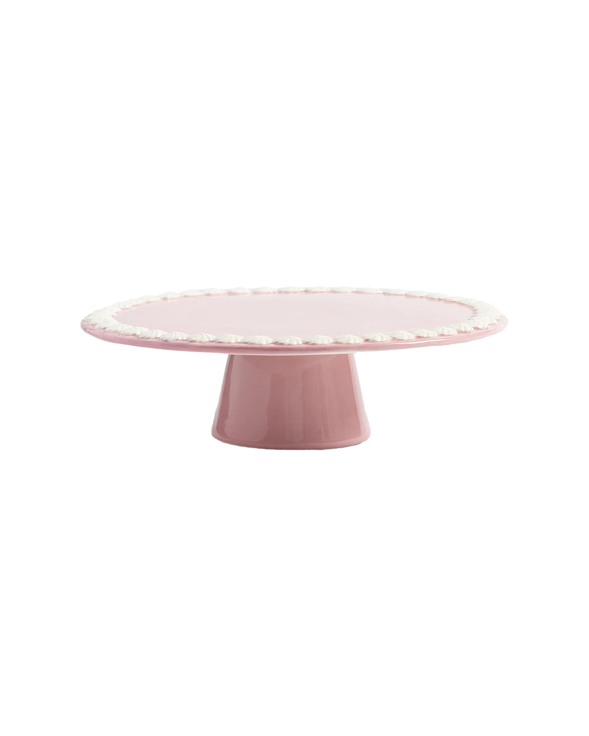 Candy pink ceramic cake platter with a feature white swirl border. The ultimate serving dish for special occasions.