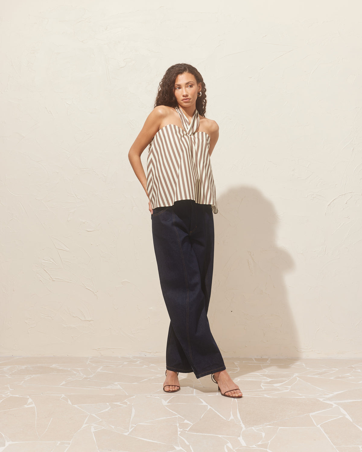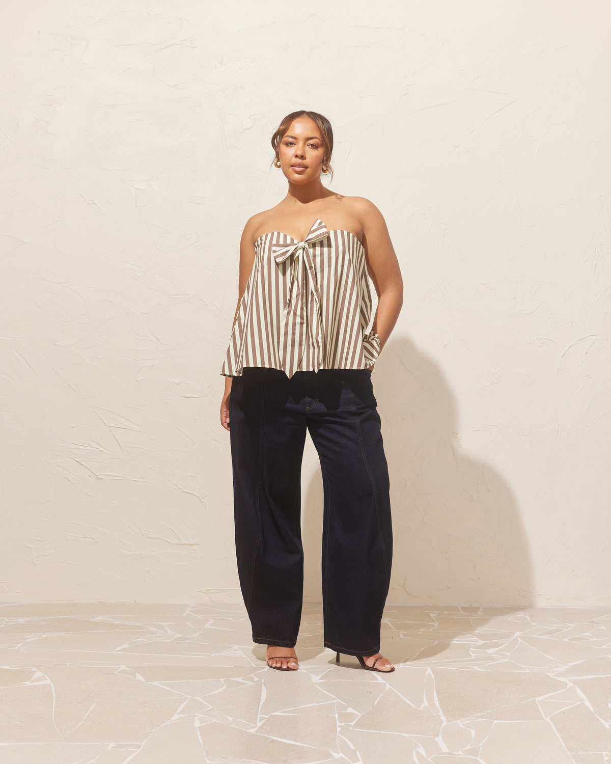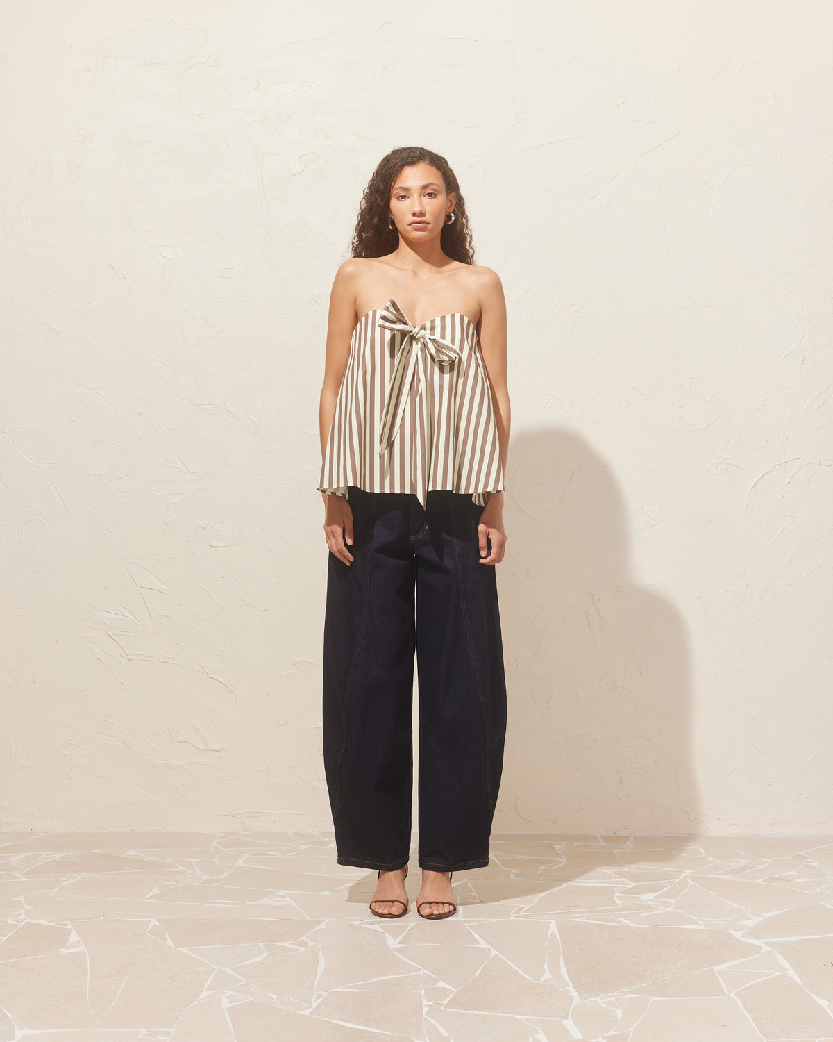 Bodice-style top that appears floaty and relaxed, but is supportive against the body with hidden boning detailing underneath. This top has a feature bow at the centre, that can be worn as a halter tie if you wish.