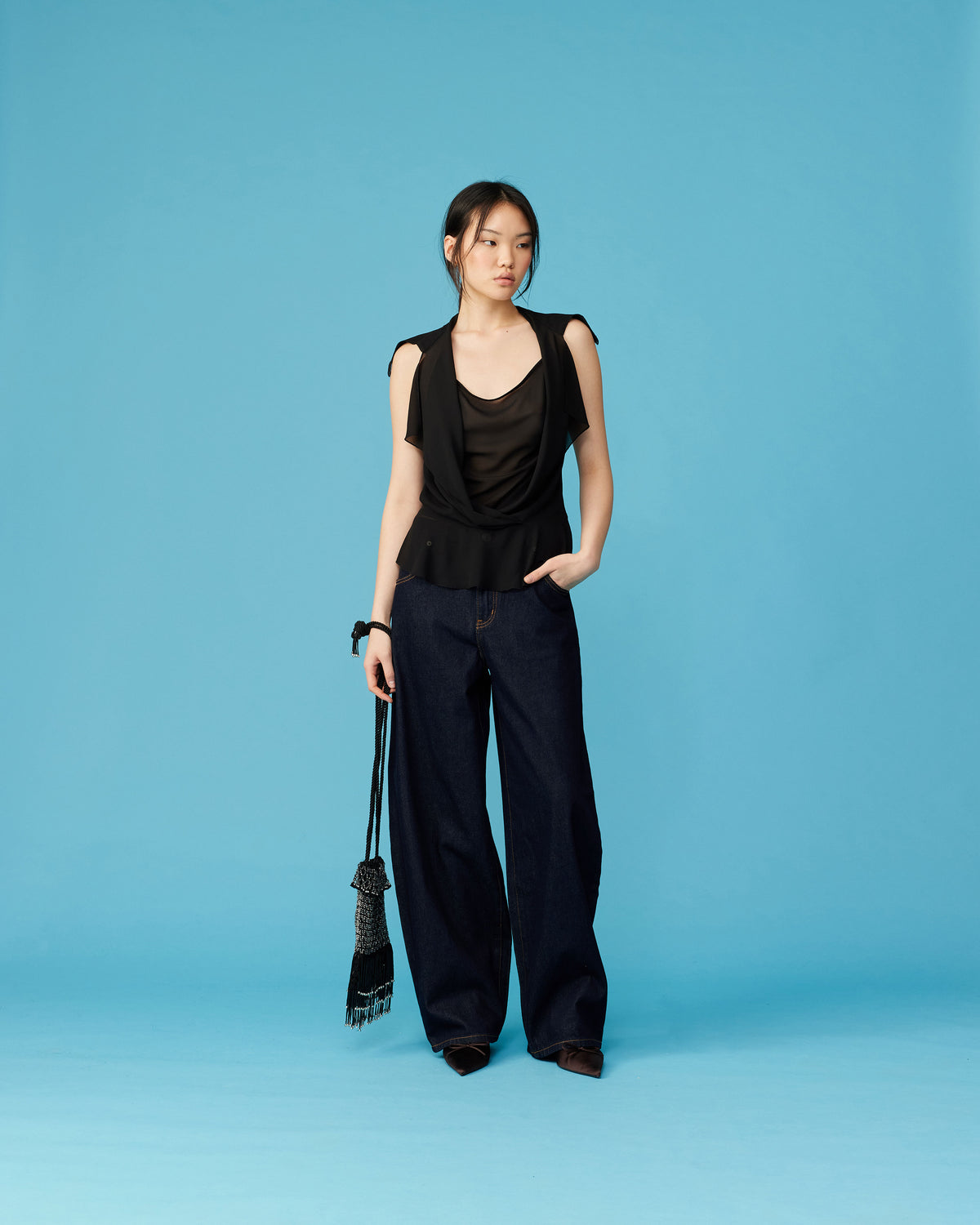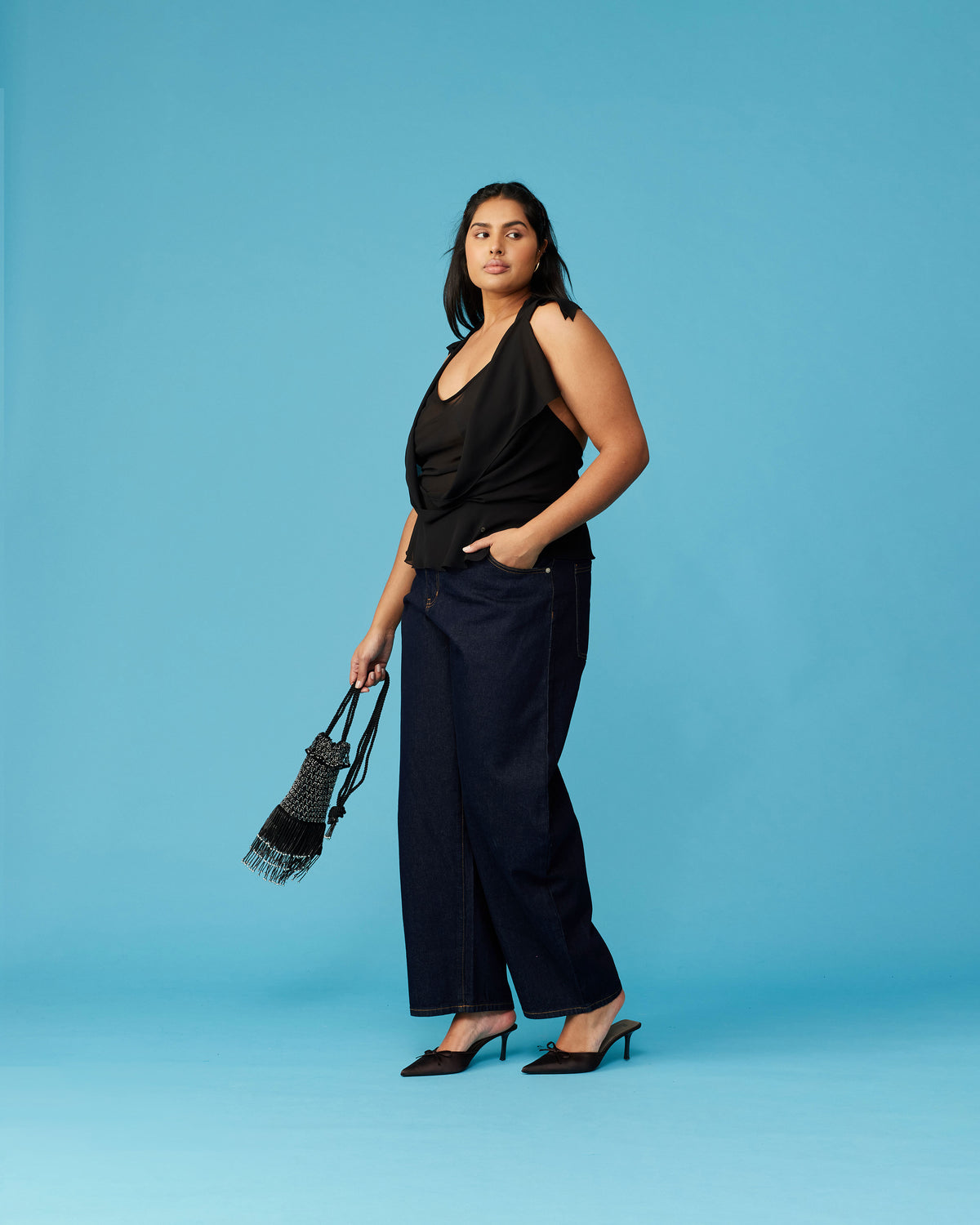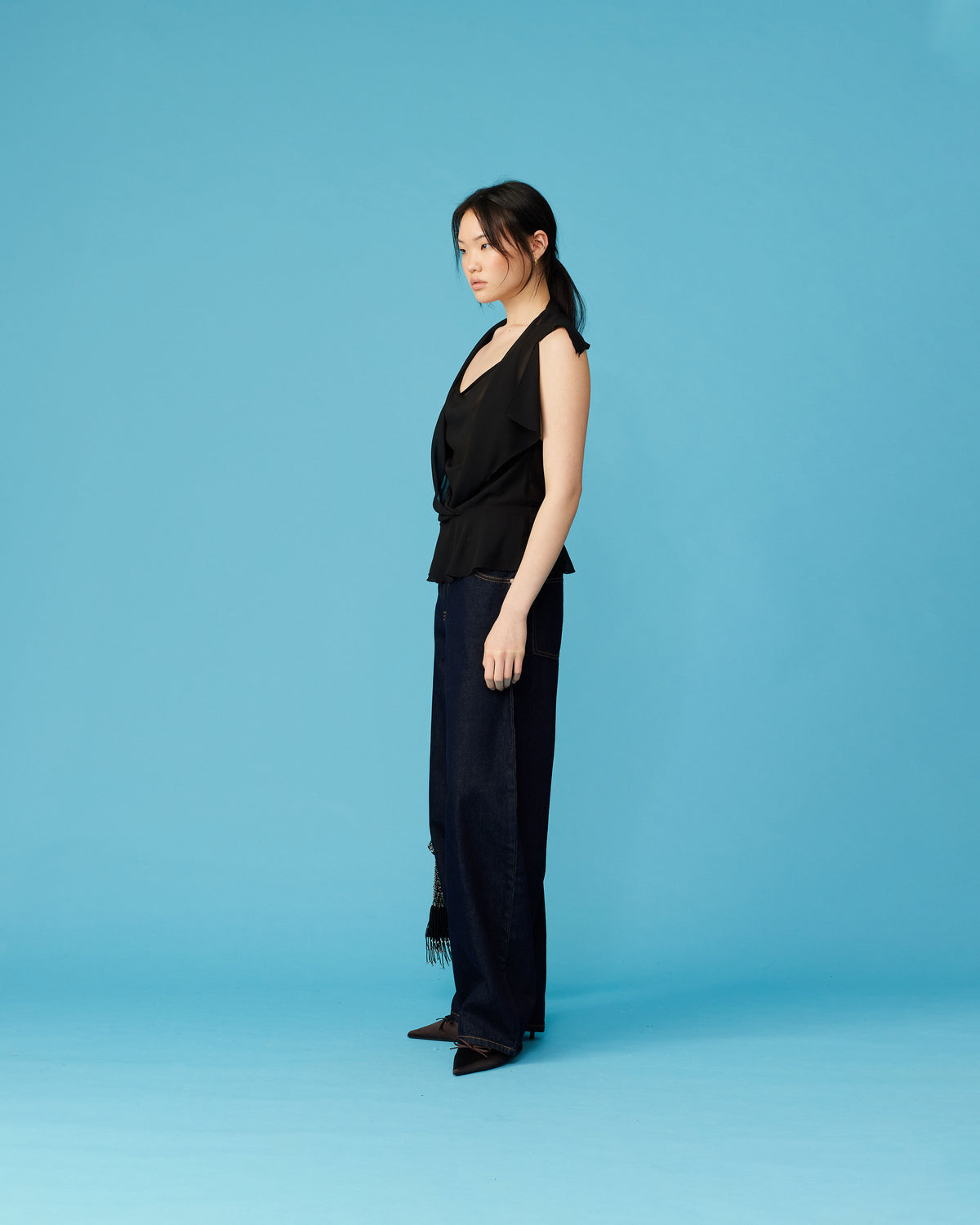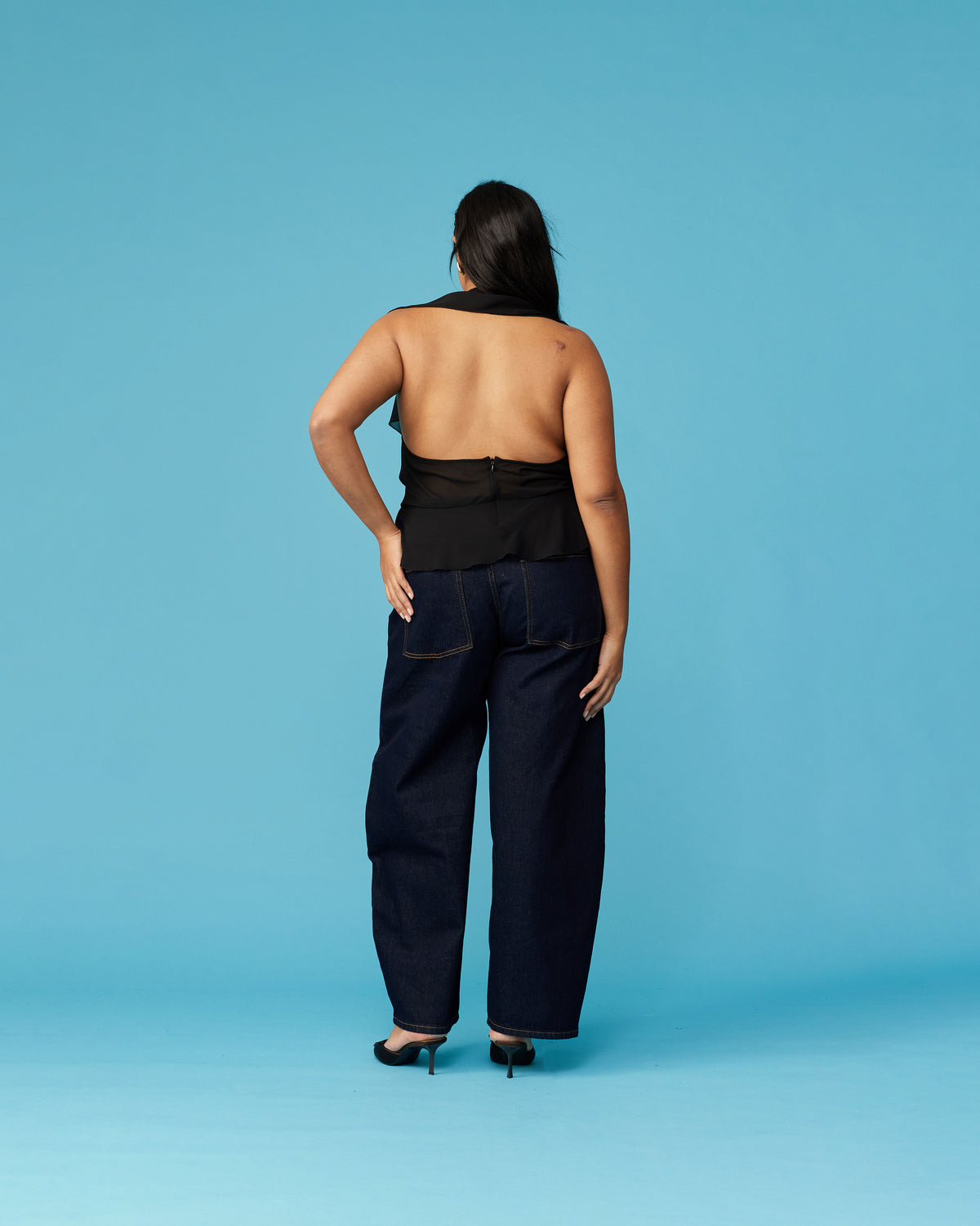 Sheer chiffon top with a plunge cowl neck, halter silhouette, and low back. Designed with cascading ruffles for soft movement and a statement finish.