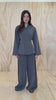 A collarless blazer designed in a charcoal mid-weight suiting fabric. Features a cinched waist and slightly flared sleeves, giving a structured silhouette.