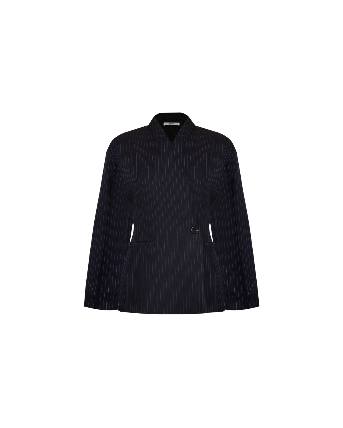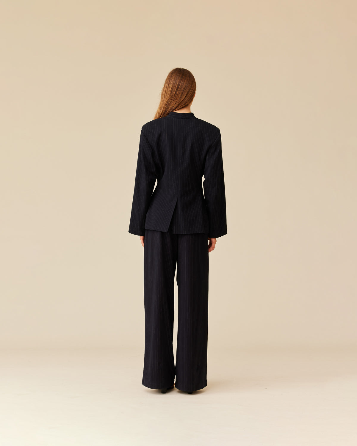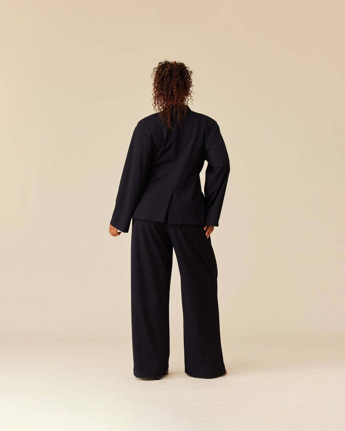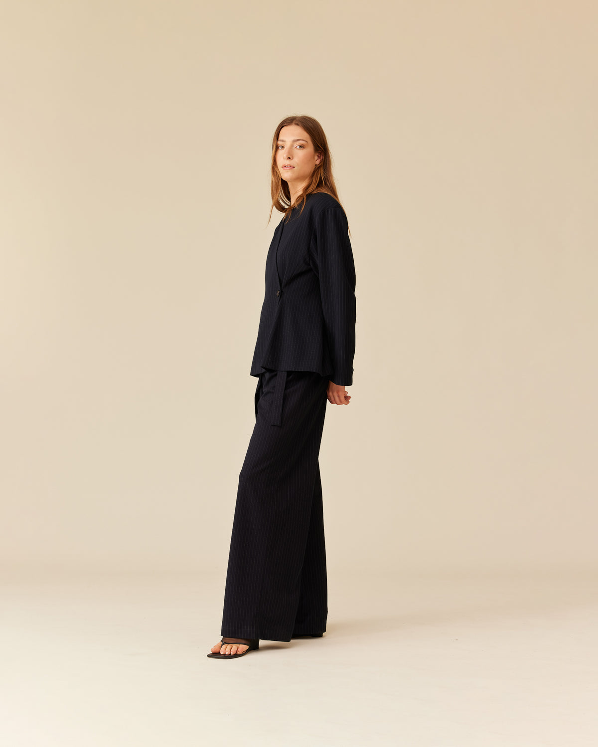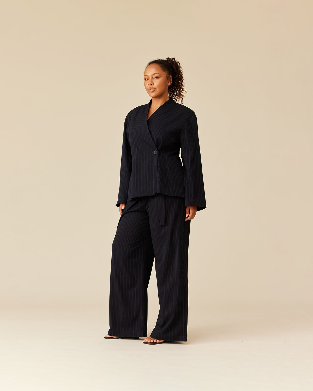 A collarless blazer designed in a mid-weight suiting fabric. Features a cinched waist and slightly flared sleeves, giving a structured silhouette. Make it a set by matching this blazer with our Sasha Wrap Pant.
