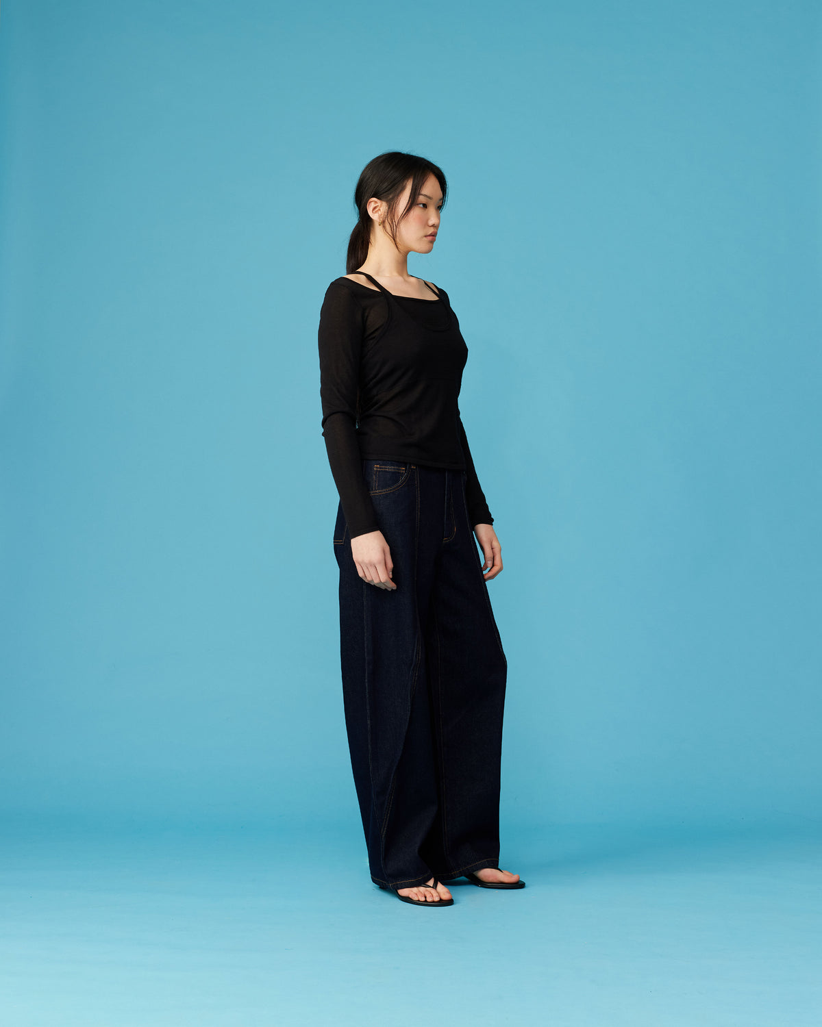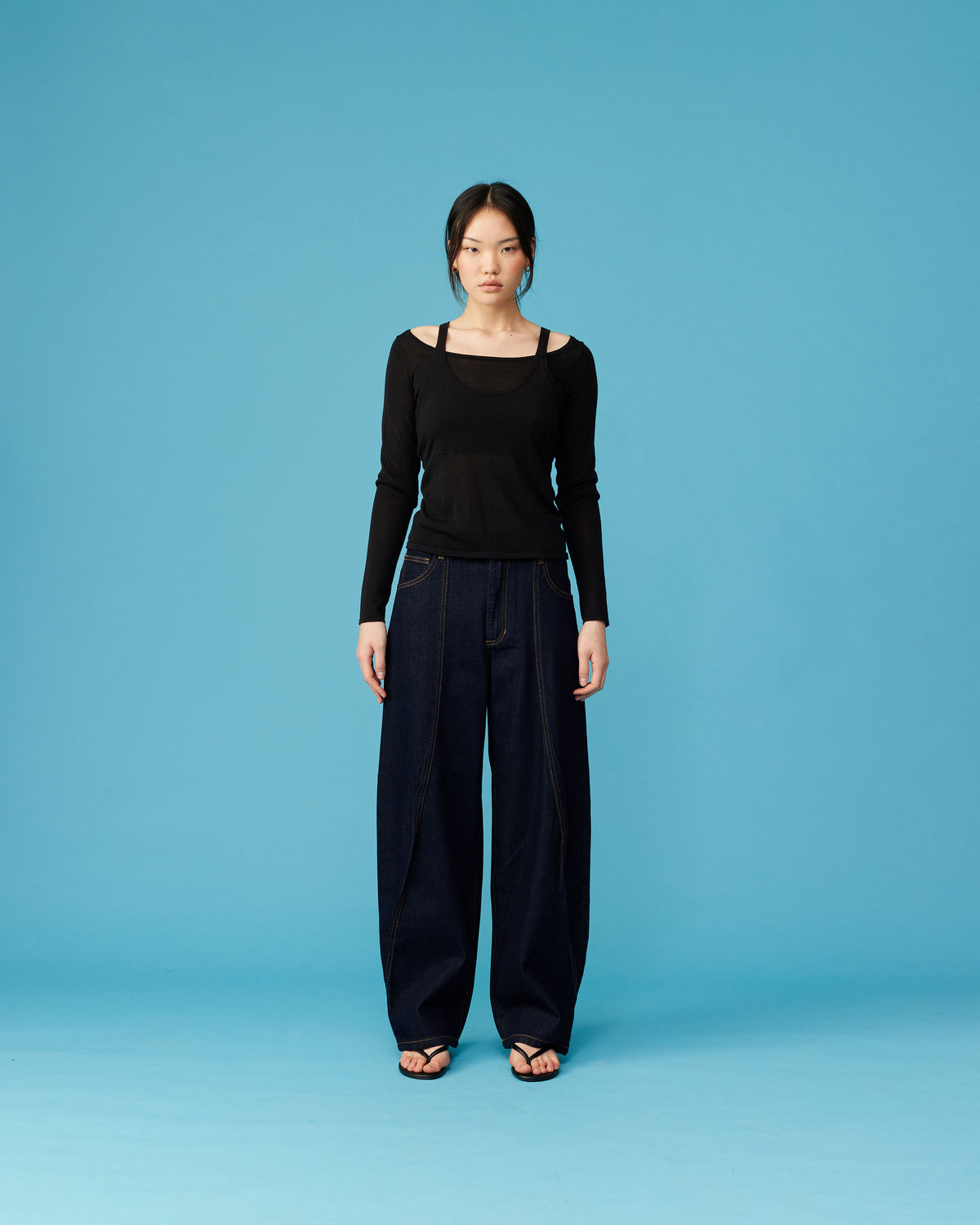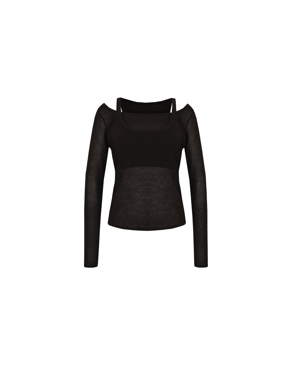 Long sleeve top with a layered tank top in a lightweight semi-sheer black knit. An elevated everyday staple designed with added depth and texture.