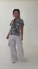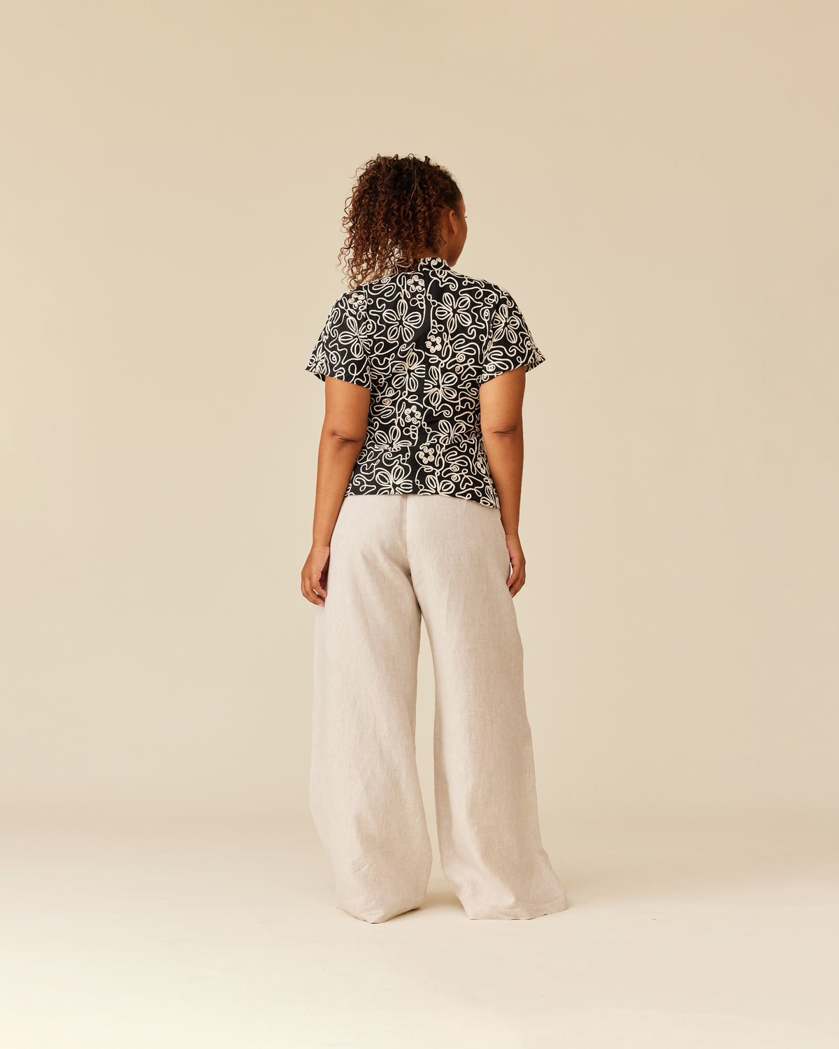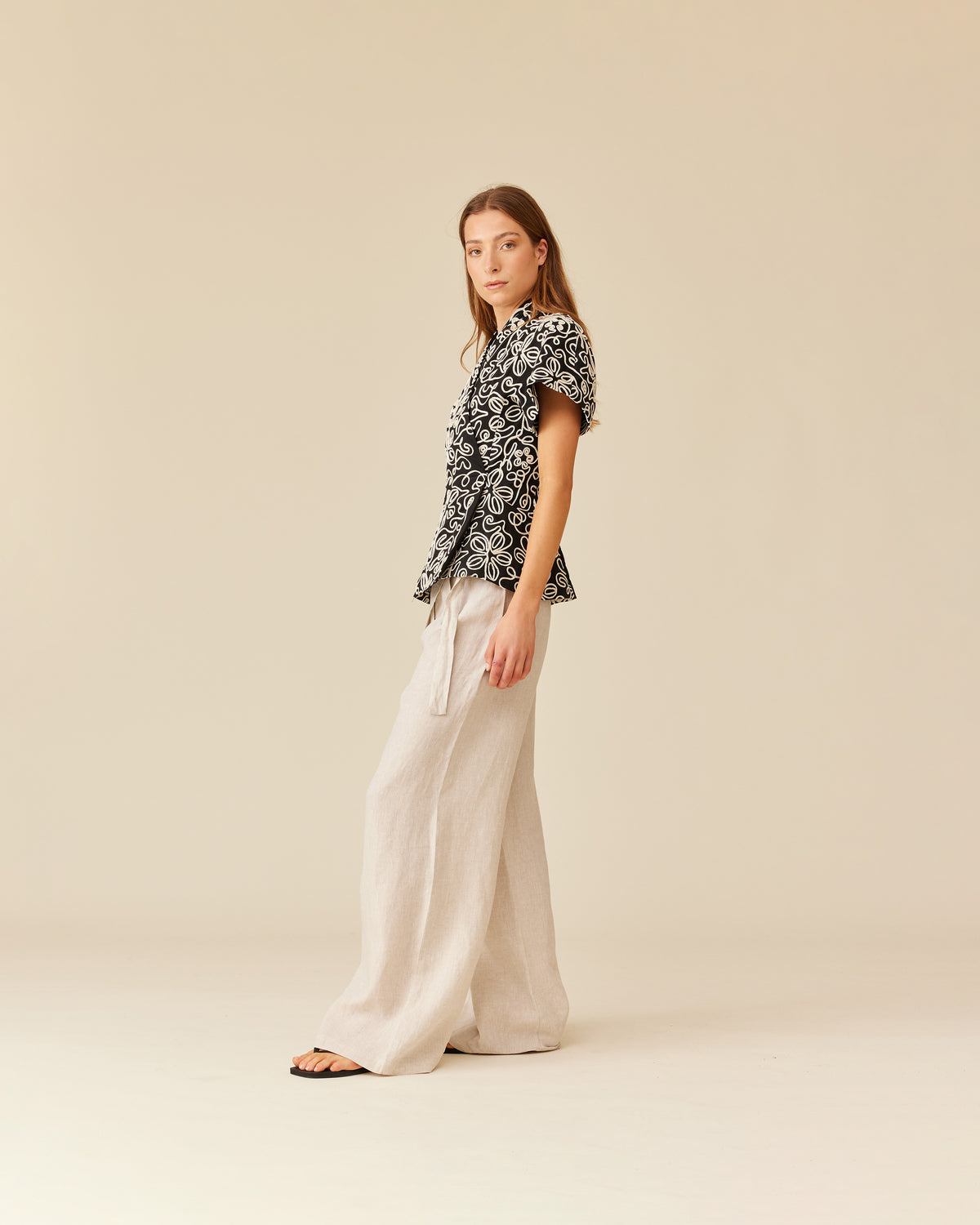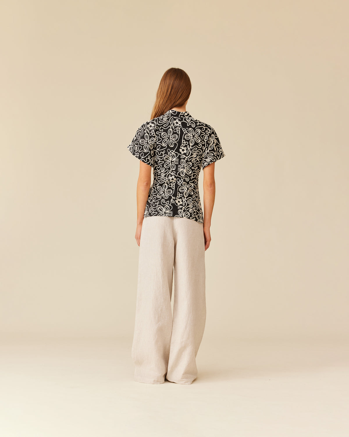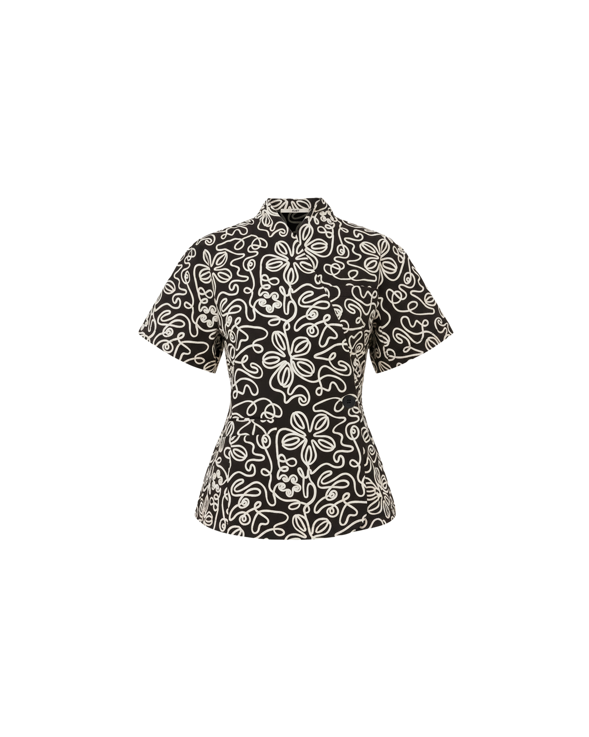A collarless blazer style top designed in our bold embroidered sardinia floral. Features a wrap over cinched waist and slightly flared sleeves, giving a structured silhouette.