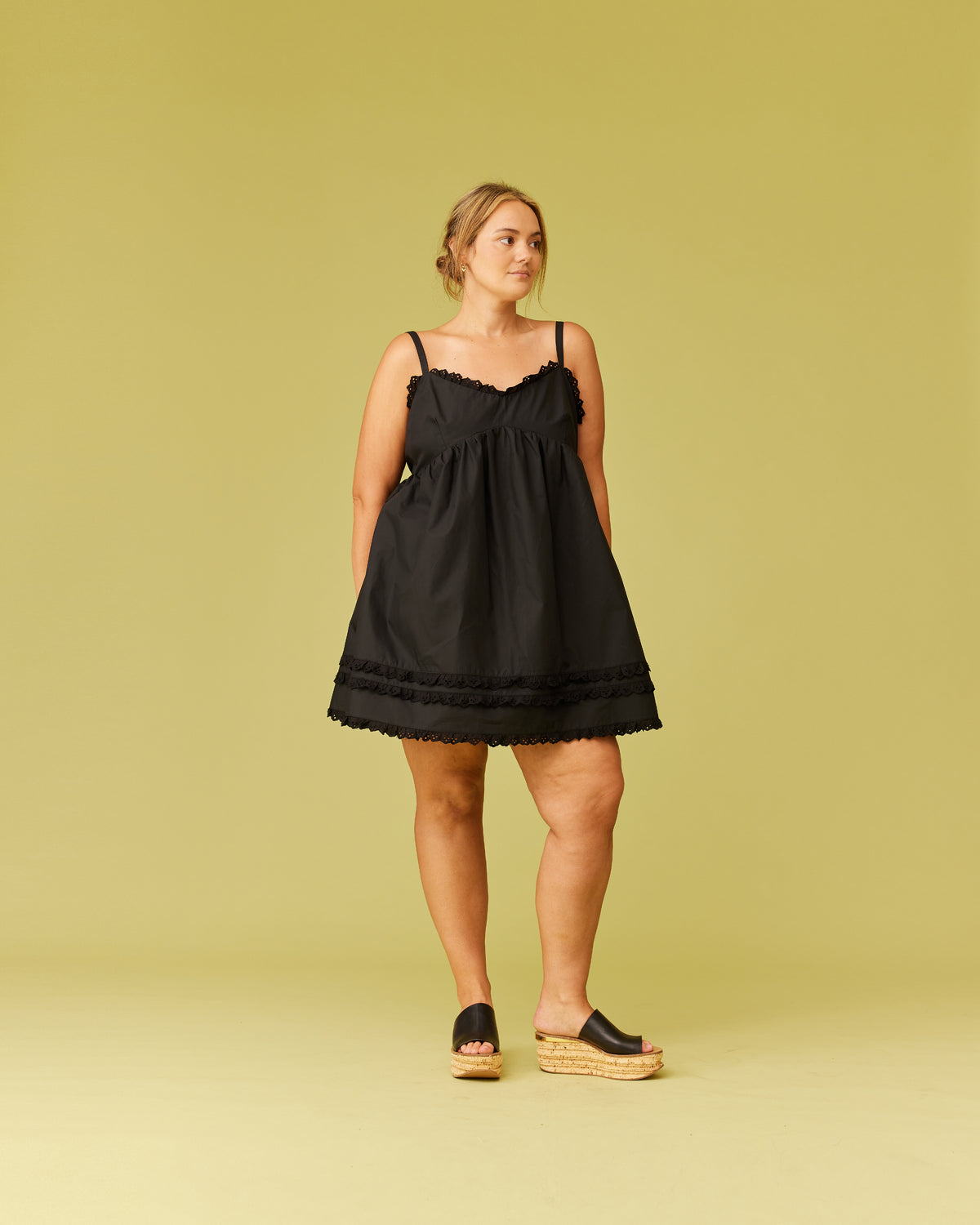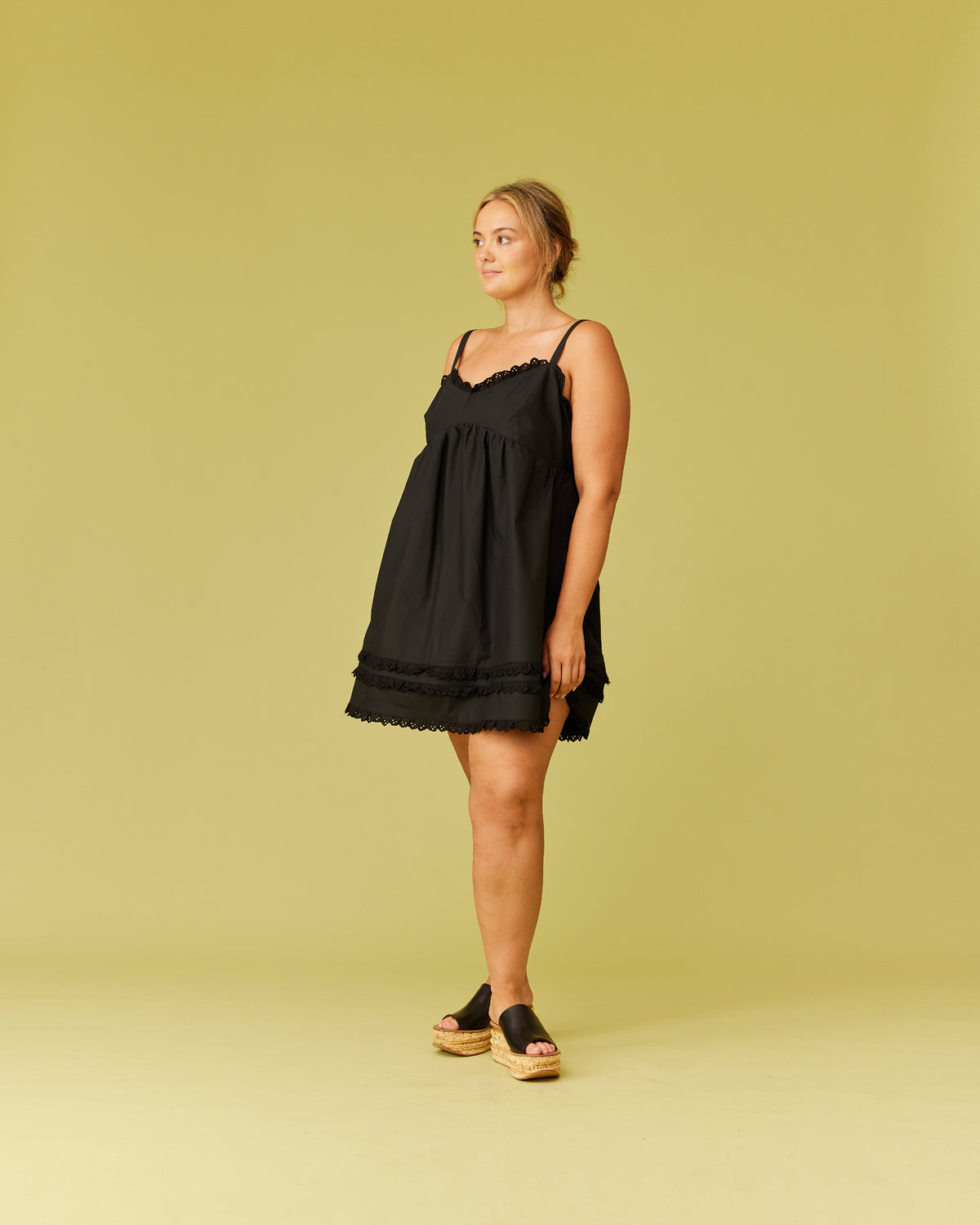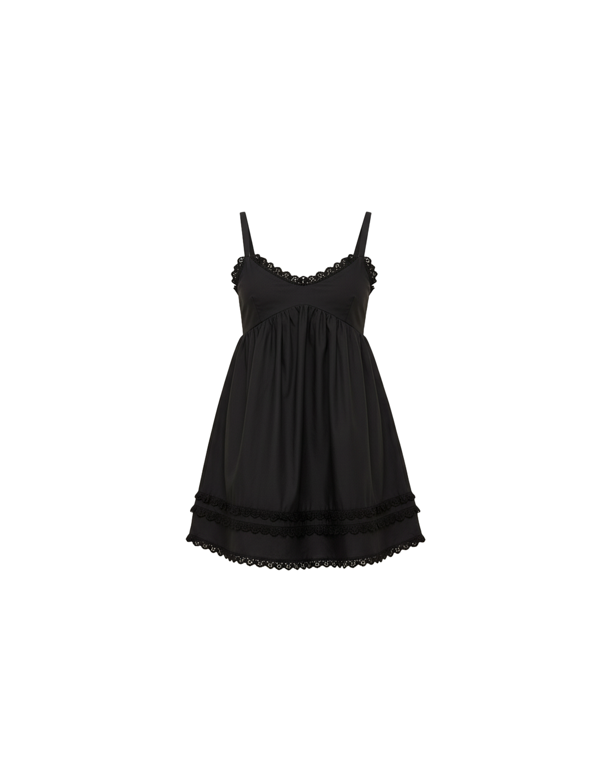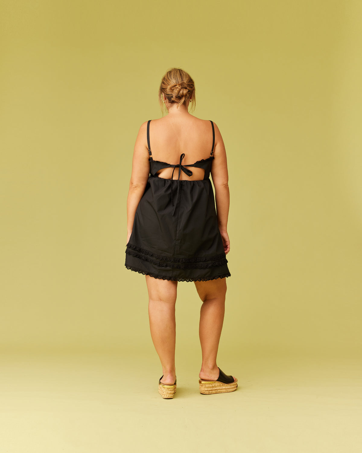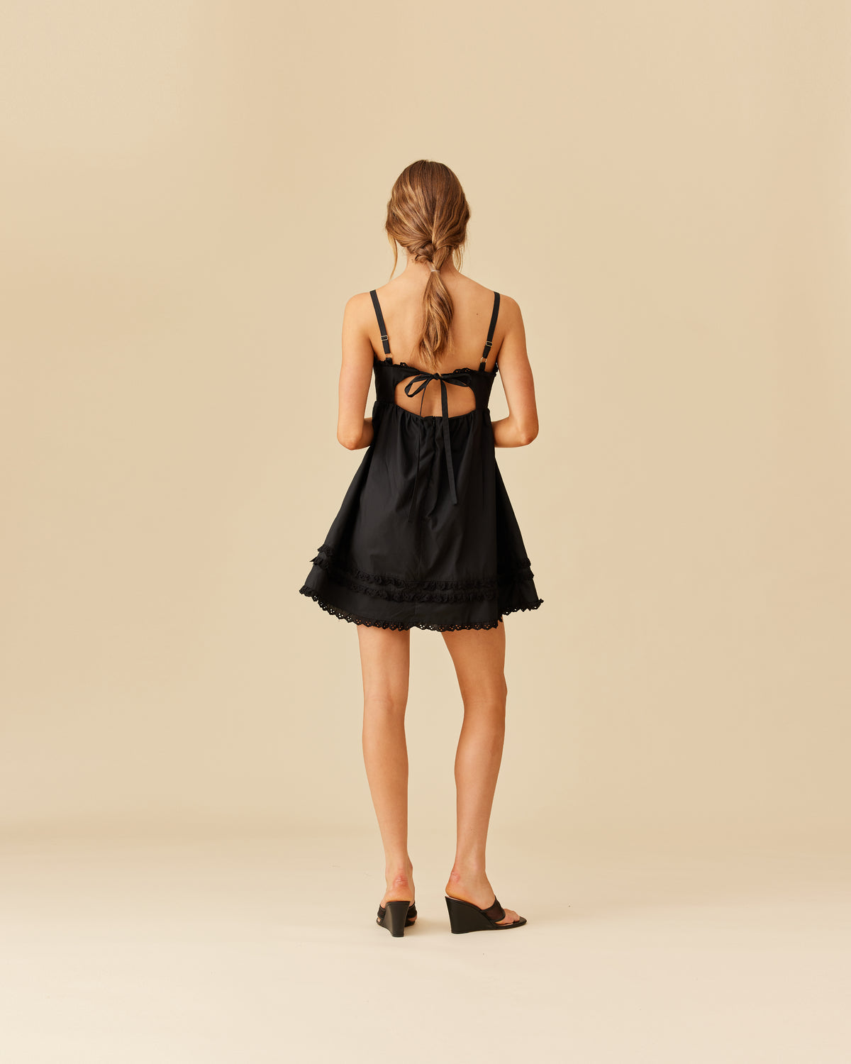 Embroidered lace trimmed mini dress with a sweetheart neckline and a floaty tiered hem. This dress turns to reveal a bow tie at the back, which compliments the romantic look.