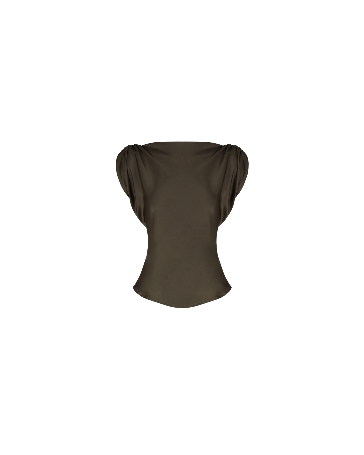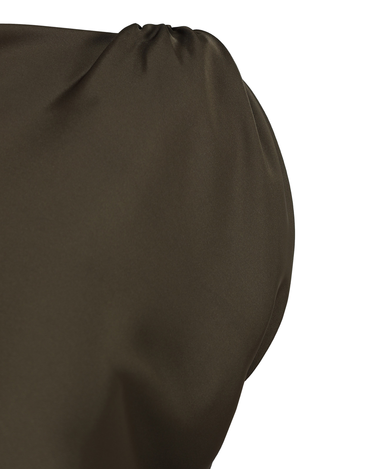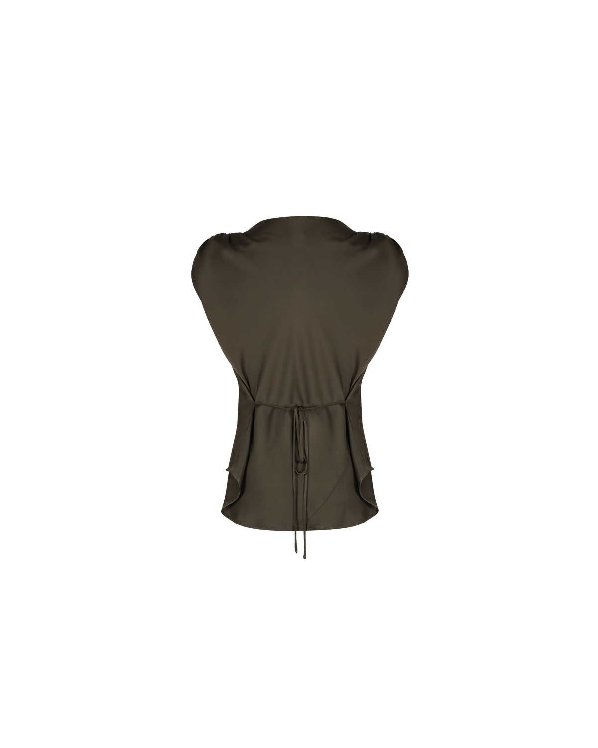 Bias cut cap sleeve blouse crafted in a lush black satin. This piece has ruched detail at the shoulder, a tie to cinch in the waist and a high neckline that falls to give a soft cowl effect.