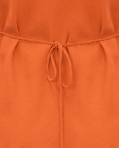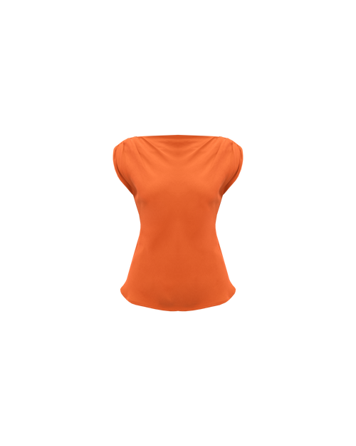 Bias cut cap sleeve blouse crafted in a lush orangeade cupro. This piece has ruched detail at the shoulder, a tie to cinch in the waist, and a high neckline that falls to give a soft cowl effect.