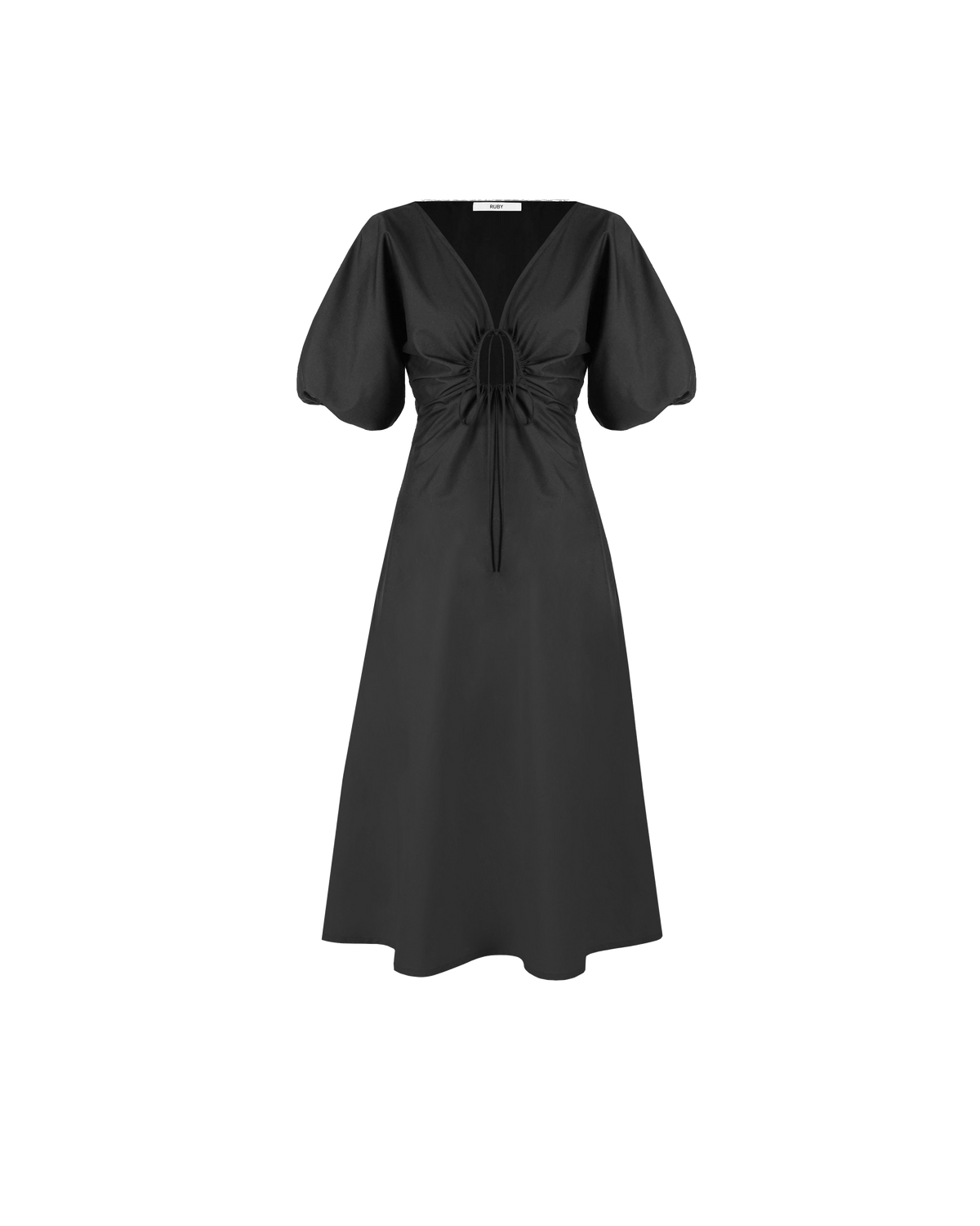 Cotton A-line midi dress with short batwing sleeves and keyhole opening with a tie detail at the centre neckline. The tie can be used to cinch in your waist, the piece then falls to an A-line skirt creating a soft silhouette.