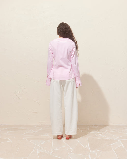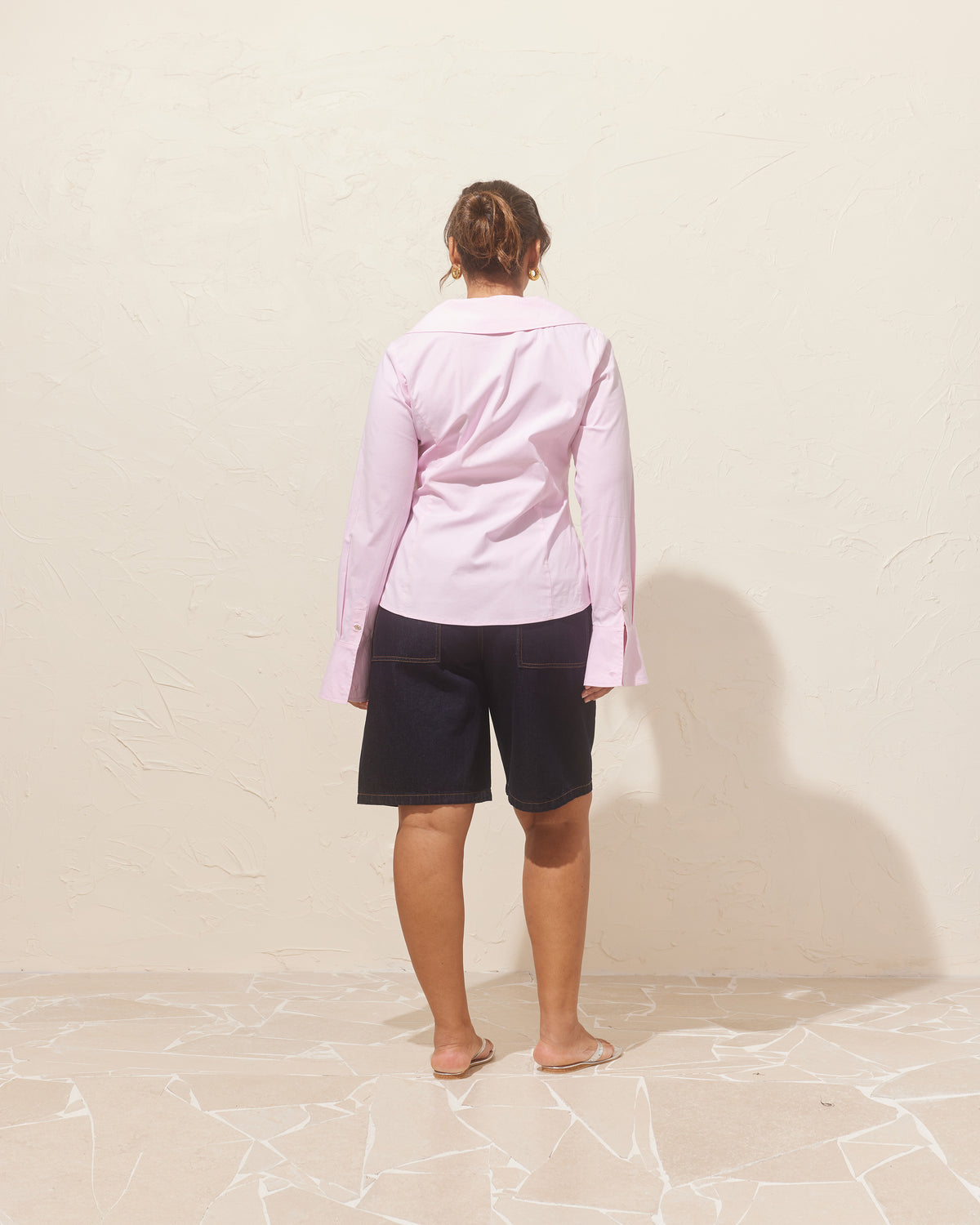 A RUBY spin on a classic shirt shape, Eddie is a crisp pink shirt that will bring fun into your wardrobe. Features a close fit that nips in at the waist, bias cut, oversized collar, and wide cuffs.