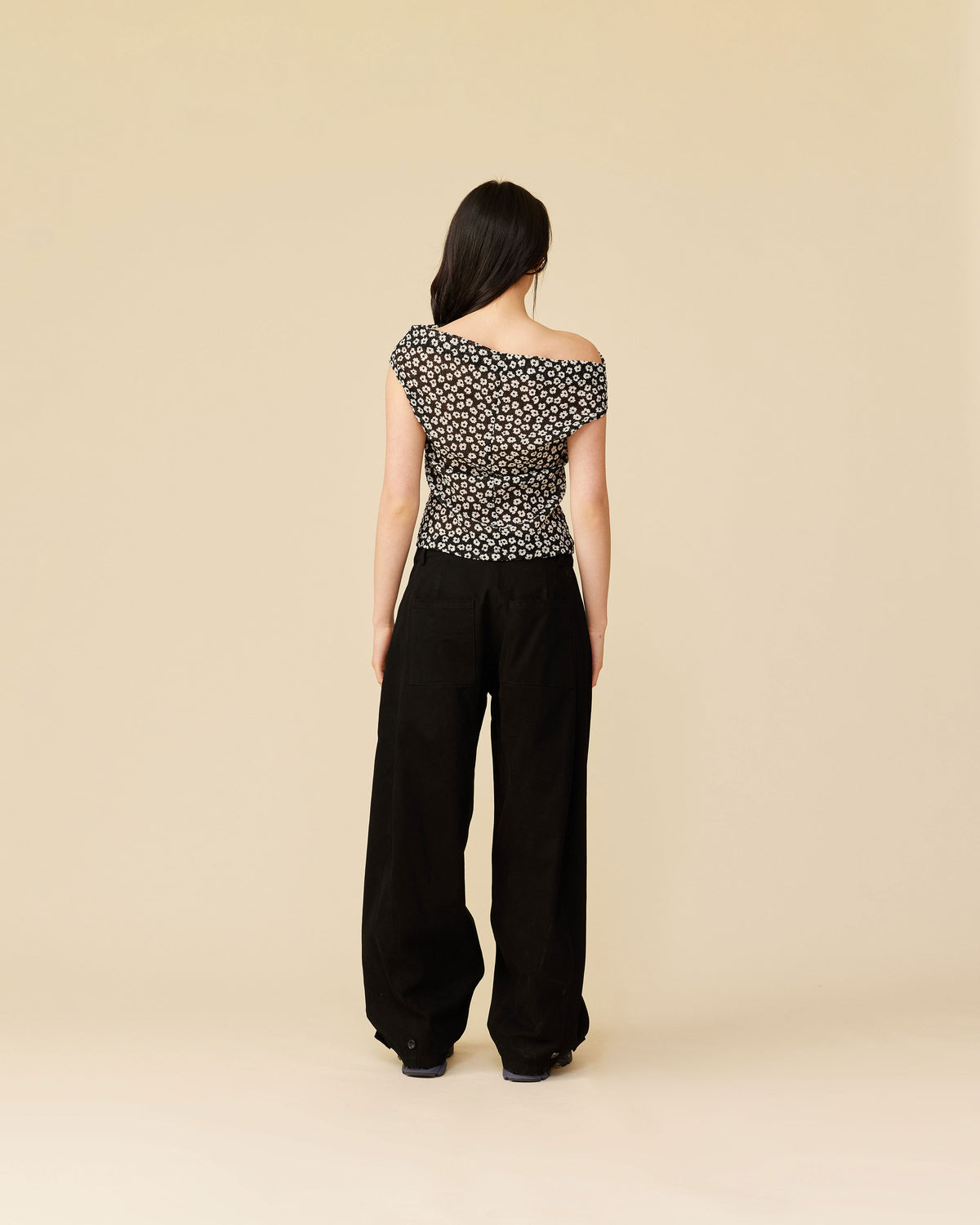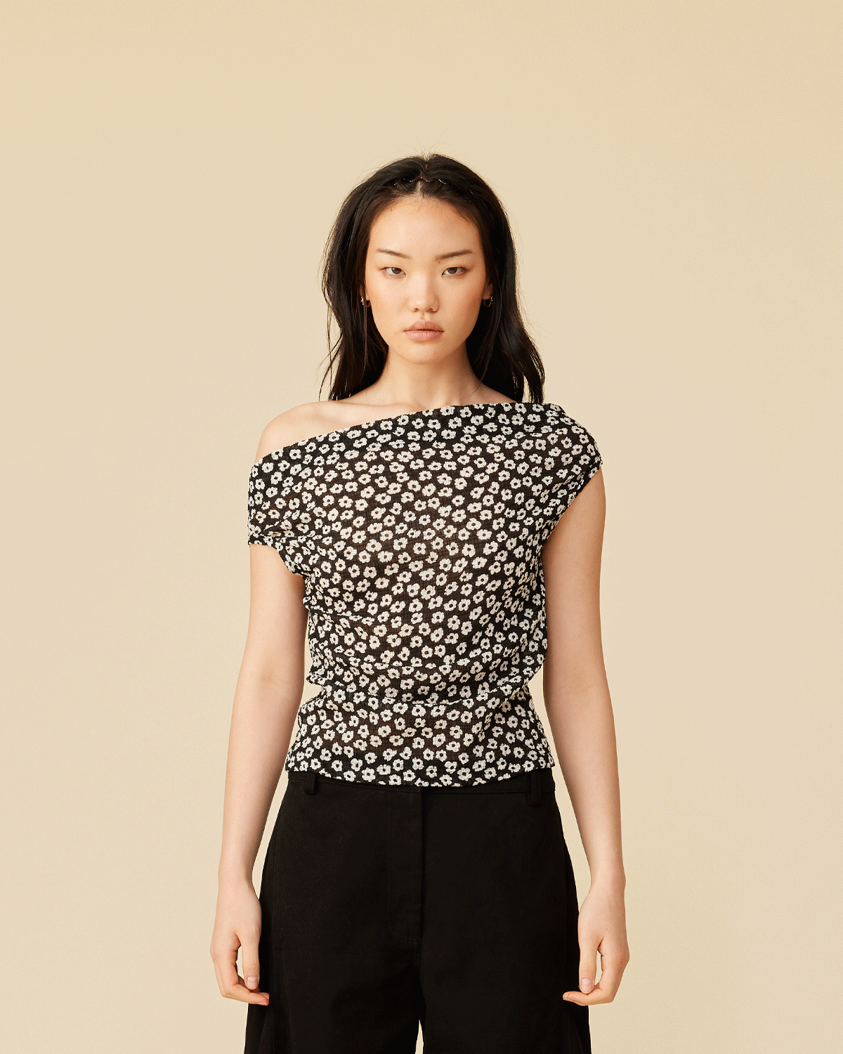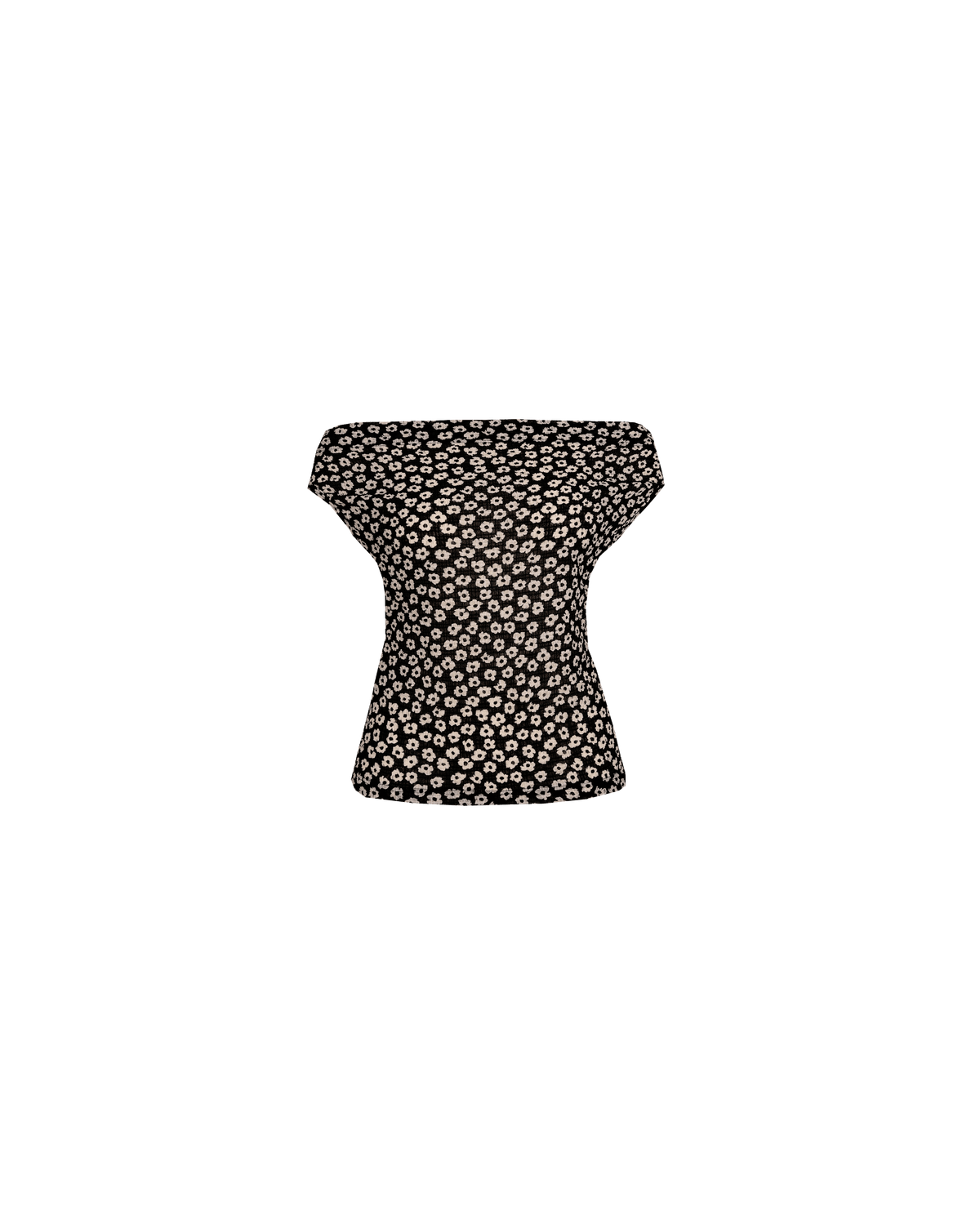 Off-shoulder top crafted in a light-weight black floral fabric with a crinkle texture. This top is simple yet elegant and can be worn on or off the shoulder.