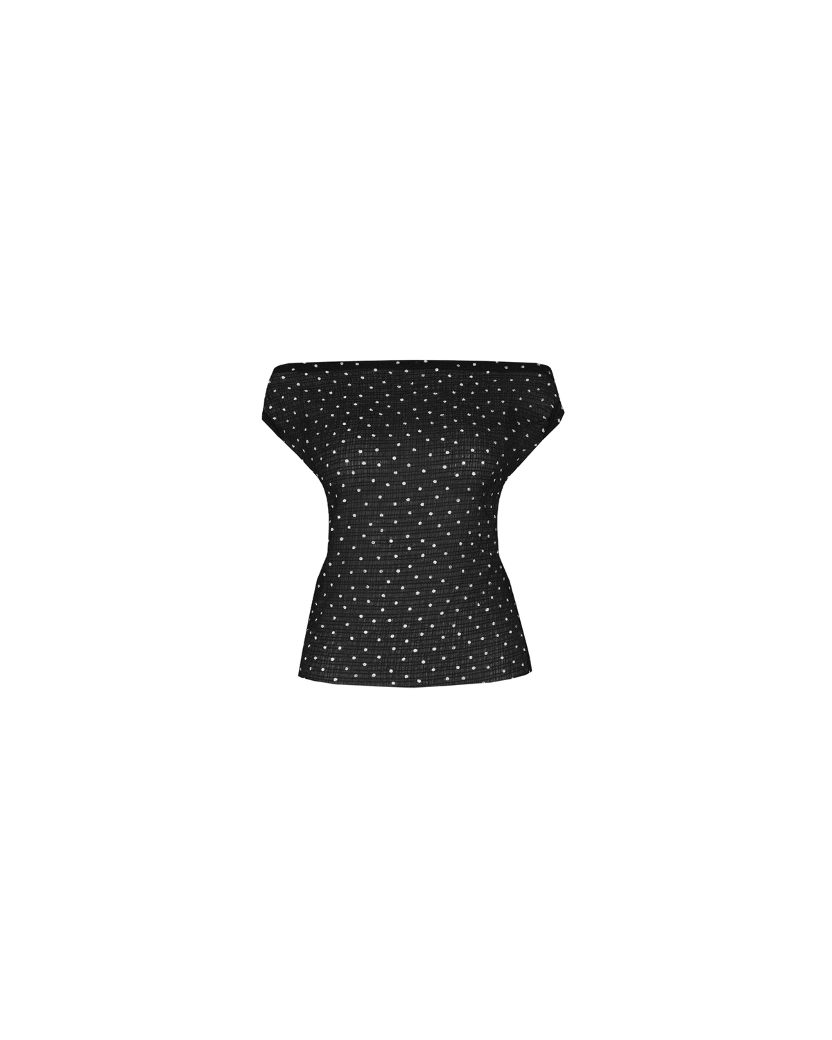 Off-shoulder top crafted in a light-weight polka dot fabric with a crinkle texture. This top is simple yet elegant and can be worn on or off the shoulder.