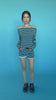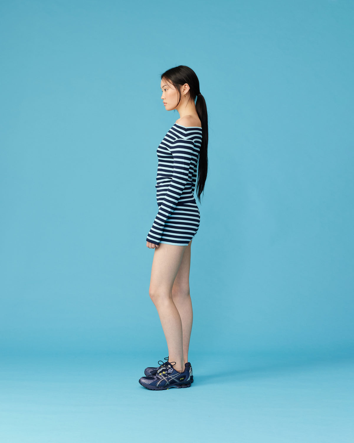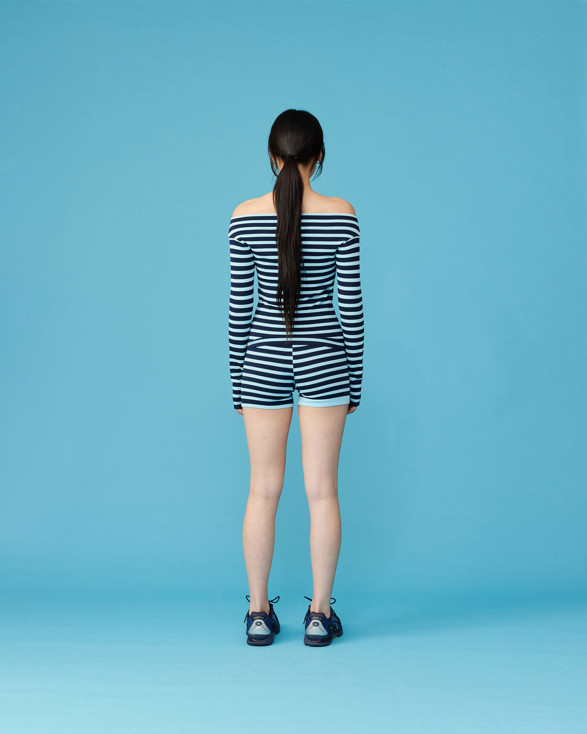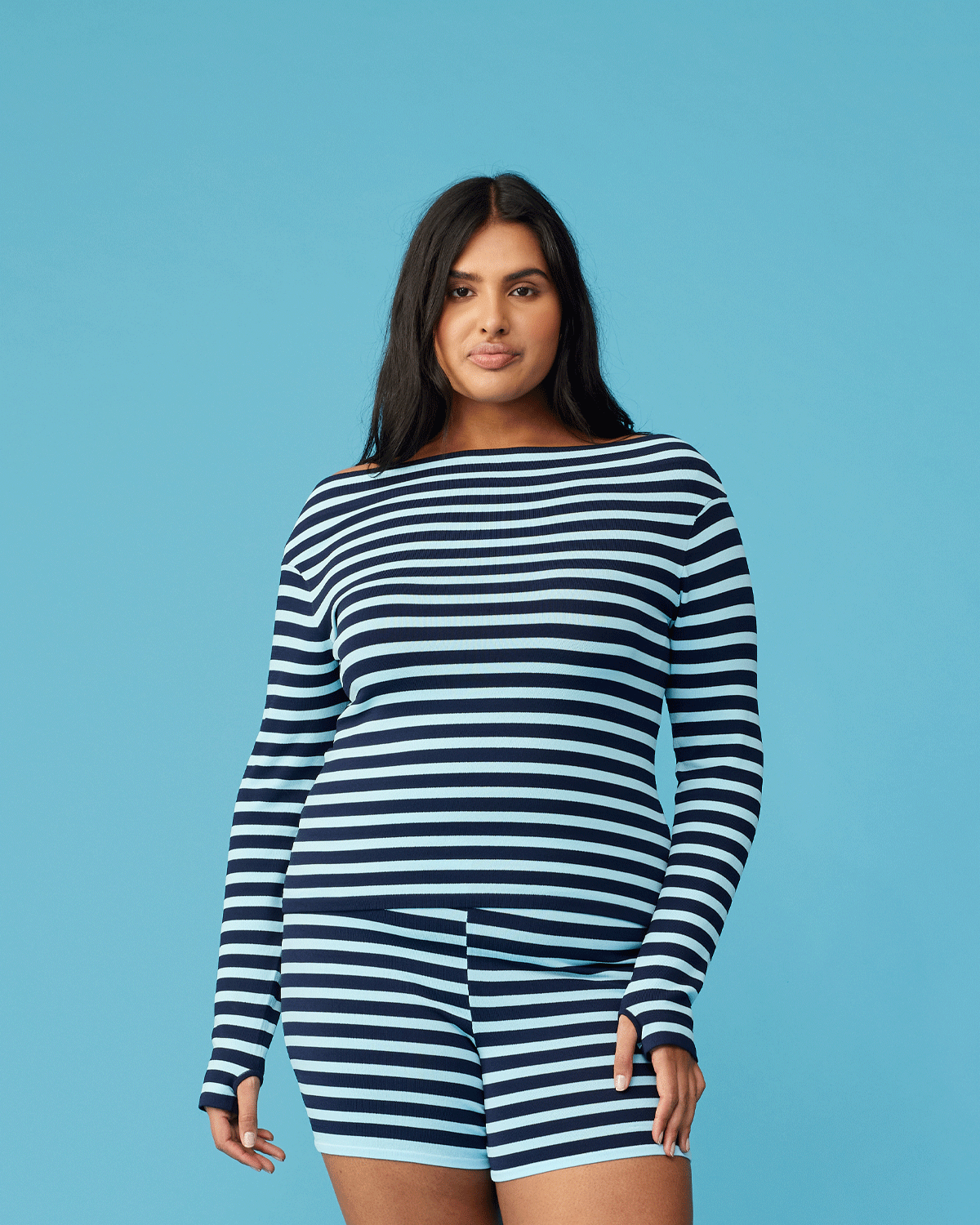 Off-shoulder long sleeve knitted top crafted in a baby blue and navy striped mid-weight knit. This top is simple yet elegant and can be worn on or off the shoulder. Make it a set by pairing this top with the matching Marla Short.