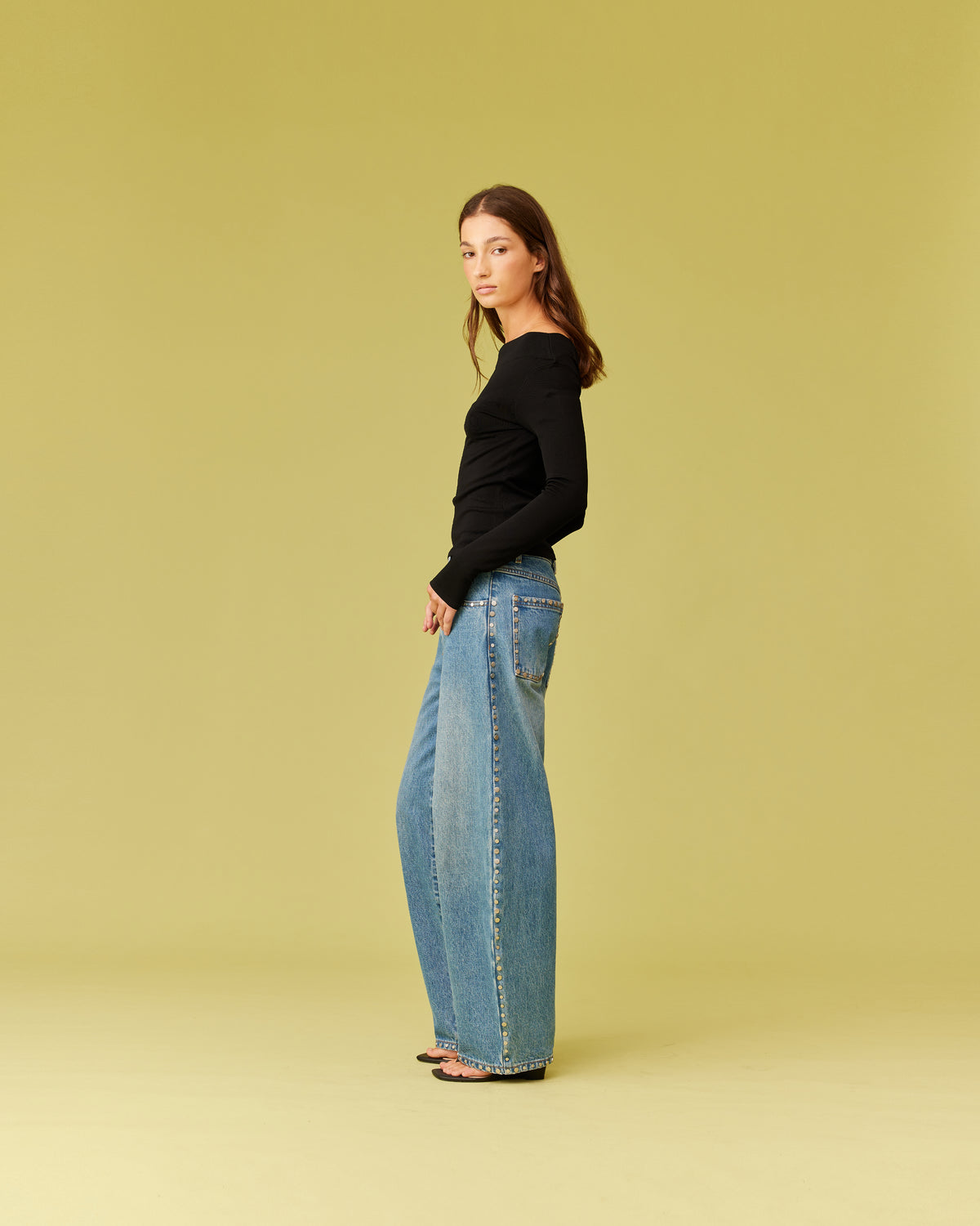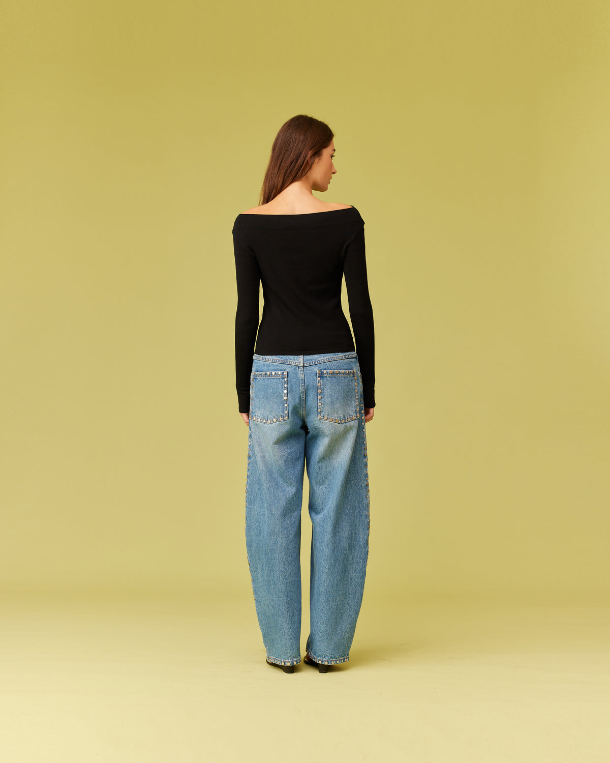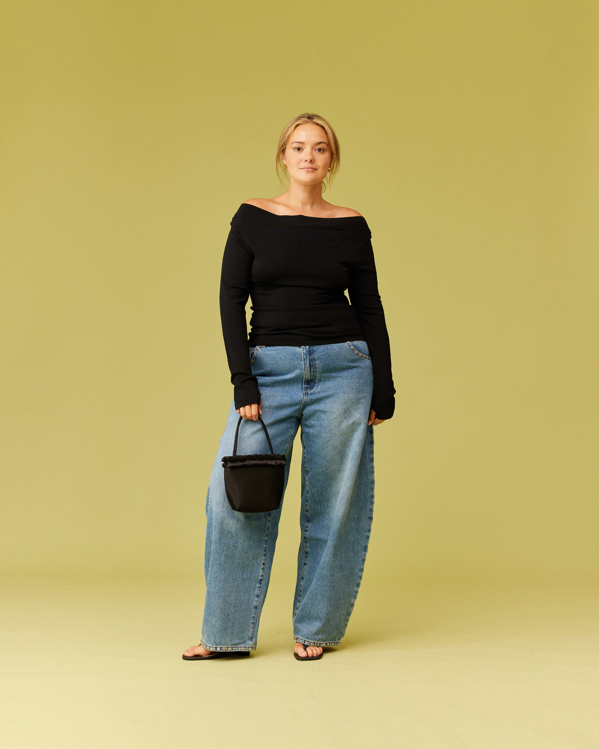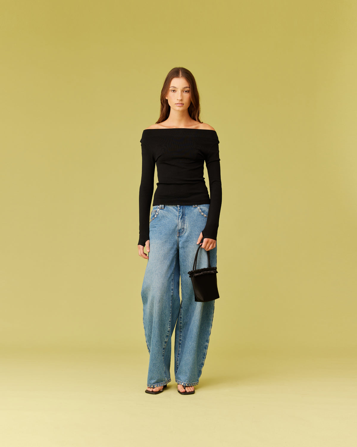 Off-shoulder long sleeve knitted top crafted in a black mid-weight knit. This top is simple yet elegant and can be worn on or off the shoulder.