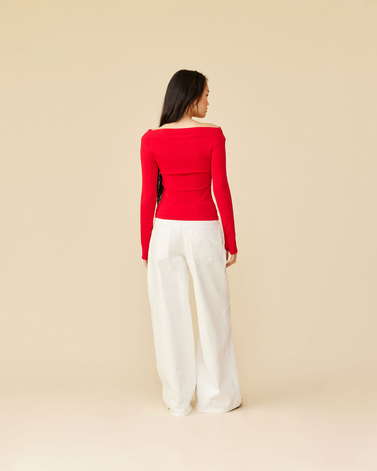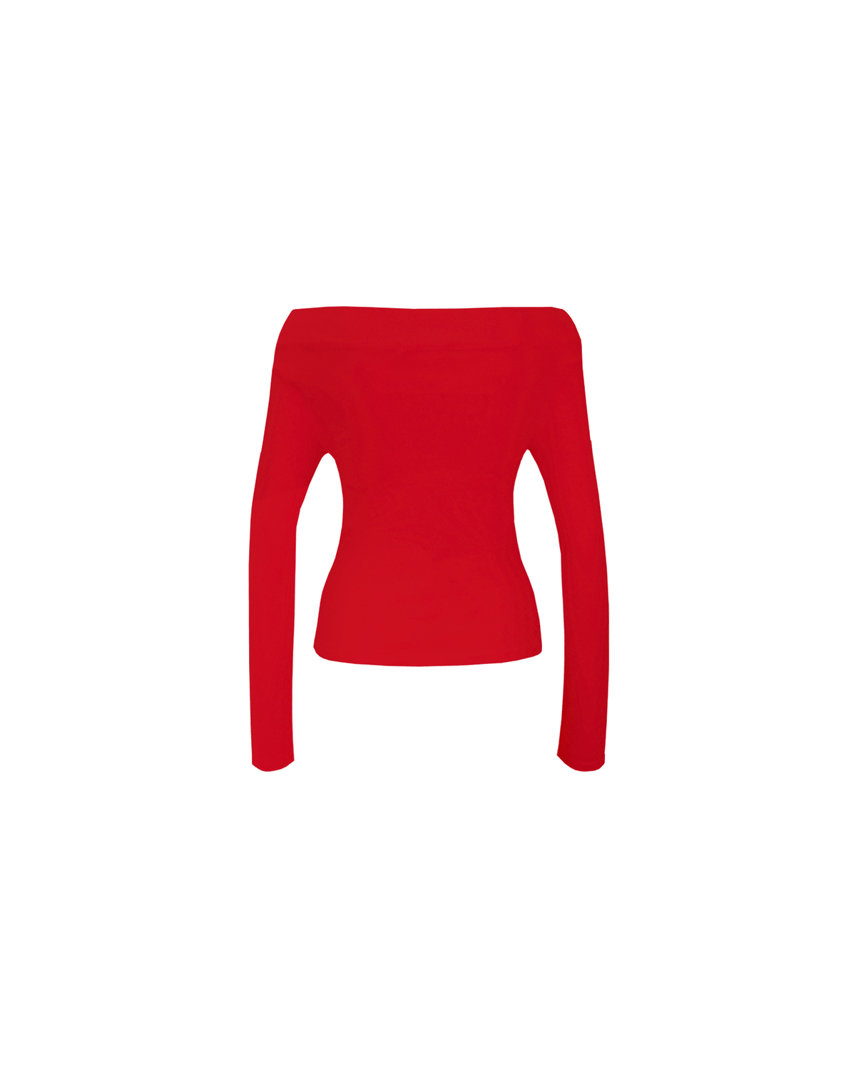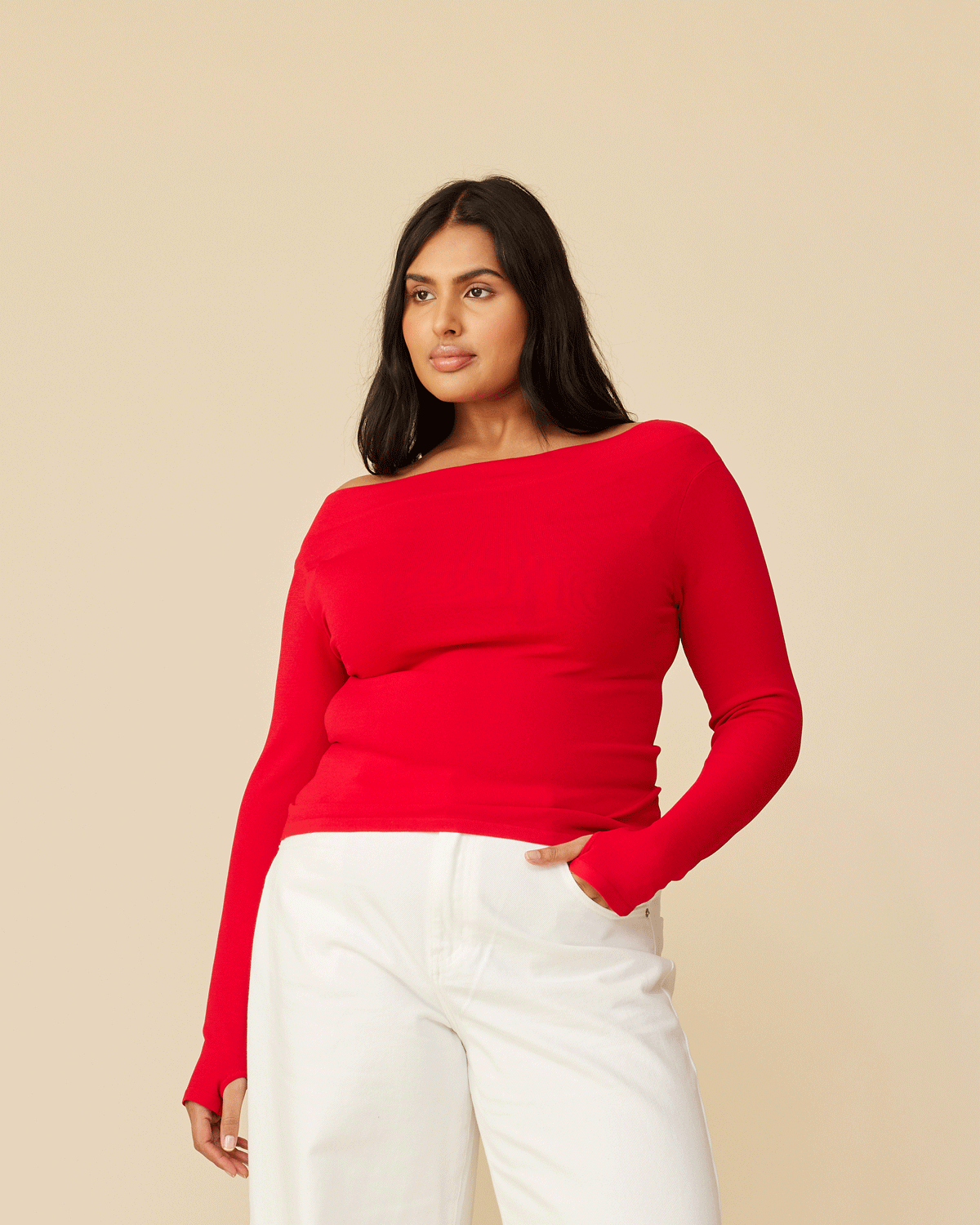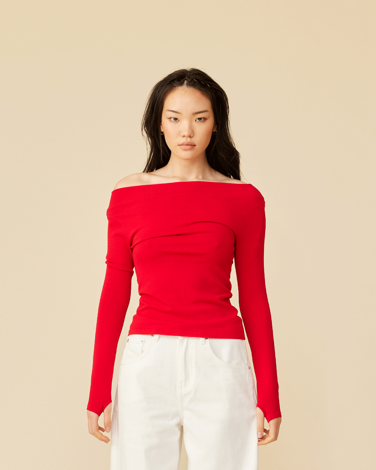 Off-shoulder long sleeve knitted top crafted in a cherry red mid-weight knit. This top is simple yet elegant and can be worn on or off the shoulder.